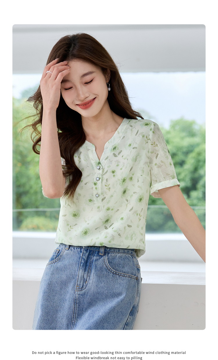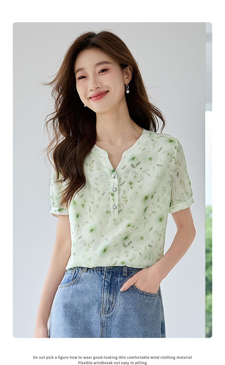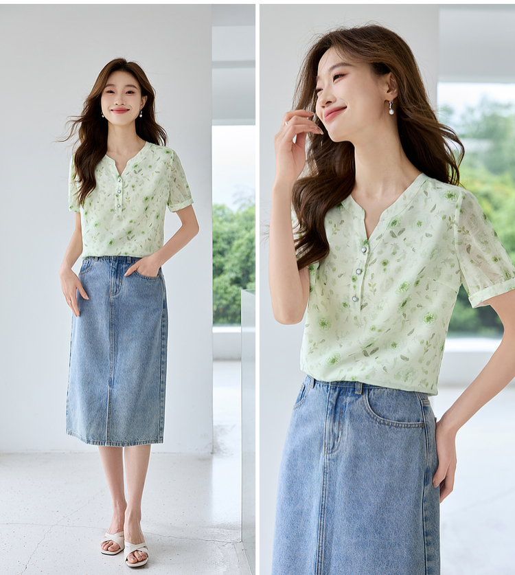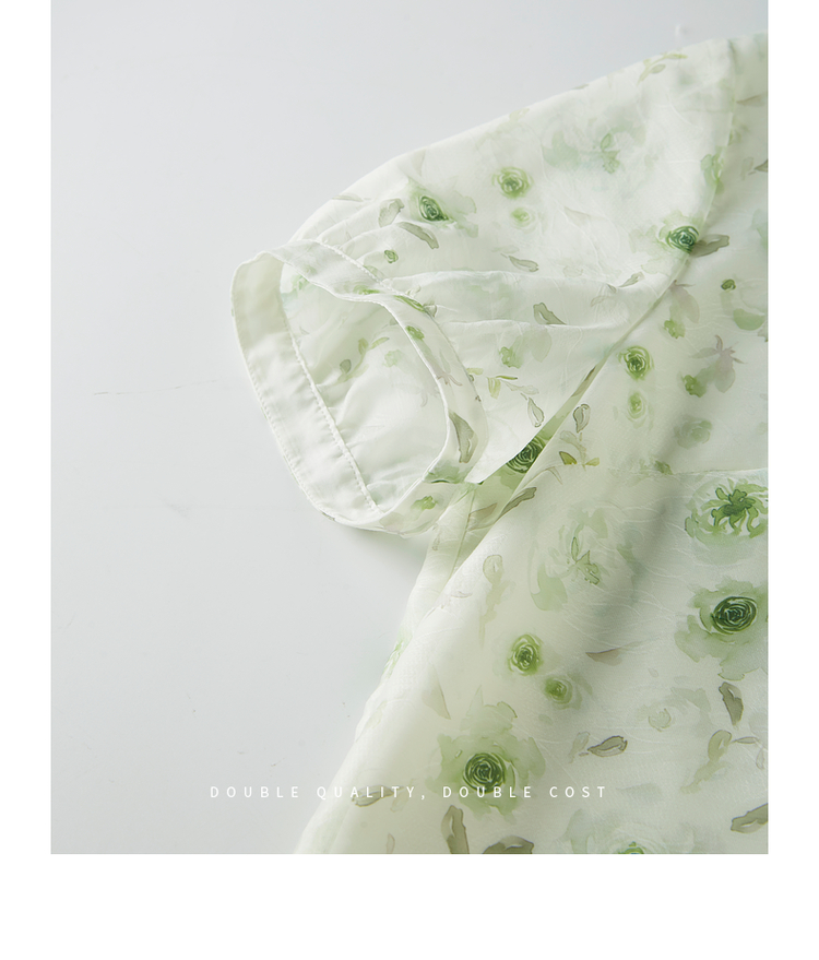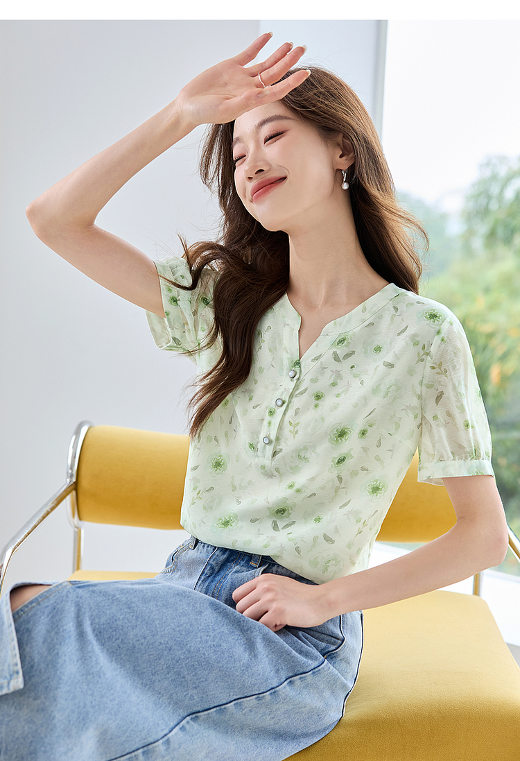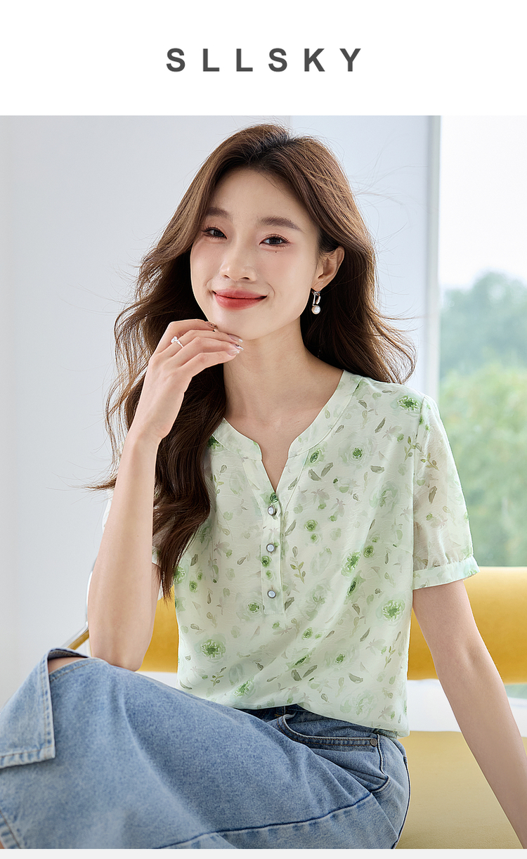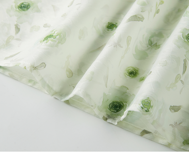 【专属特价】熙世界2025夏季新款薄荷曼波碎花雪纺衬衫女法式泡泡袖绿色小衫