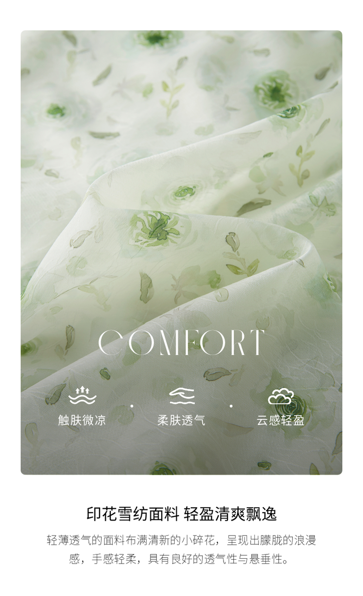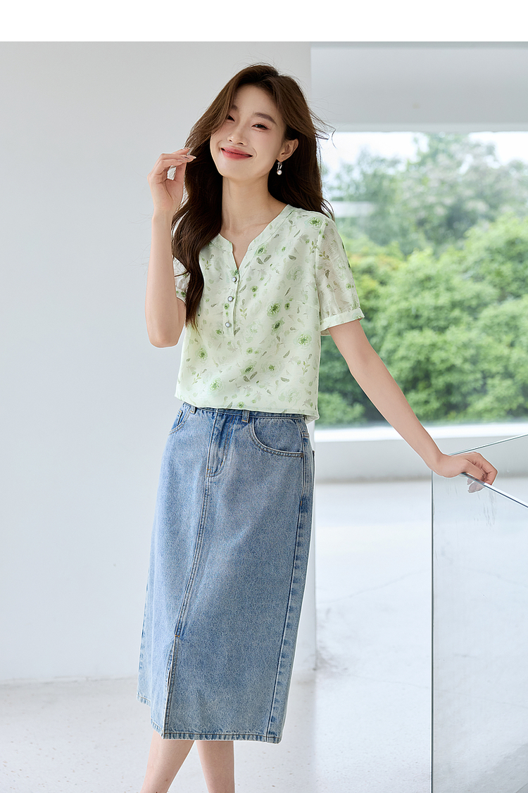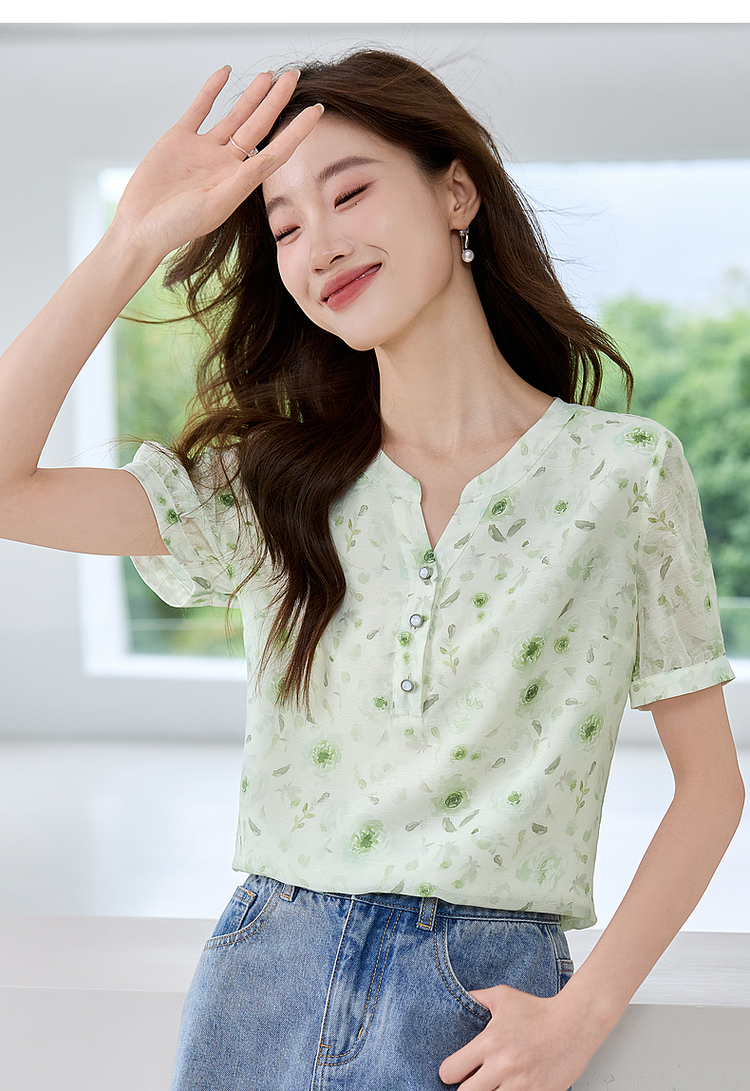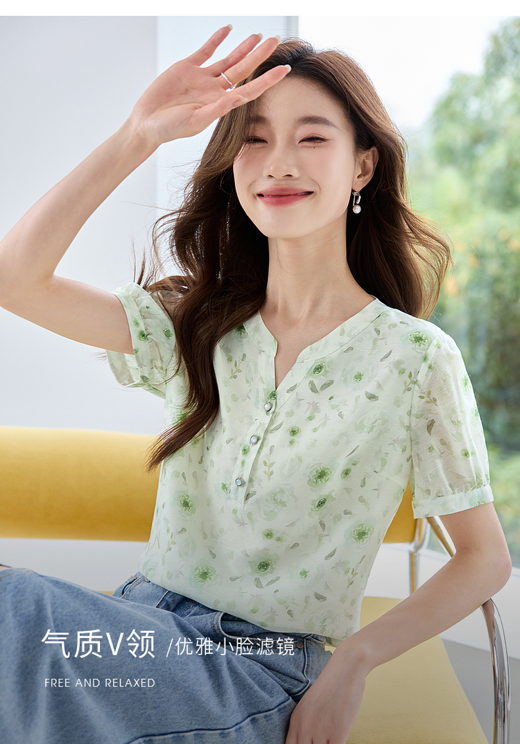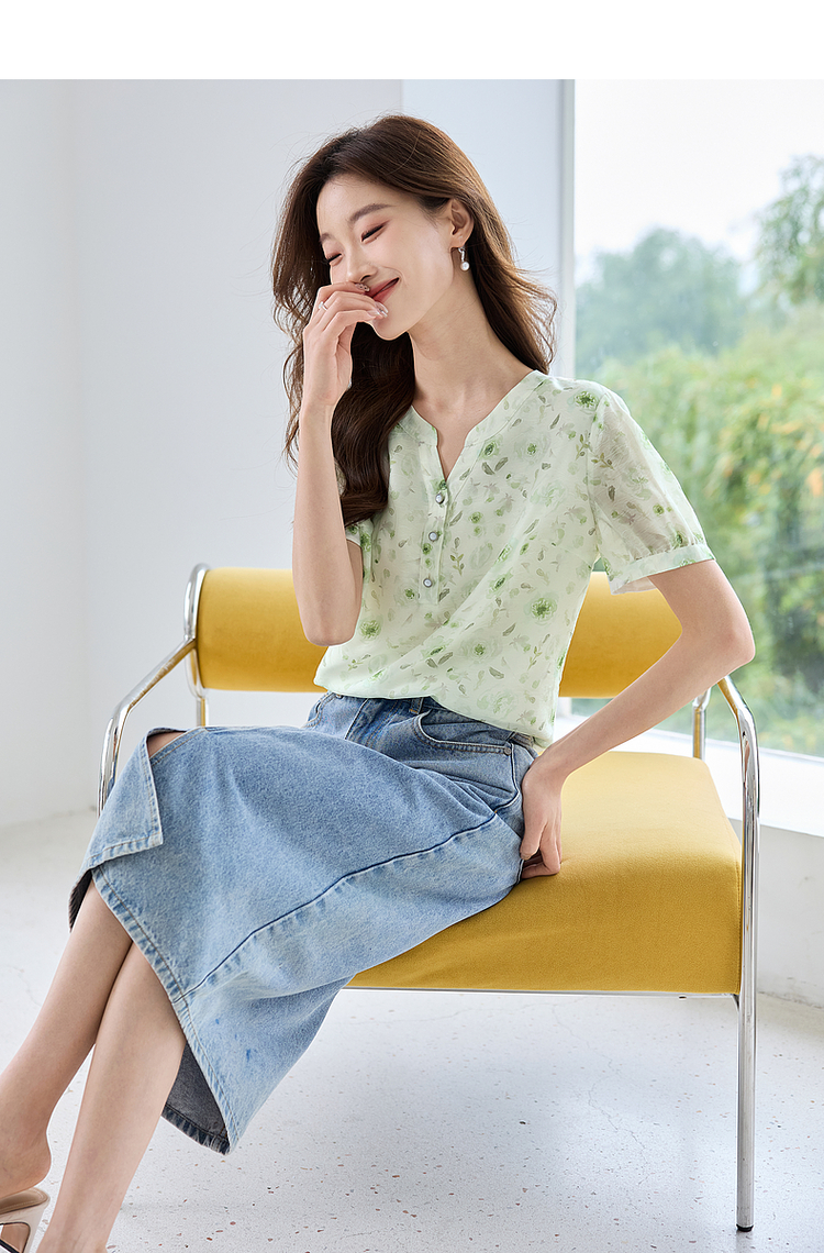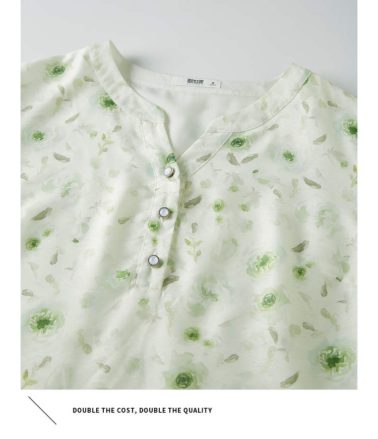 【专属特价】熙世界2025夏季新款薄荷曼波碎花雪纺衬衫女法式泡泡袖绿色小衫