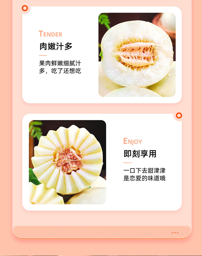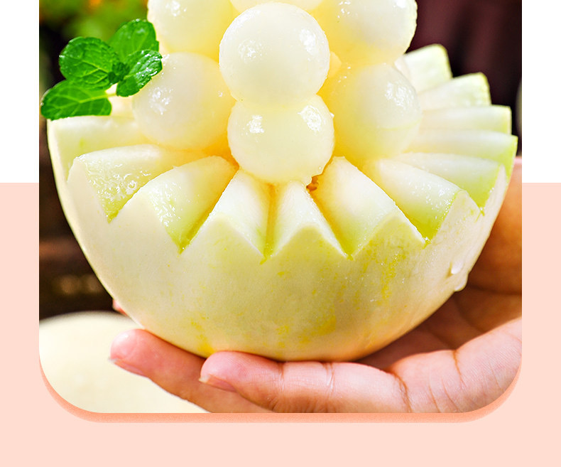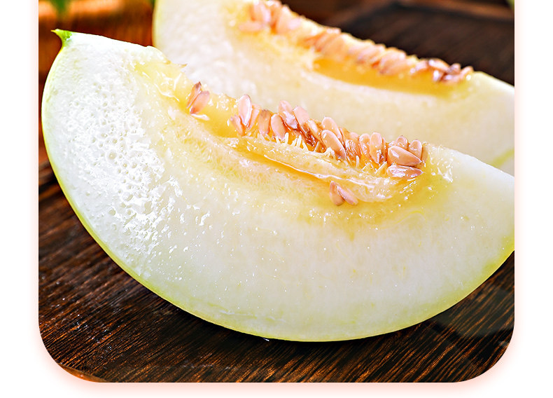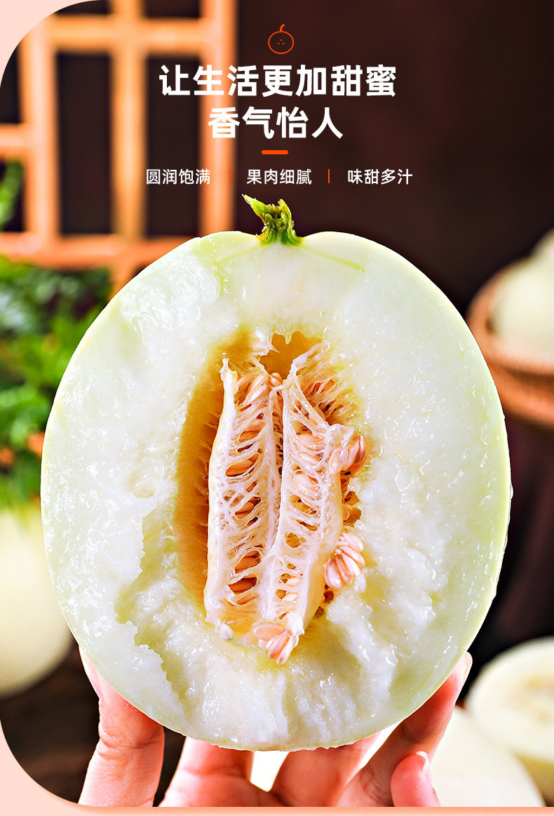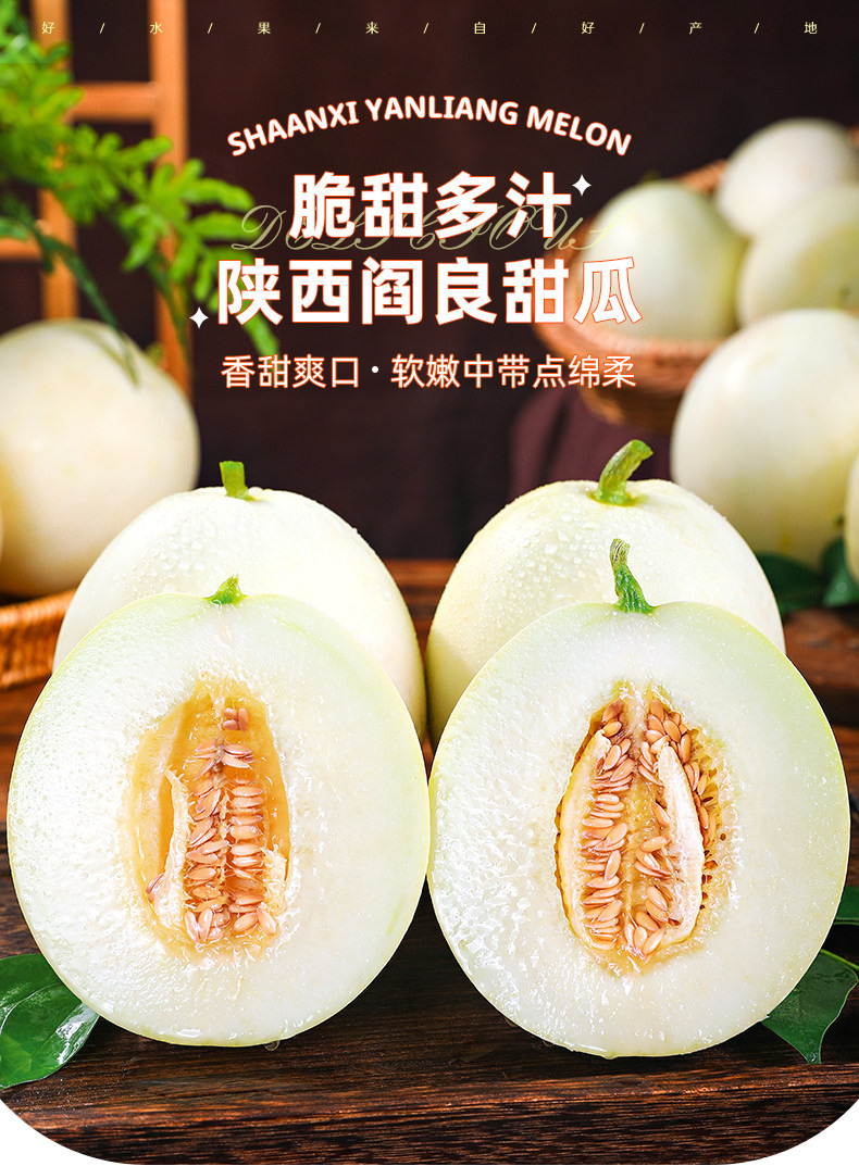 【阎良甜瓜】 脆甜多汁 细腻柔滑 饱满清香的果肉细嫩香甜,汁水充足,肉厚饱满【果期至六月】