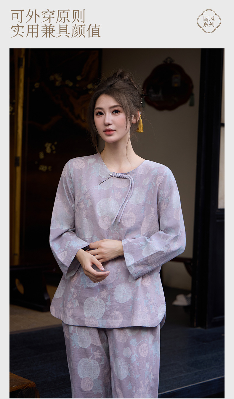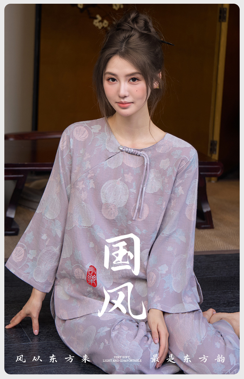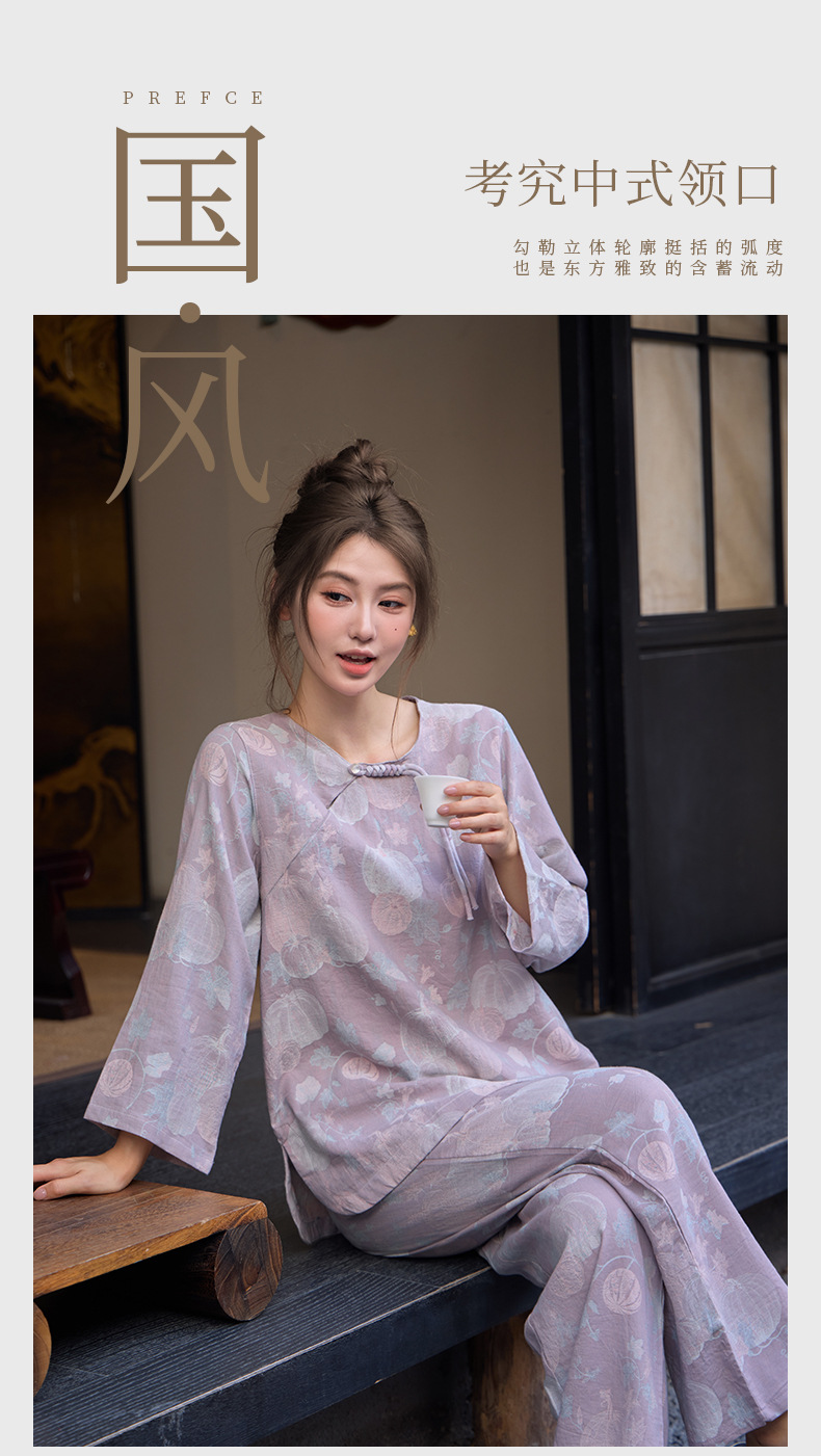 【新中式色织纯棉双纱套头睡衣】春夏季薄款九分袖可外穿家居服