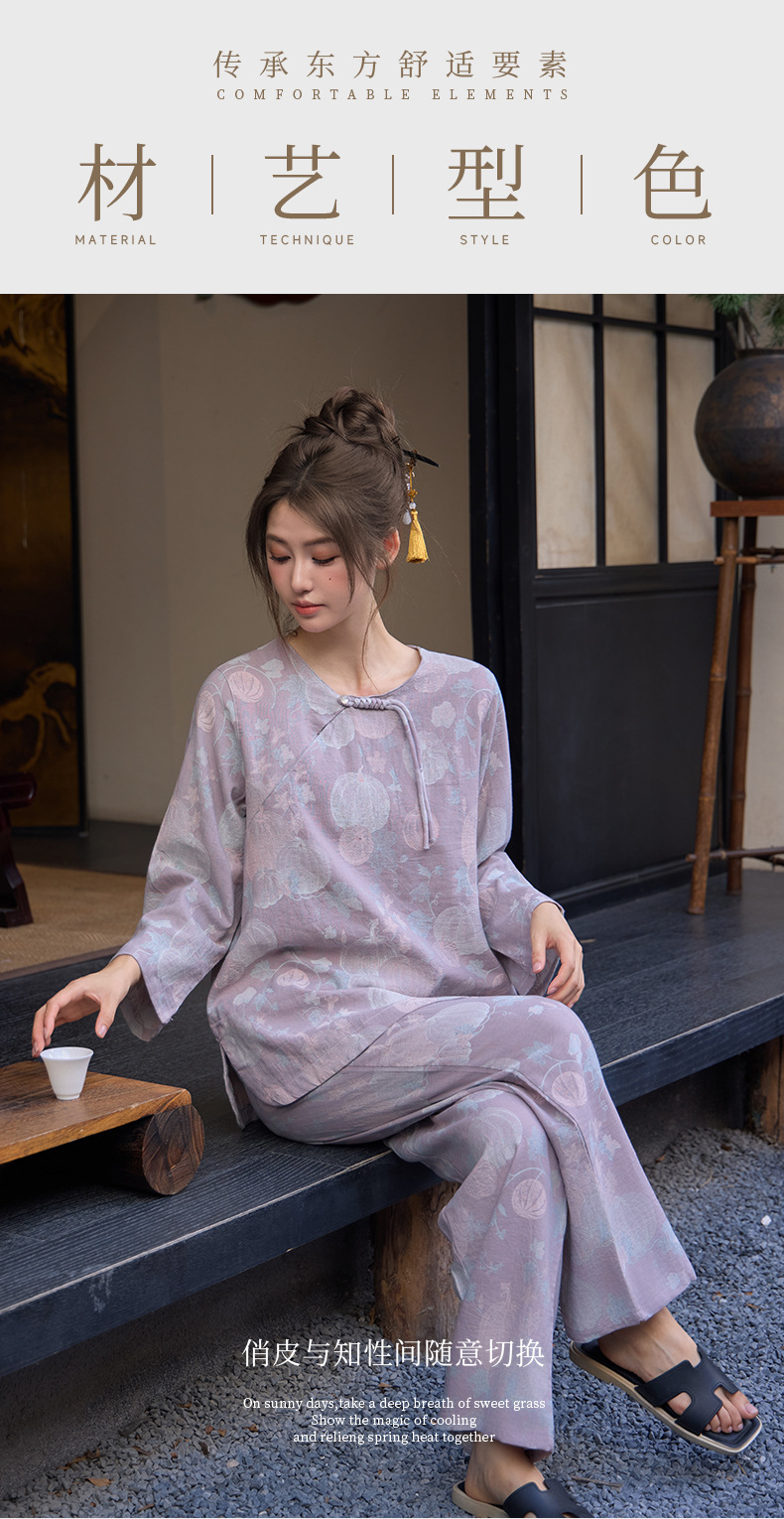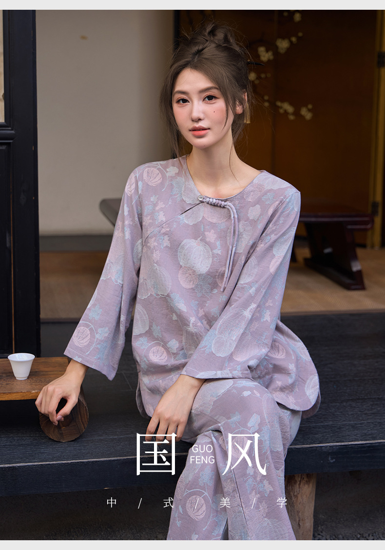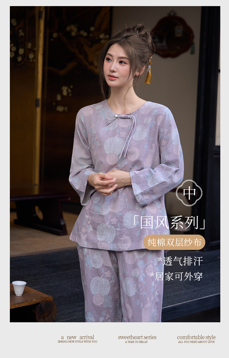 【新中式色织纯棉双纱套头睡衣】春夏季薄款九分袖可外穿家居服