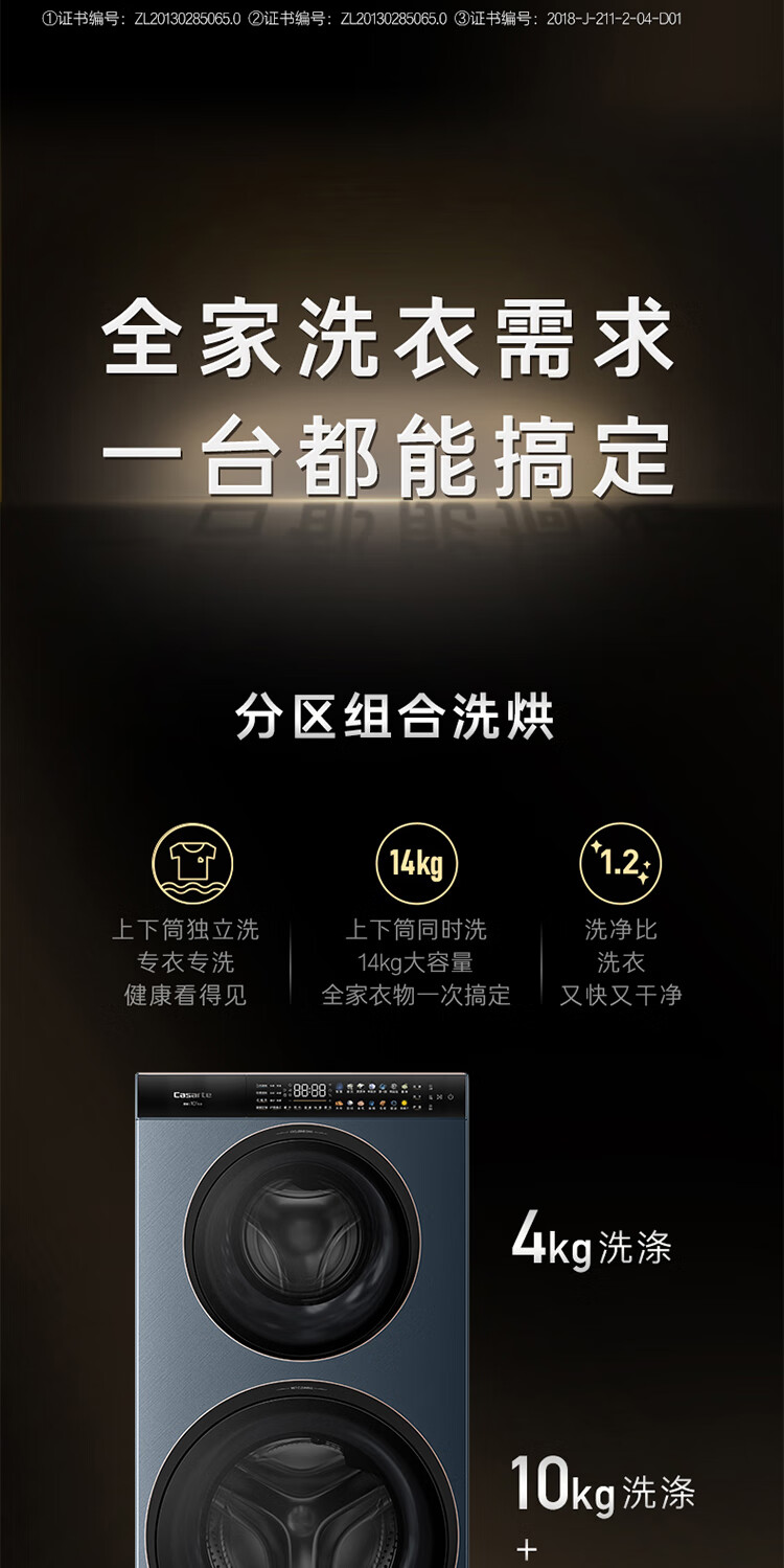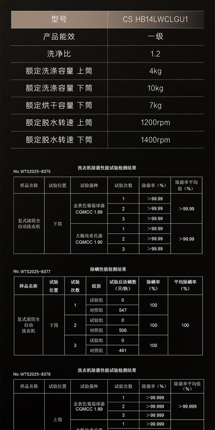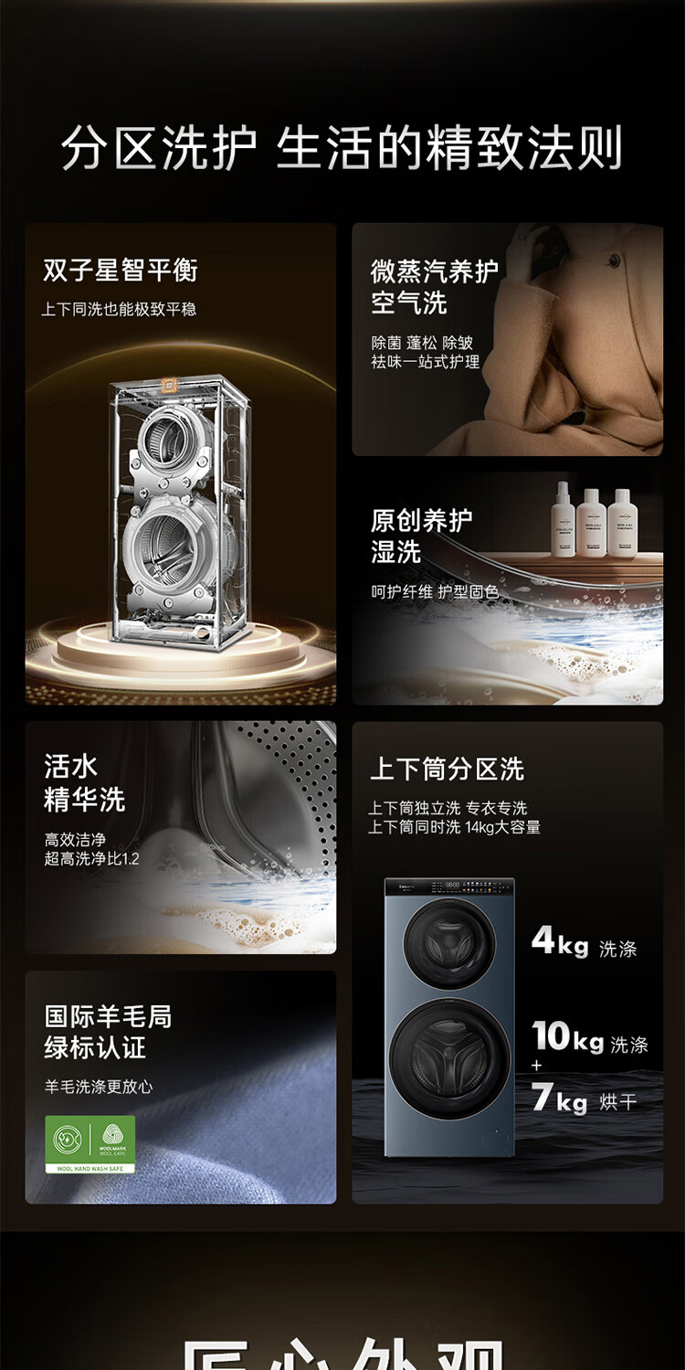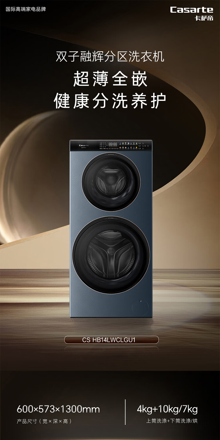 卡萨帝14公斤双子滚筒洗衣机 洗烘一体机 养护湿洗 精华洗 羊毛绿标 UVC紫外除菌螨 95°烫烫净 14公斤分区洗烘一体CS HB14LWCLGU1