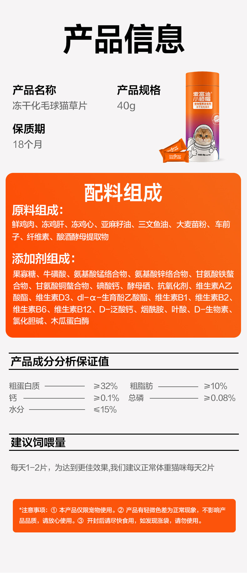 麦富迪小橙帽猫咪冻干化毛球片40g成幼猫化毛膏温和排去毛吐毛球