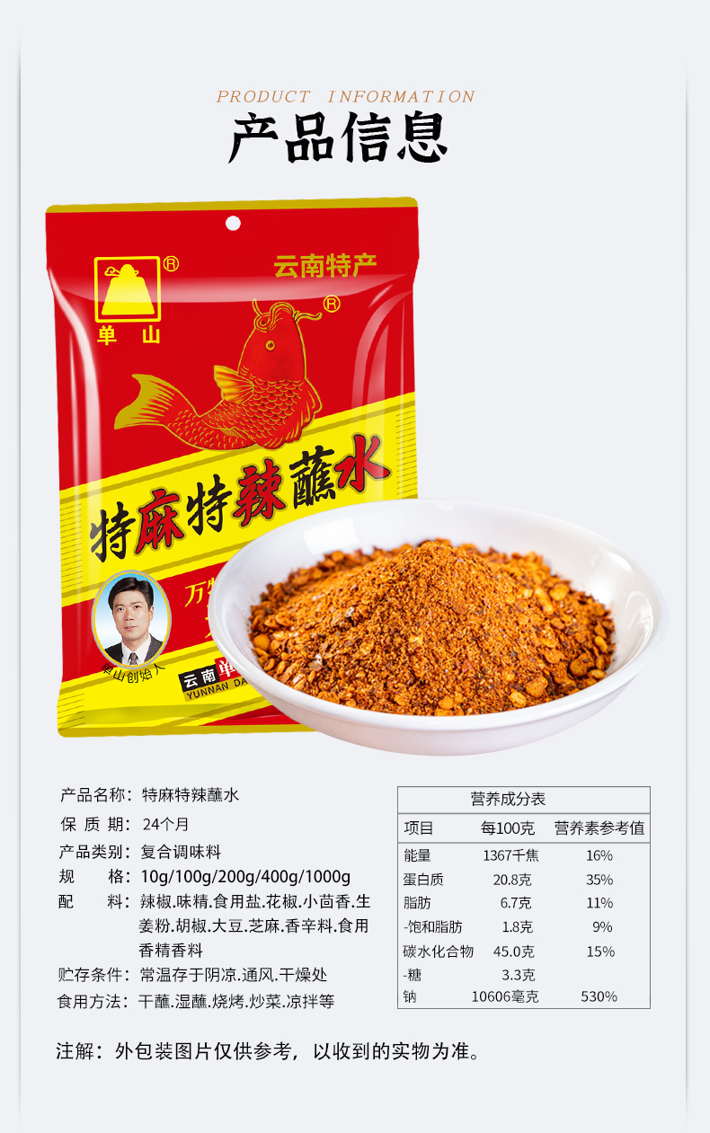 云南特产单山特麻特辣单山蘸水辣椒面400g*2 50g*4 50g*2袋烧烤火锅蘸料红油泼辣子面