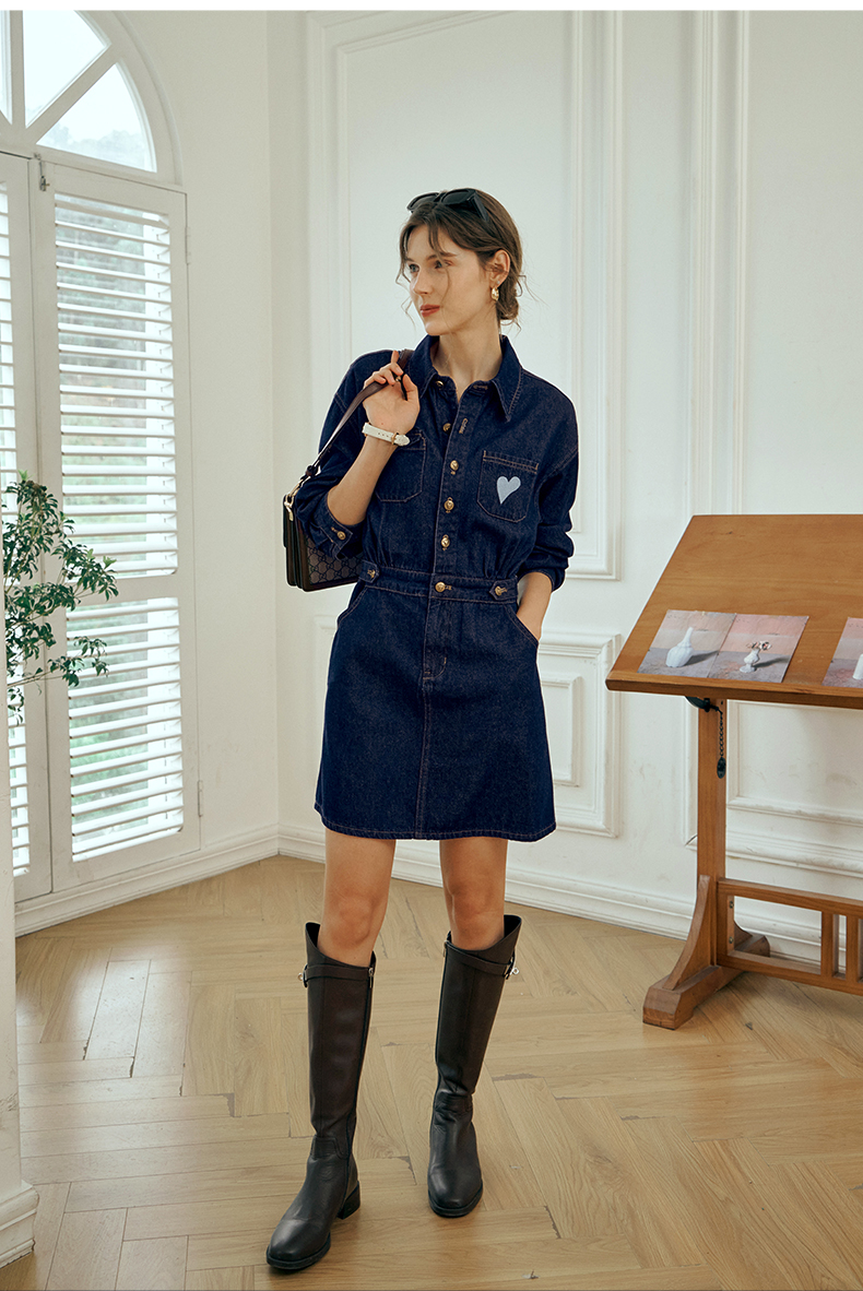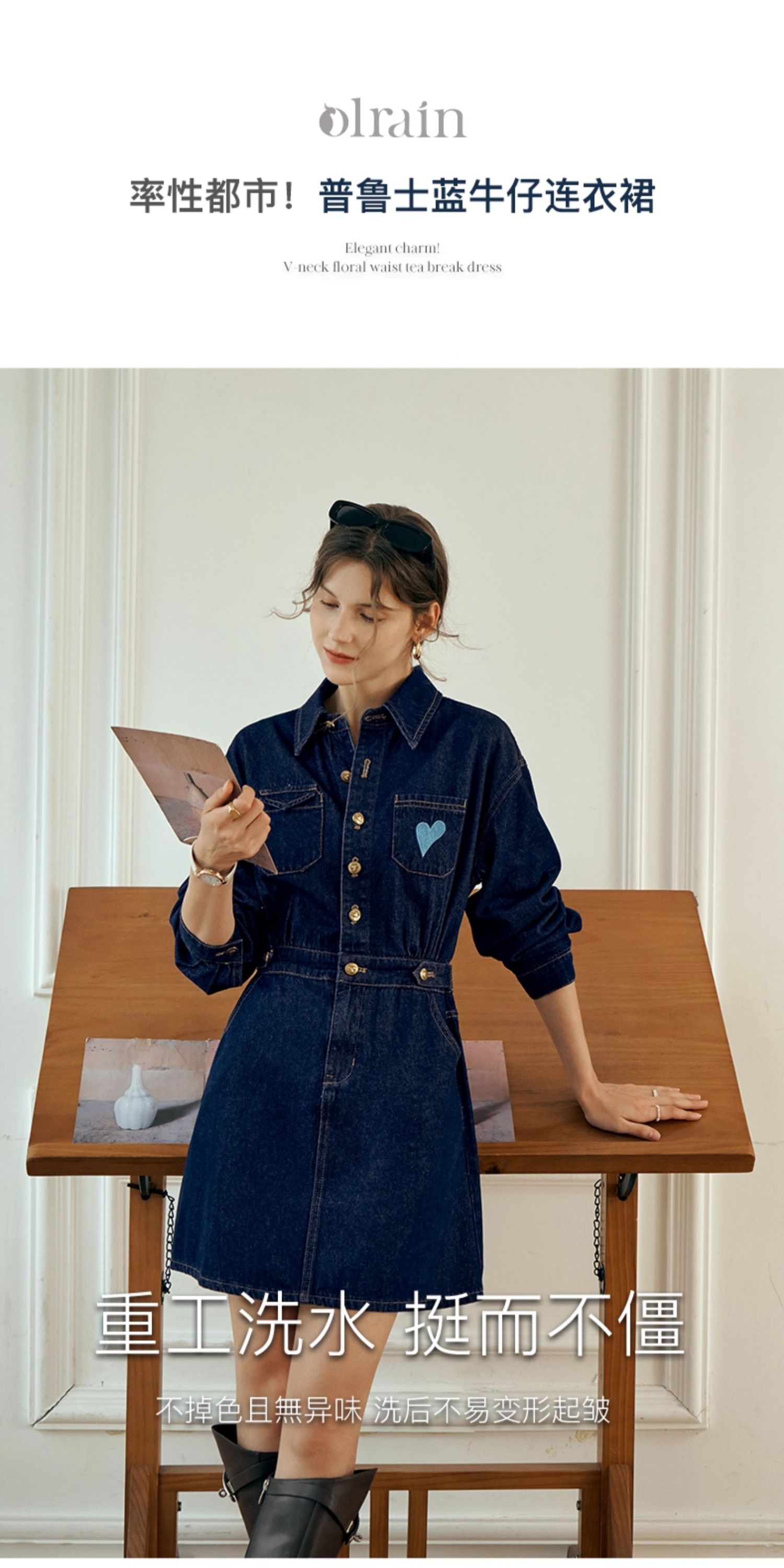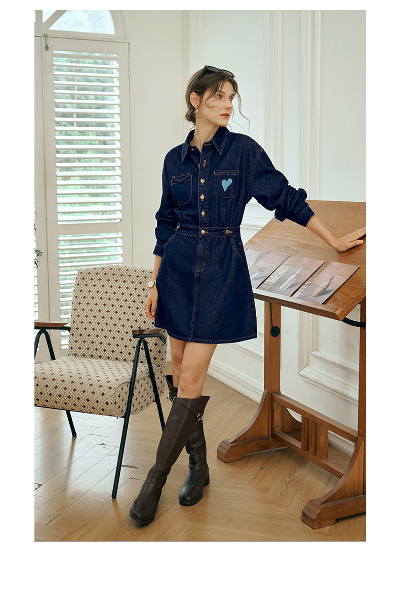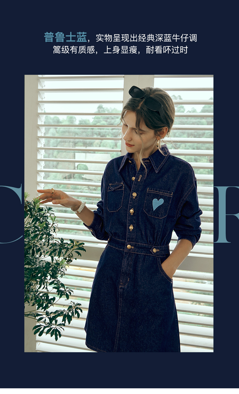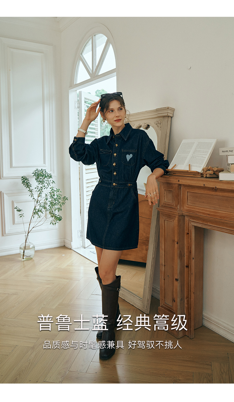 OLrain欧芮儿秋季2025年新款刺绣洗水收腰中长款长袖牛仔连衣裙女