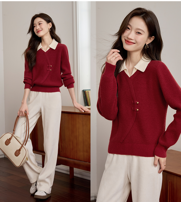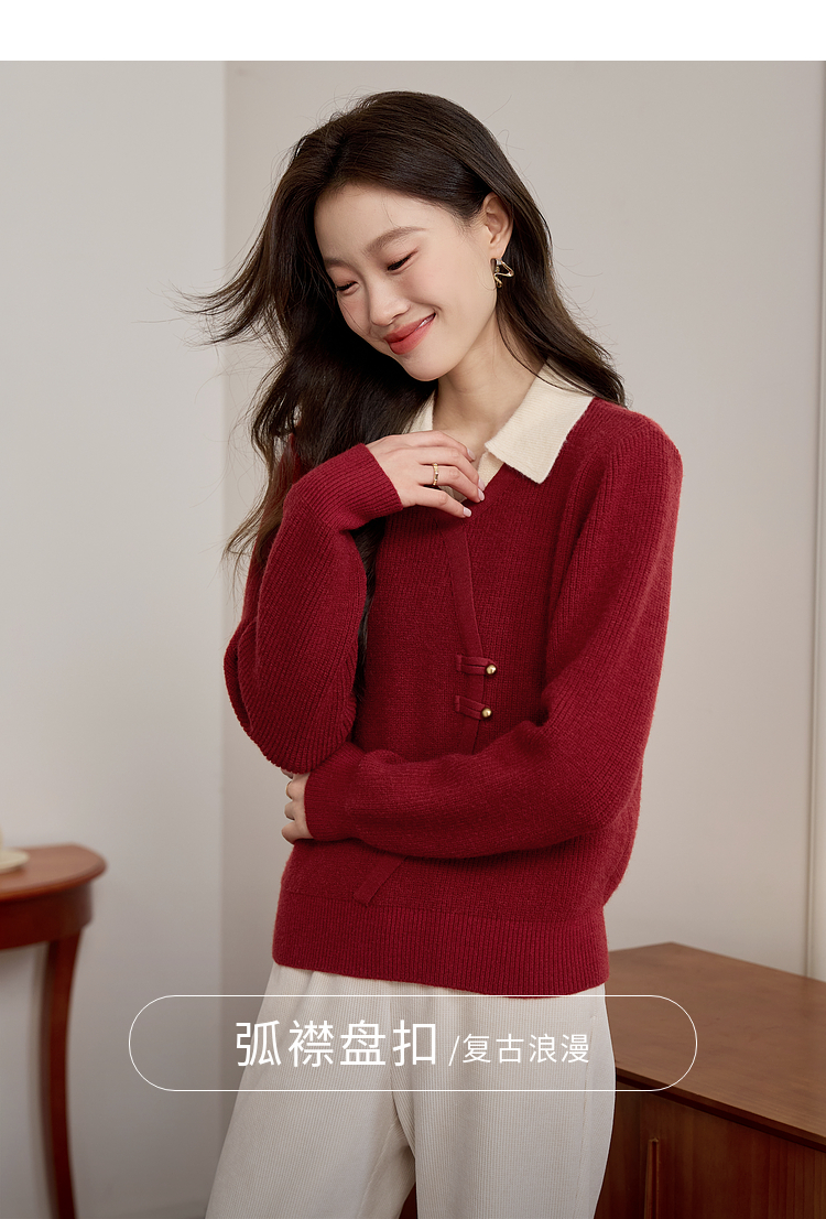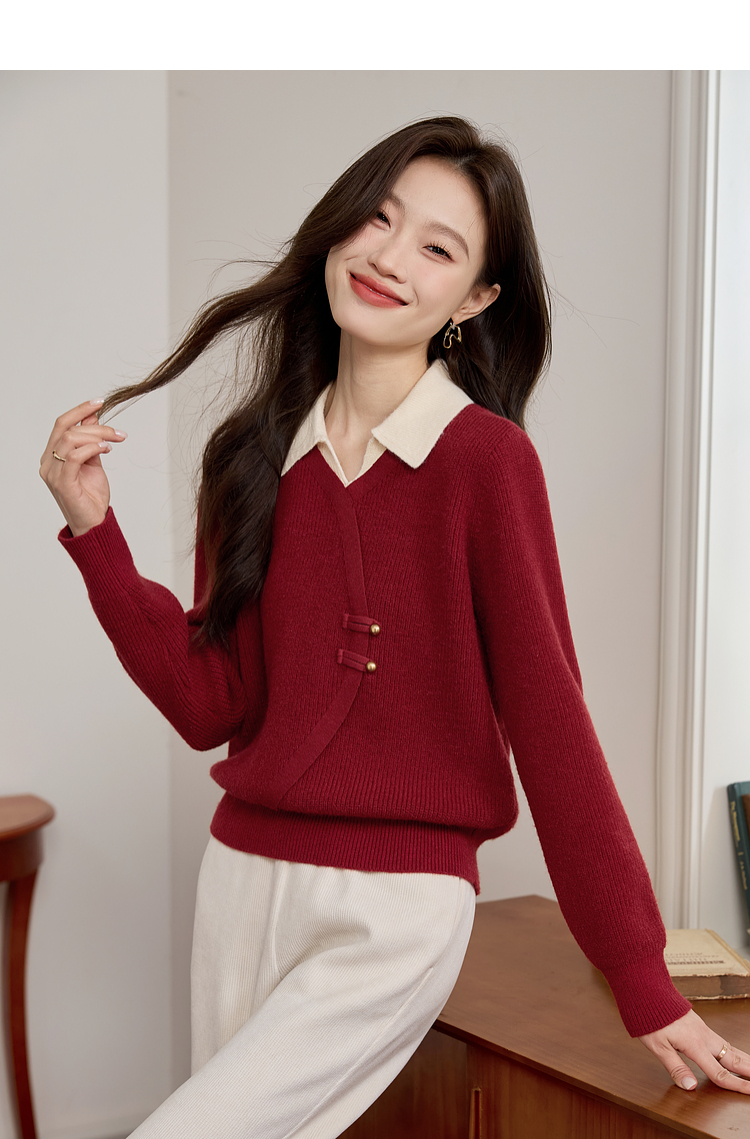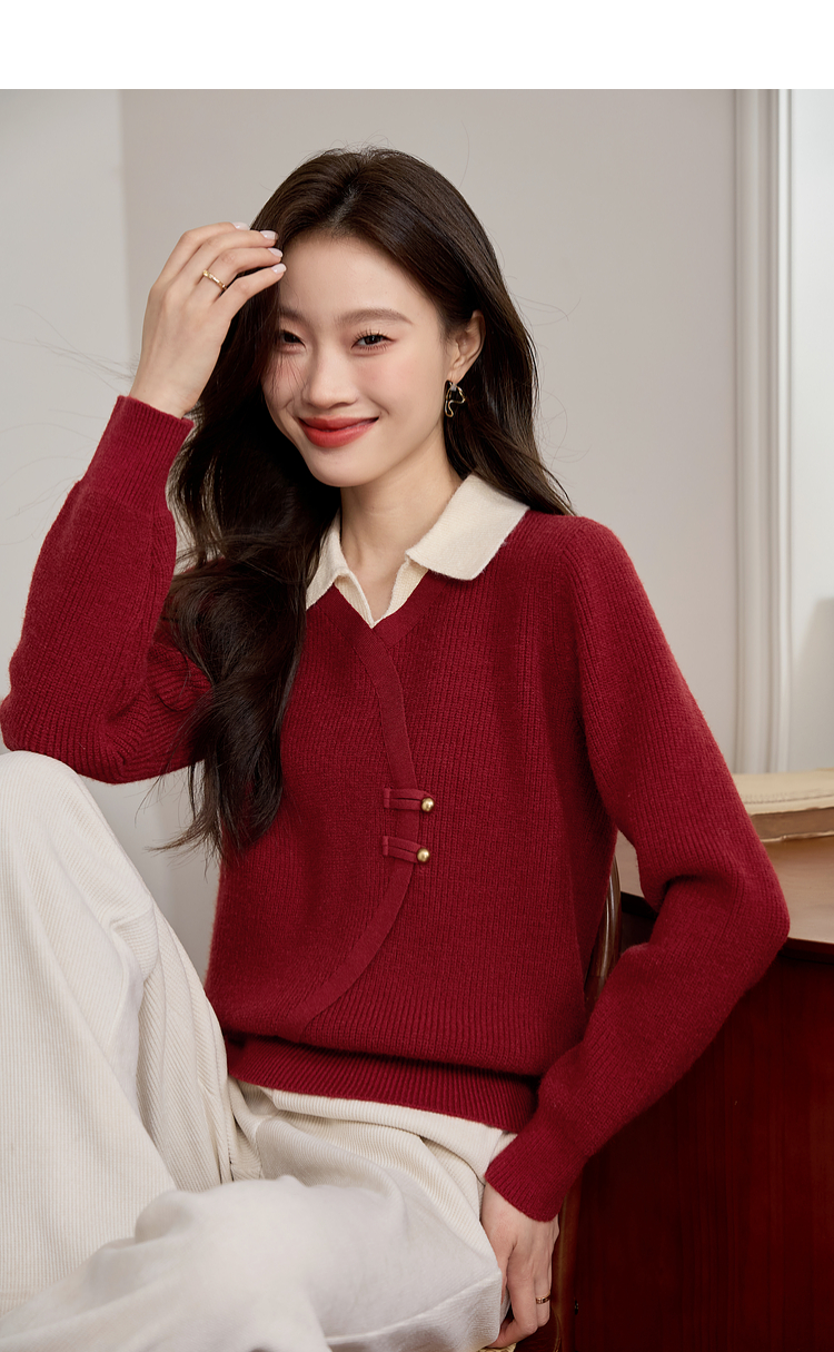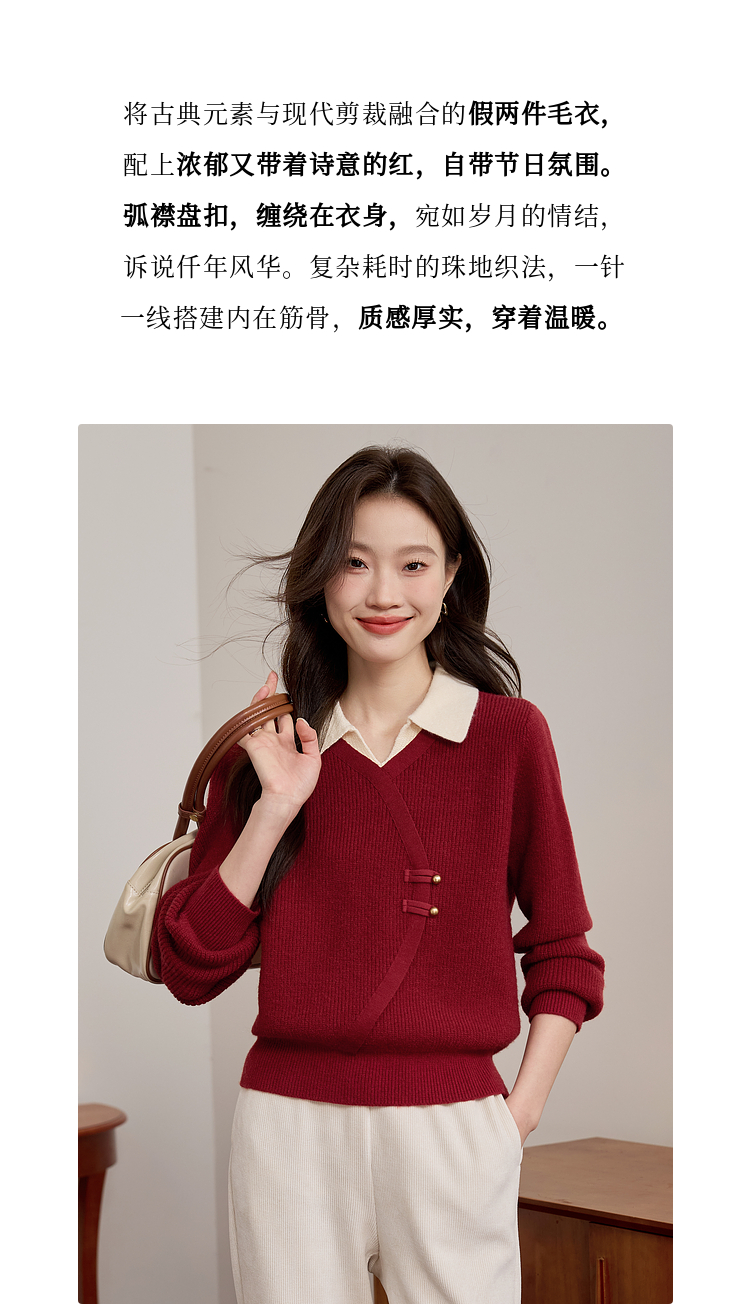 【年终特卖】熙世界新中式国风假两件针织毛衣女秋冬气质复古红色翻领打底上衣