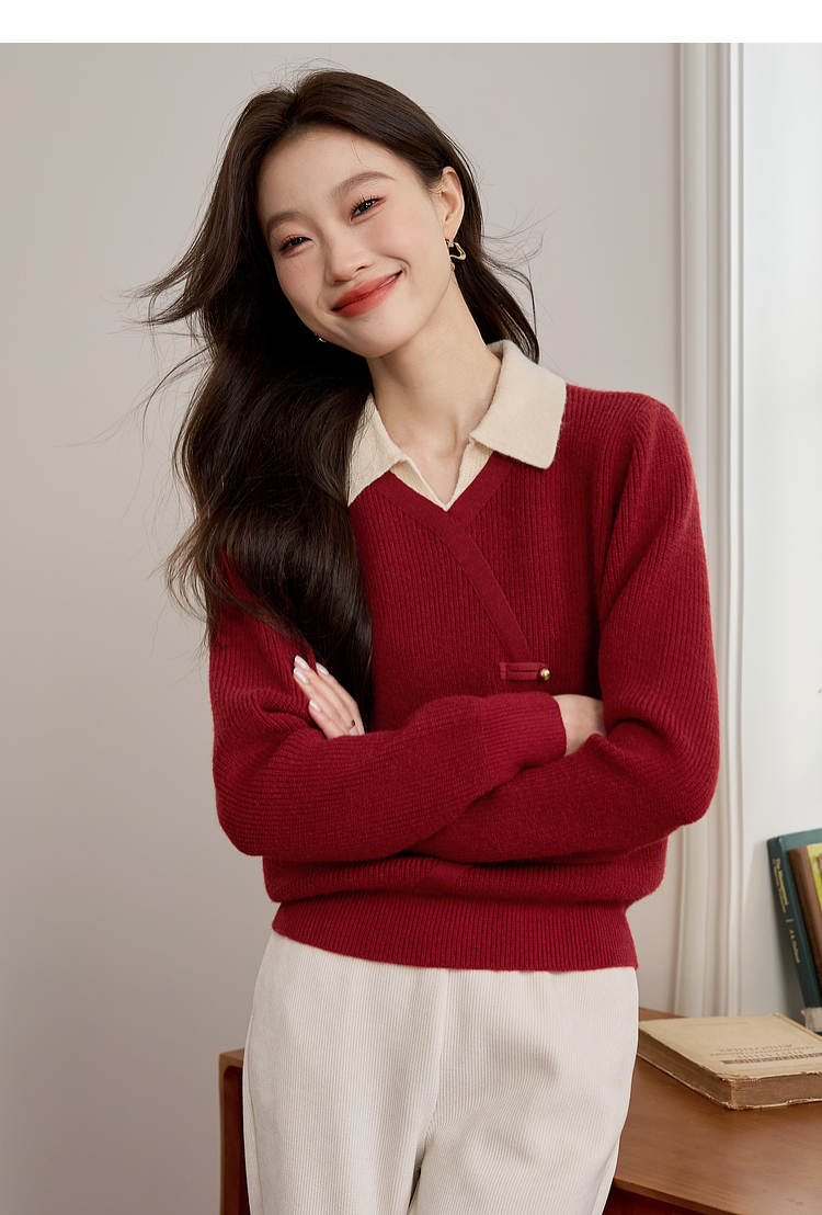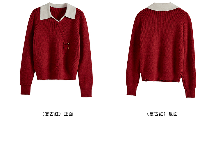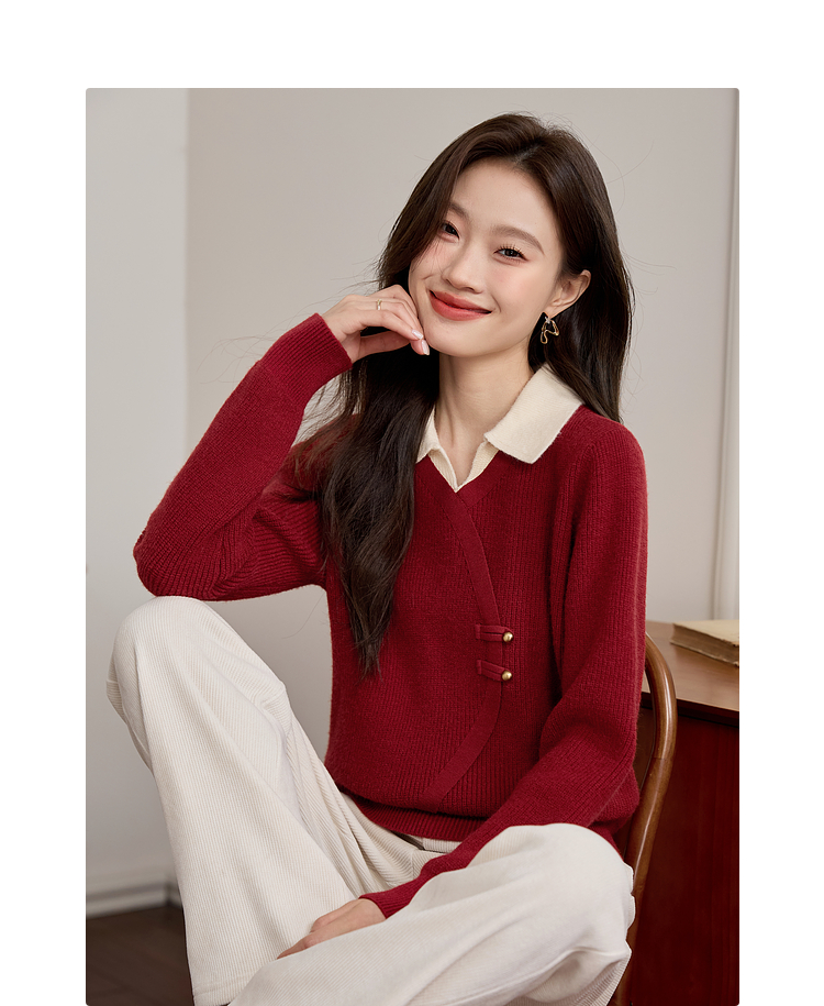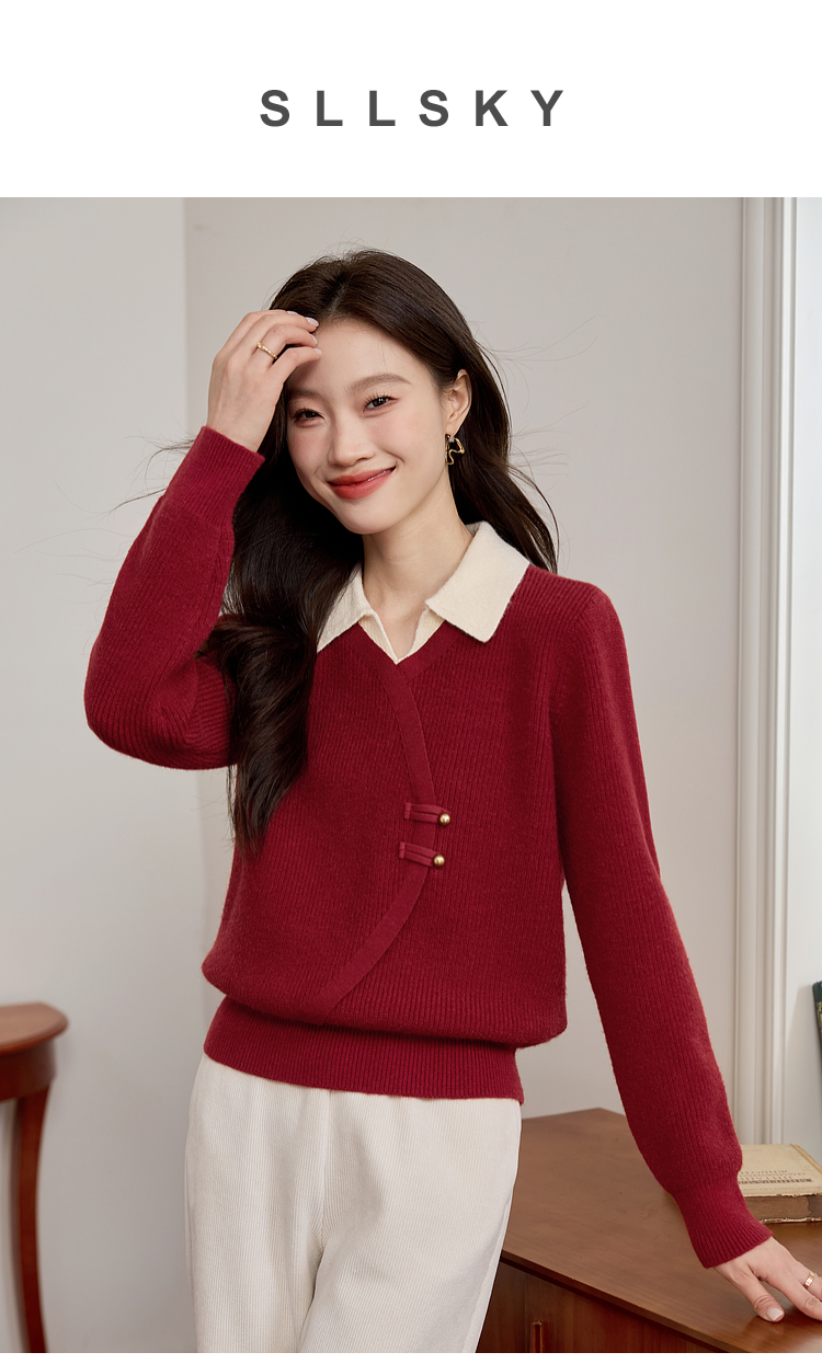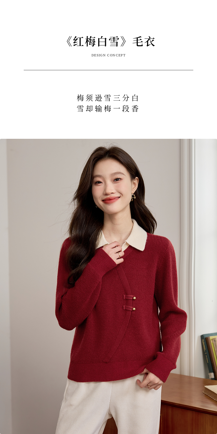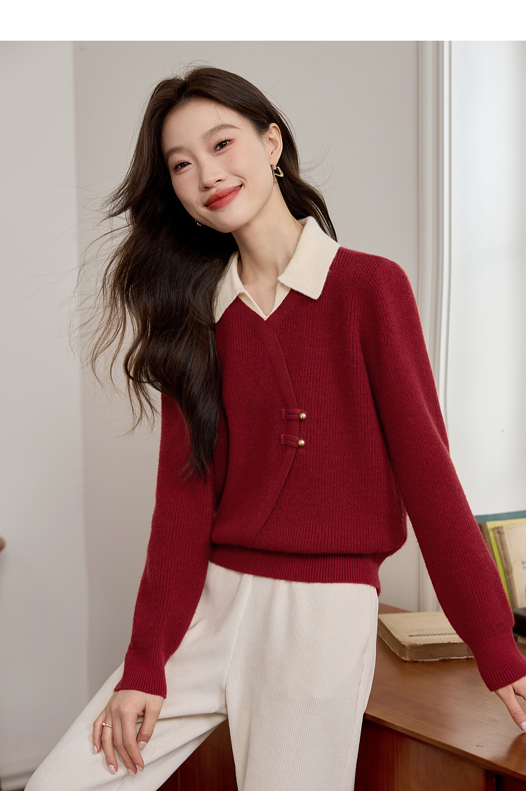 【年终特卖】熙世界新中式国风假两件针织毛衣女秋冬气质复古红色翻领打底上衣