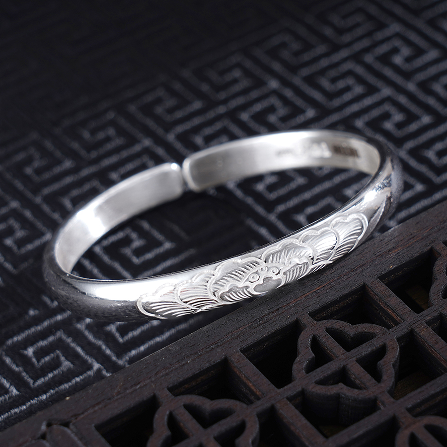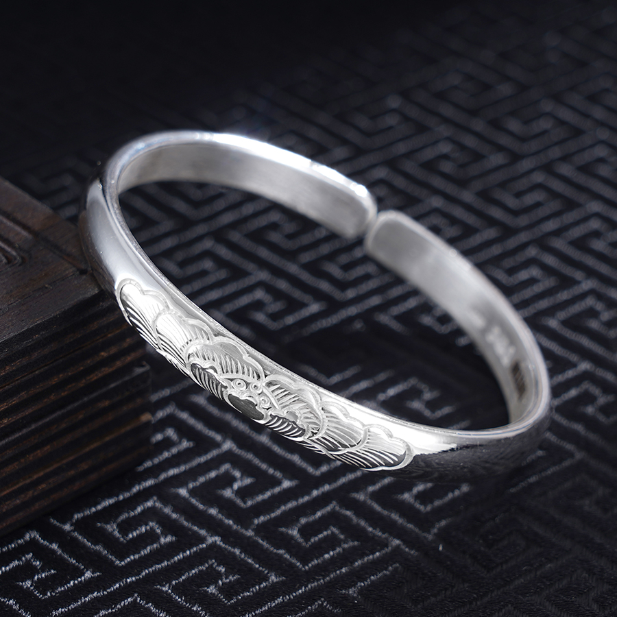 【寓意】:纯银开口手镯,镯面錾刻莲花图案。花瓣纹理细腻,灵动之感扑面而来,寓意纤尘不染,静享美好流年。