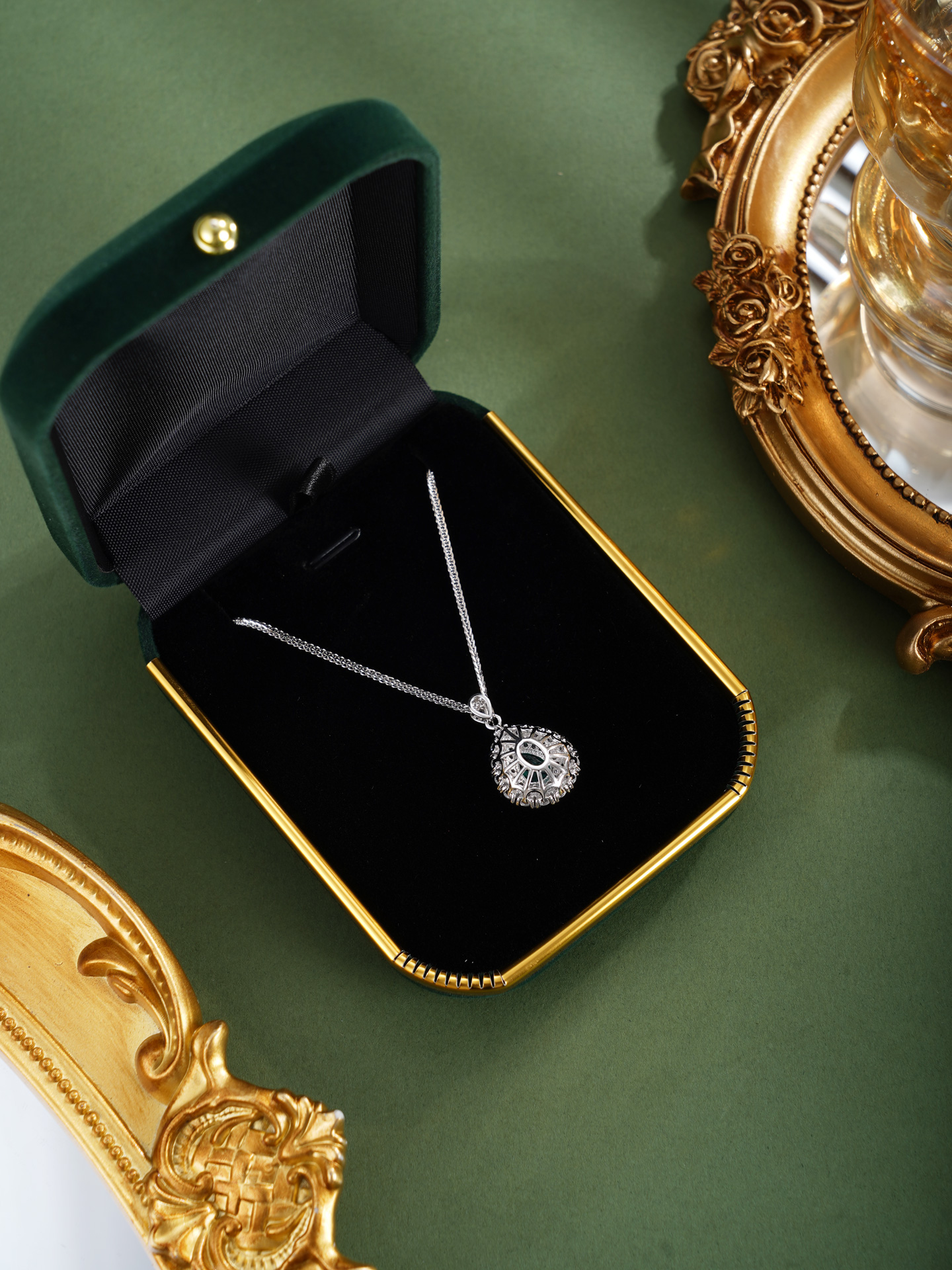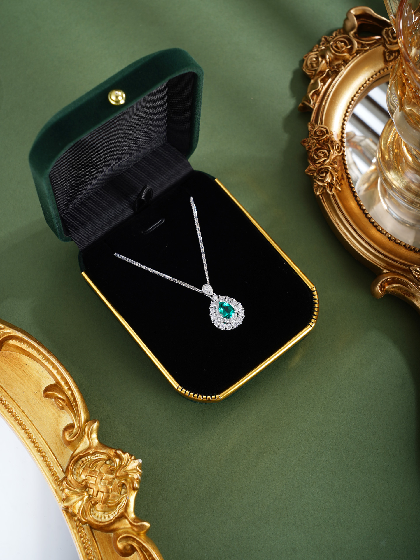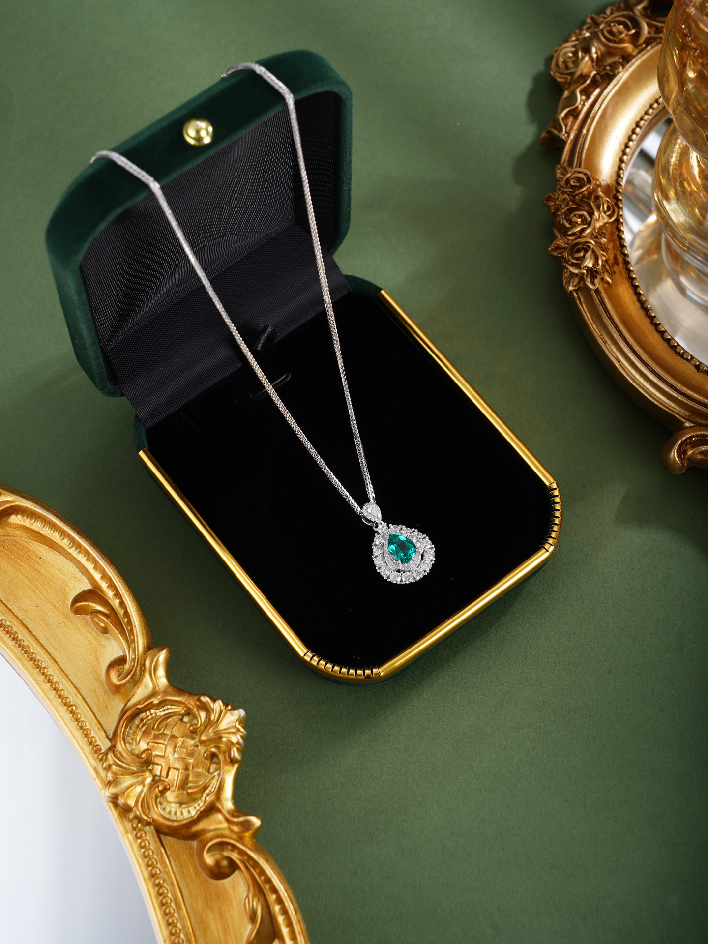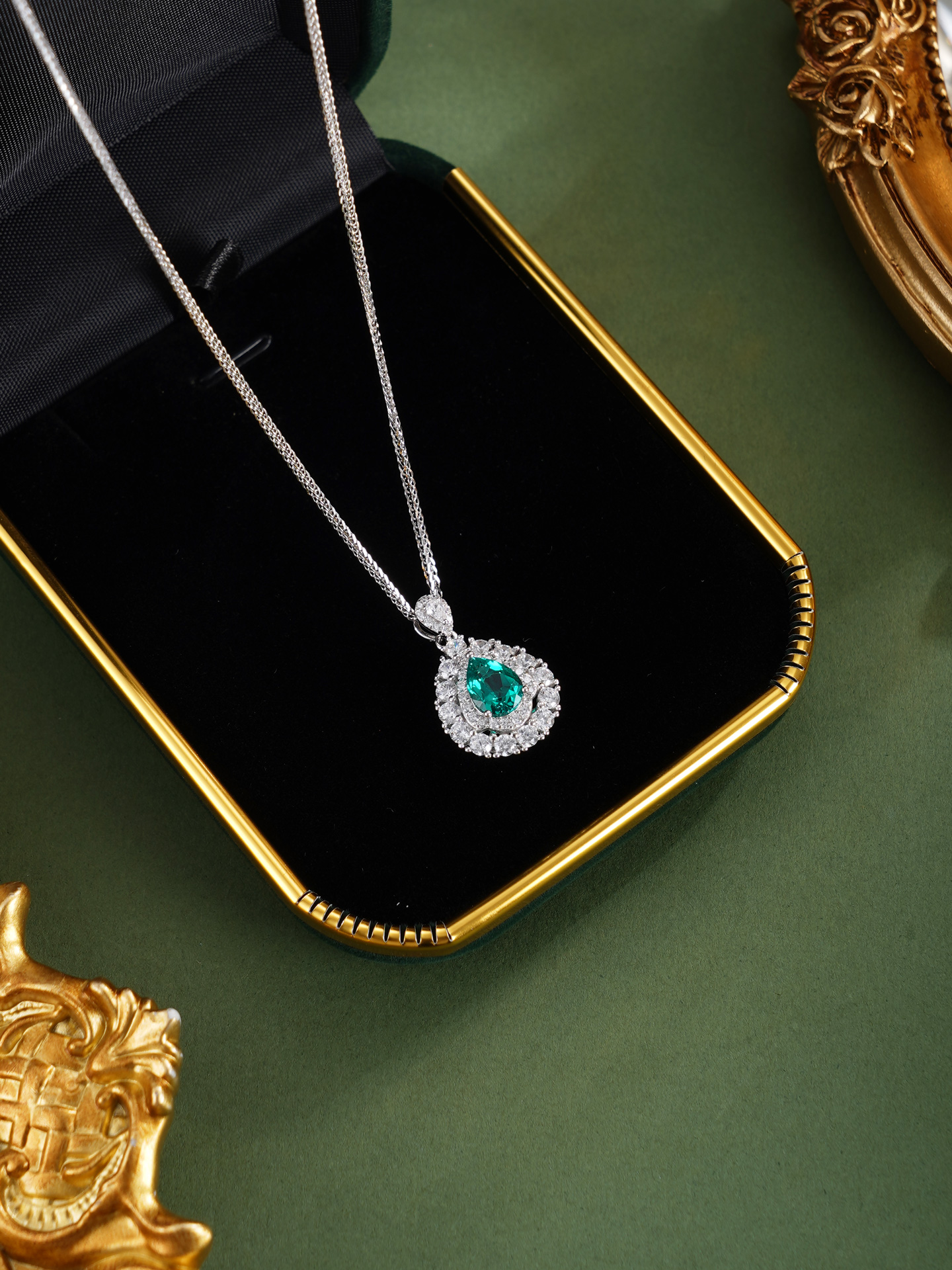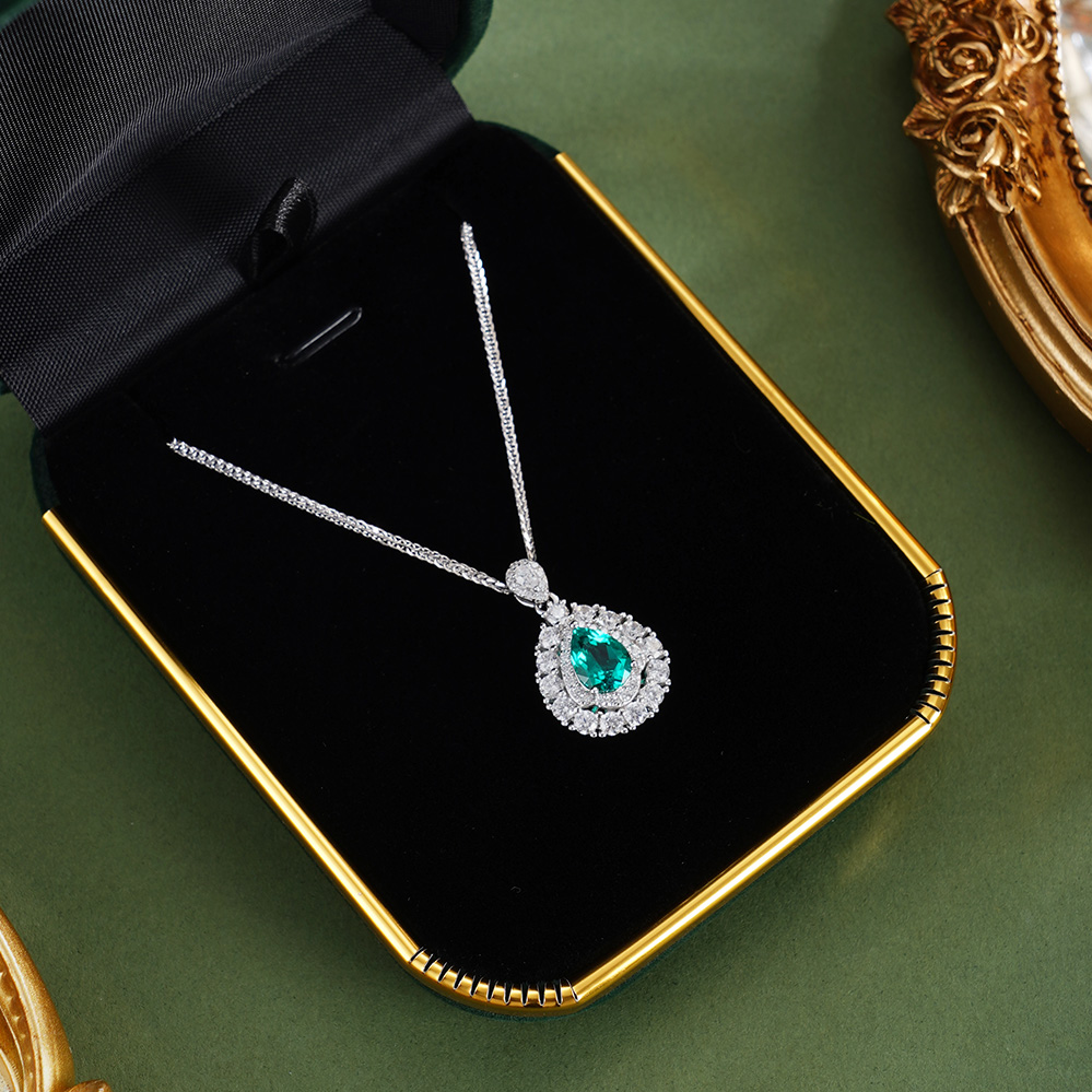【寓意】:以纯银精铸水滴形吊坠,白色锆石搭配祖母绿错落镶嵌,在光晕中流转着清新与灵动。寓意生机焕发、福运如春。