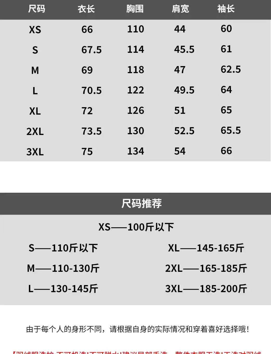 【颜色】2818黑色,2818白色,2818灰色。2819黑色,2819白色,2819灰色【短款尺码】XS(100斤以内 充绒量183),S(110斤以内 充绒量189),M(130斤以内 充绒量196),L(145斤以内 充绒量205),XL(165斤以内 充绒量214),2XL(185斤以内 充绒量223),3XL(200斤以内 充绒量232)【长款尺码】XS(95斤以内 充绒量260),S(110斤以内 充绒量270),M(125斤以内 充绒量280),L(145斤以内 充绒量290),XL(1165斤以内),2XL(185斤以内),3XL(205斤以内)
