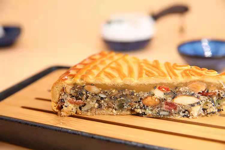 馅料:月饼专用粉、白砂糖、花生油、饮用水、黑芝麻、白芝麻、瓜子仁、果脯、冰