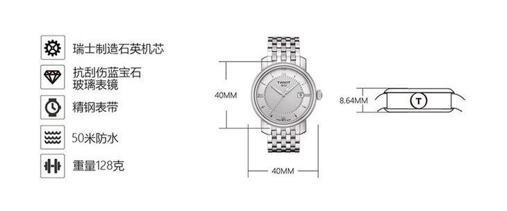 | 防水 | 50 m | 表带 | 精钢表链 按钮式蝴蝶扣 |