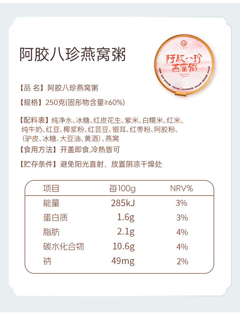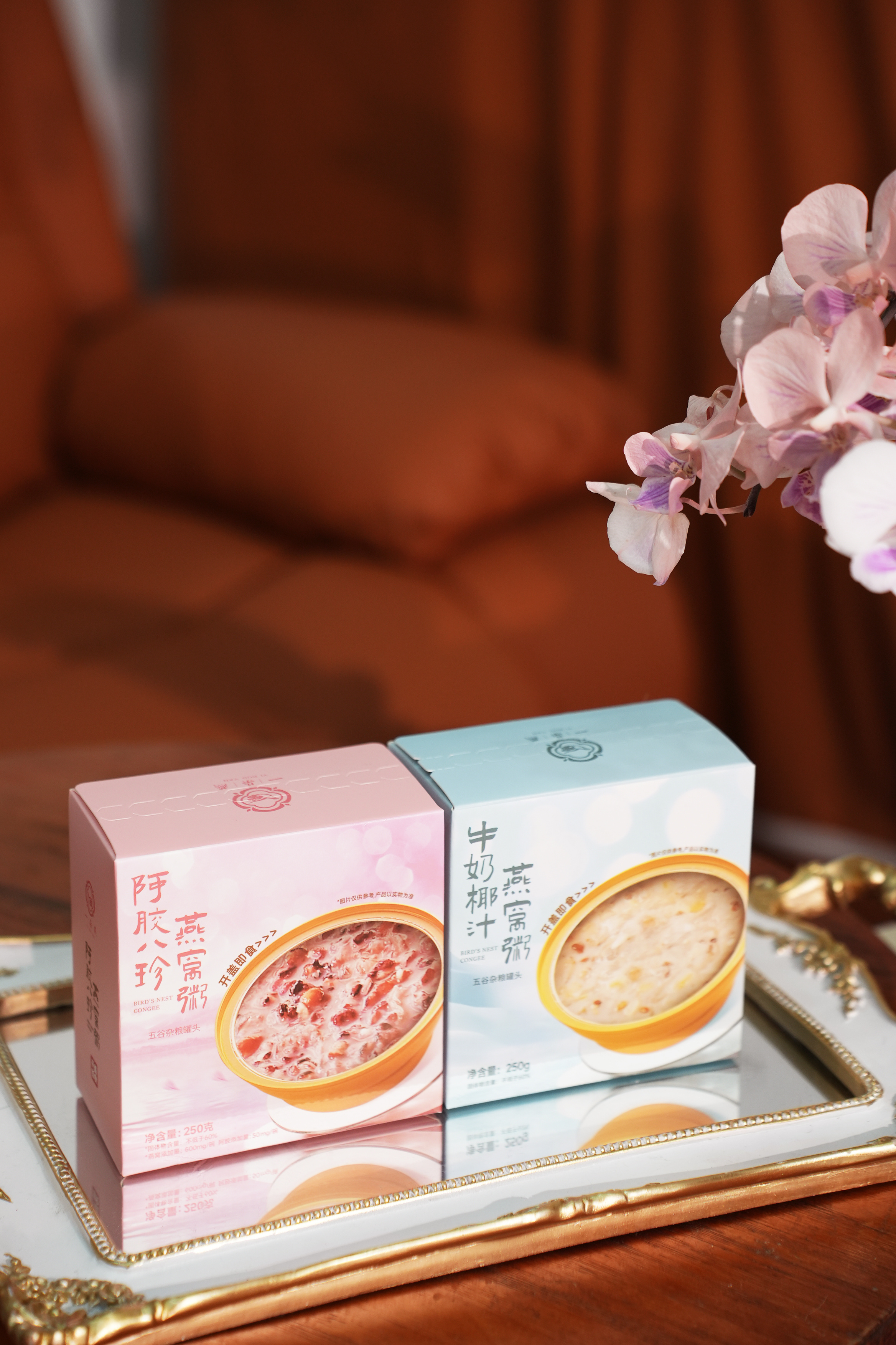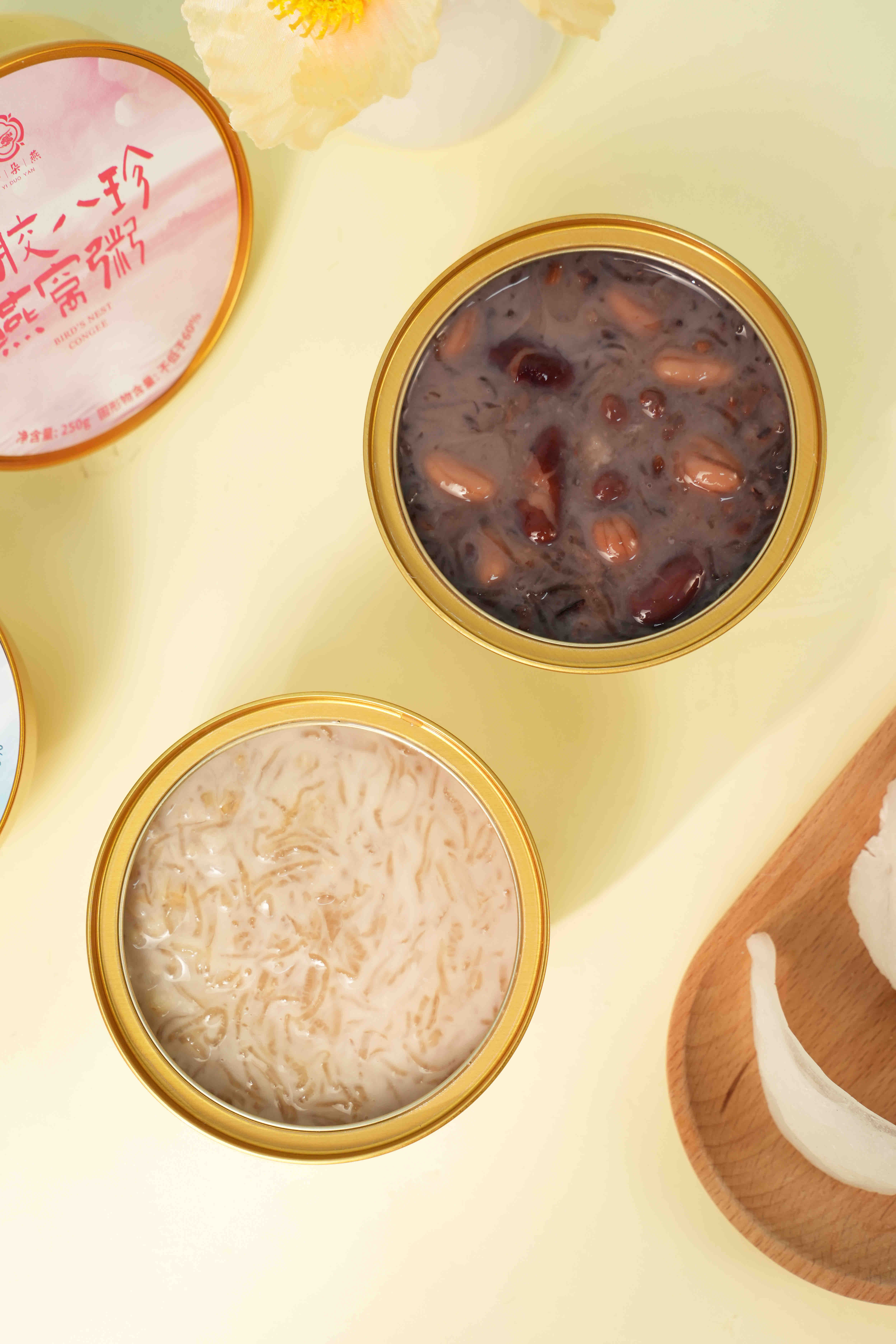 精选印尼顶级白燕盏,碗碗足料满满诚意 肉眼实打实能看见!!固形物含量不低于50% 印尼进口燕窝,丝丝分明 精选阿胶 ,本草银耳,谷物炖煮,清甜润滑奶香浓 低脂低卡,开盖即食