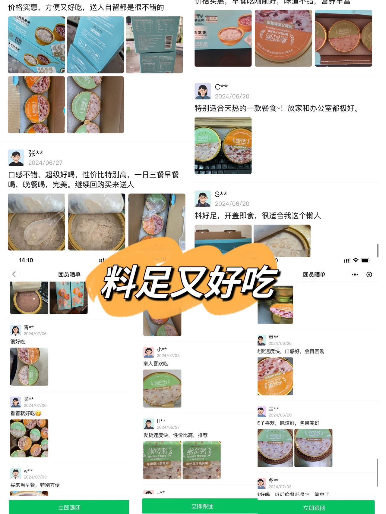 谷物,最是吸收天地灵气的 遵循“五谷为养”的饮食调养的原则 将多种谷物食材,打好营养基础 这还不够,搭配上美容养颜的燕窝、宁神安心的银耳 都是对身体大有裨益的食材,才算得上一碗优秀的“滋养粥” 通过精选各种原材料,进行精煮慢炖,激发原材料中的精华营养 运用创新锁鲜工艺,保正每碗燕窝粥的新鲜口感~ 丰富的膳食纤维,低脂低卡,好吃不胖! 健康满满,真材实料看得见~