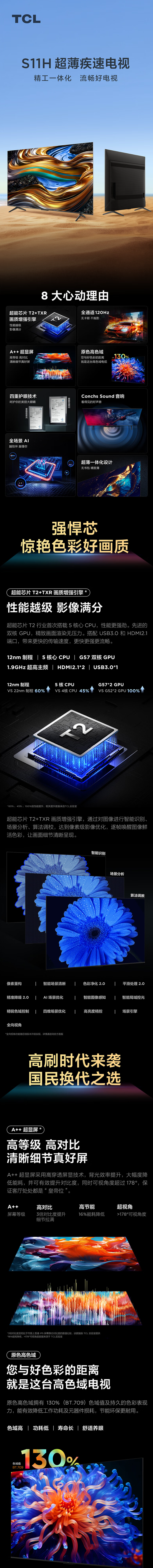 TCL(912690) 65S11H 超能芯片T2 超薄一体化设计 全通道120Hz A++超 65英寸 电视