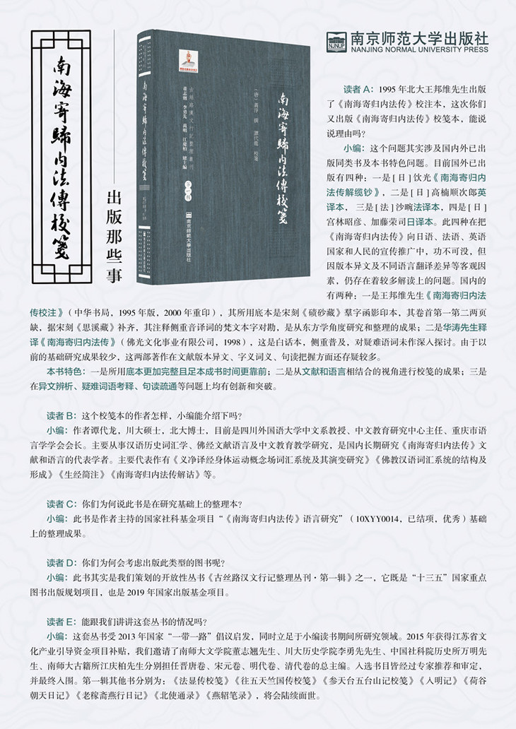 义净是中国佛教历史上与法显、玄奘并列的最为著名、最有成就、影响最大的西行求法僧人。其所撰《南海寄归内法传》是反映古印度及南海地区佛教文化、僧伽生活及当时社会、历史、地理、中外交流等最具代表性的文献。该书是作者主持的国家社科基金项目“《南海寄归内法传》语言研究”(10XYY014)文献整理的终期成果,是国内首部从文献和语言相结合的视角对《南海寄归内法传》进行地毯式校勘和笺注的成果。其内容主要集中在三个方面:一是辨析版本异文。除利用前人已用材料外,还利用了高丽藏初雕本及慧琳音义和可洪音义等材料,并充分吸收汉语俗字学的研究成果,辨析了《南海寄归内法传》各版本所存异文。二是考释疑难字词。吸收了近年来佛教文献语言研究和汉语史研究成果,侧重考释了前人未出注的非梵汉对译的疑难语词的音义。三是疏通文本句读。对《南海寄归内法传》一书前人点断有误处,采用了创新性处理办法,疏通解决了文句在理解上的问题。该书是作者多年来整理和研究《南海寄归内法传》成果的集中体现。