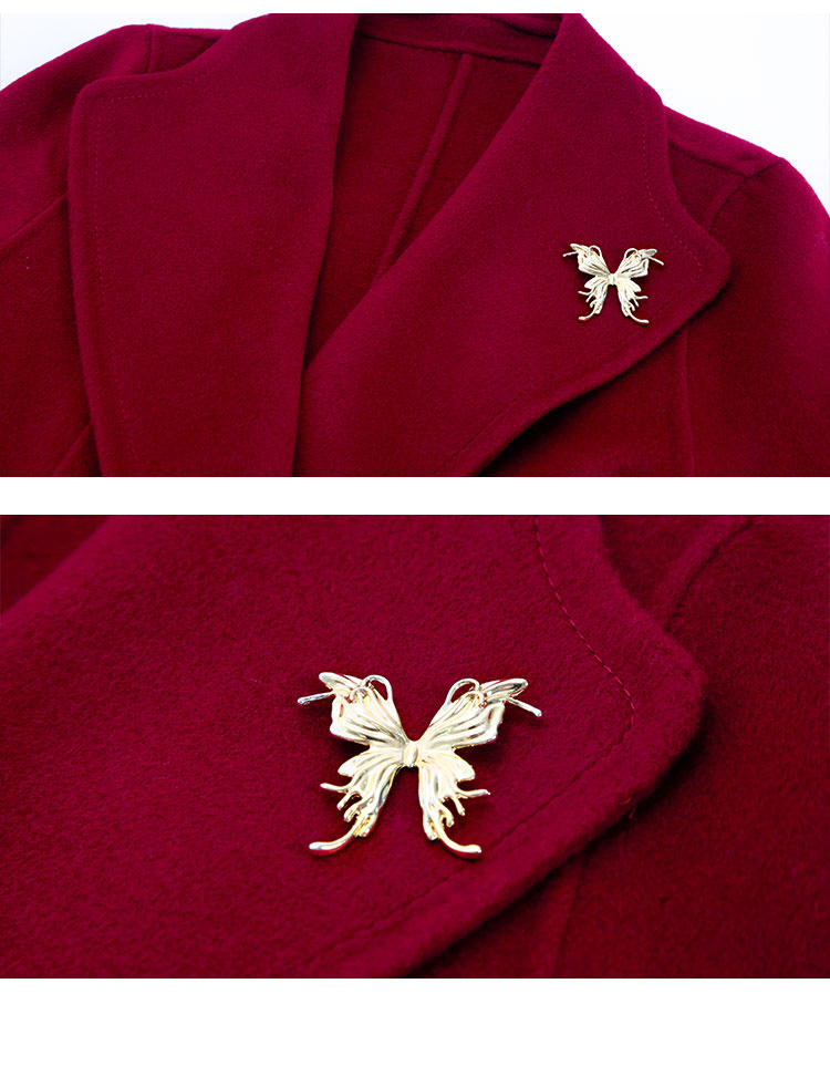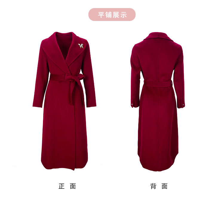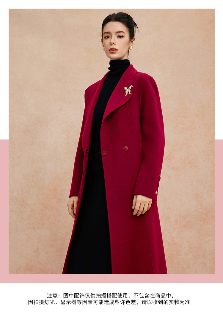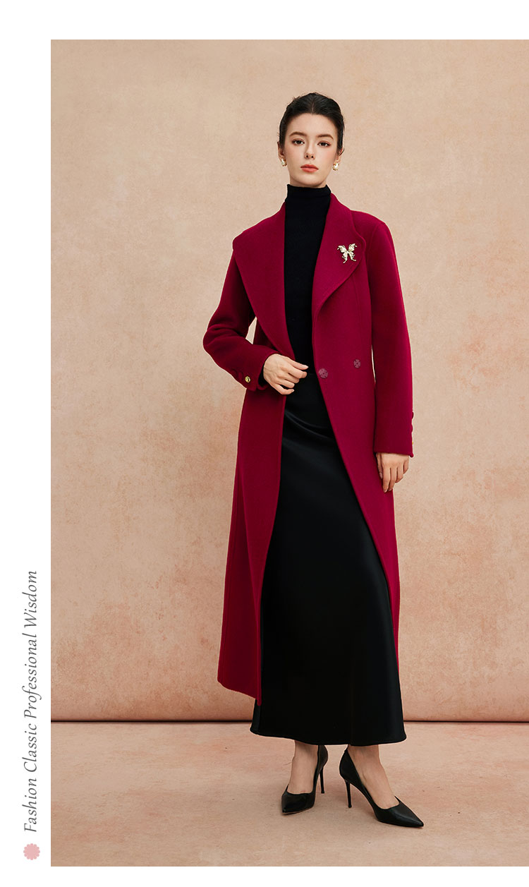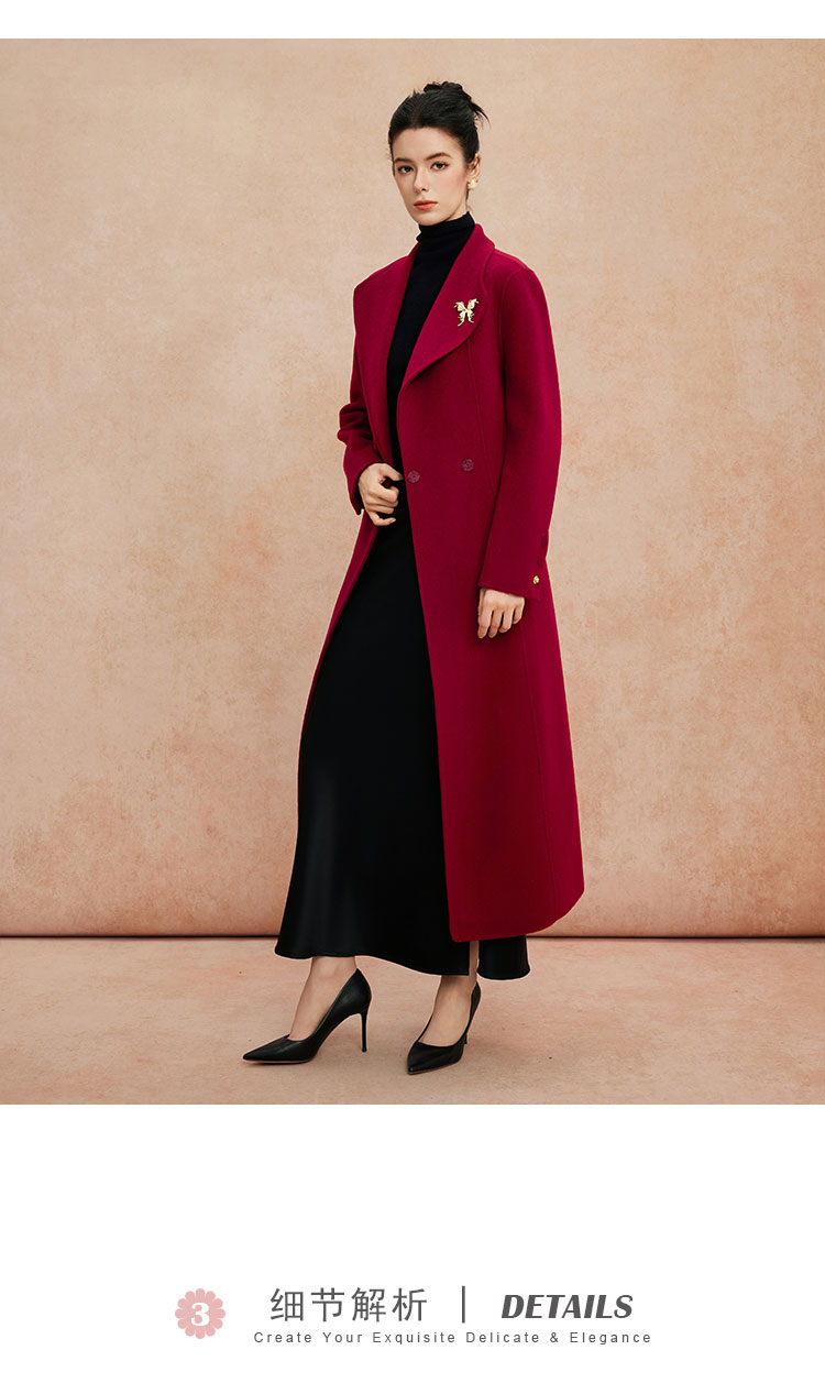 QH960斯尔丽2025新款轻薄修身气质高雅流金蝴蝶胸花长款羊毛大衣