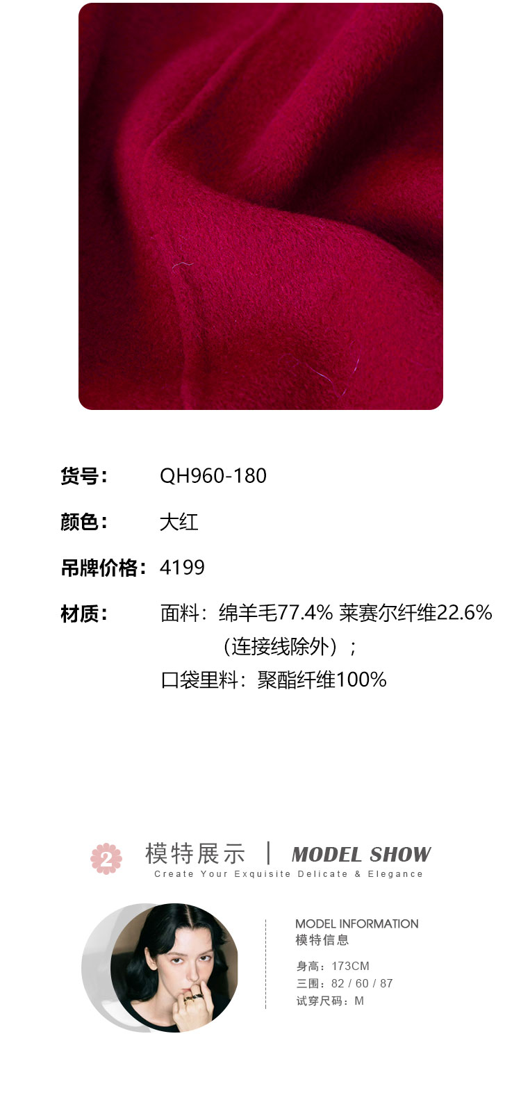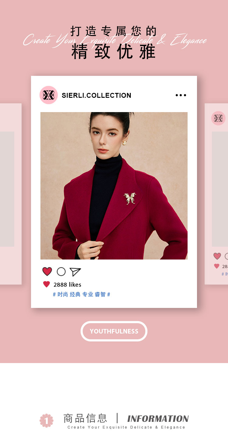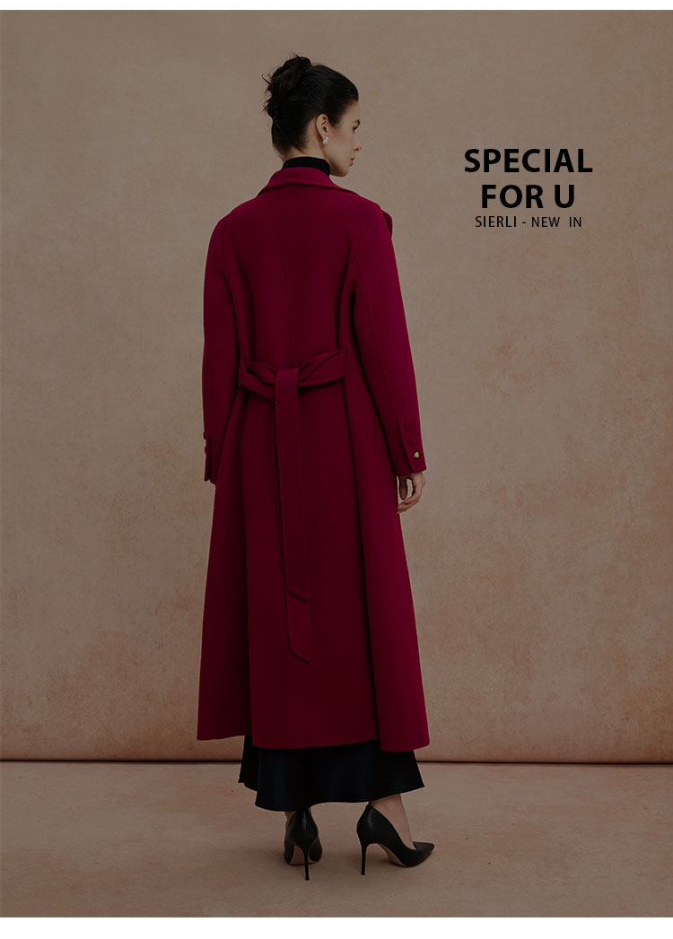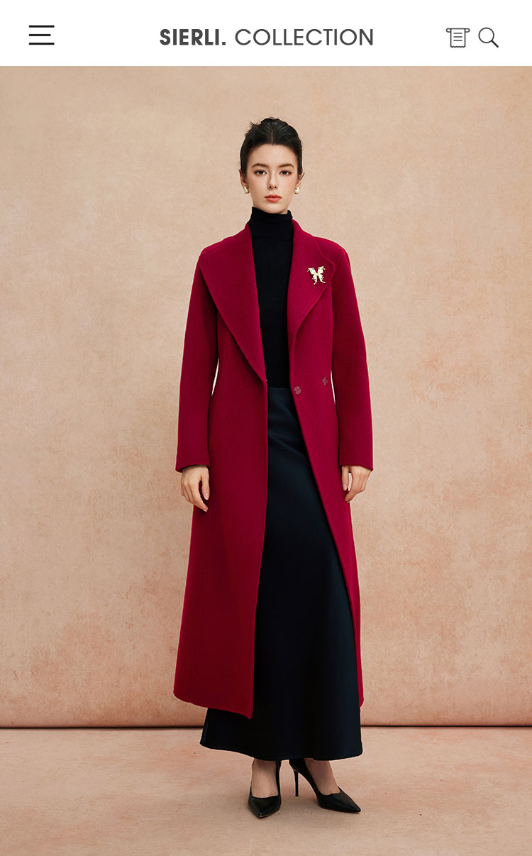 QH960斯尔丽2025新款轻薄修身气质高雅流金蝴蝶胸花长款羊毛大衣