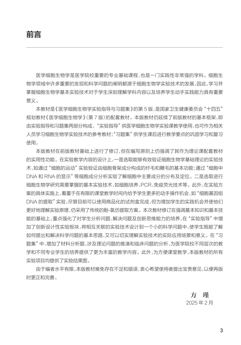 《医学细胞生物学实验指导与习题集》(第5版)是全国高等学校五年制本科临床医学专业第十轮规划教材《医学细胞生物学》(第6版)的配套教材。本版教材仍延续了前版教材的基本框架,即由实验指导和习题集两部分构成,“实验指导”供医学细胞生物学实验课教学使用,也可作为相关人员学习细胞生物学实验技术的参考教材;“习题集”供学生课后进行教学要点的巩固学习和复习使用。在修订中着重强调了本教材作为理论课配套教材的实用性功能,对内容进行了调整。对“实验指导”中的实验项目进行了适当删减,内容上一是选取能够有效验证细胞生物学基础理论的实验技术;二是选取进行细胞生物学研究需要掌握的基本实验技术。