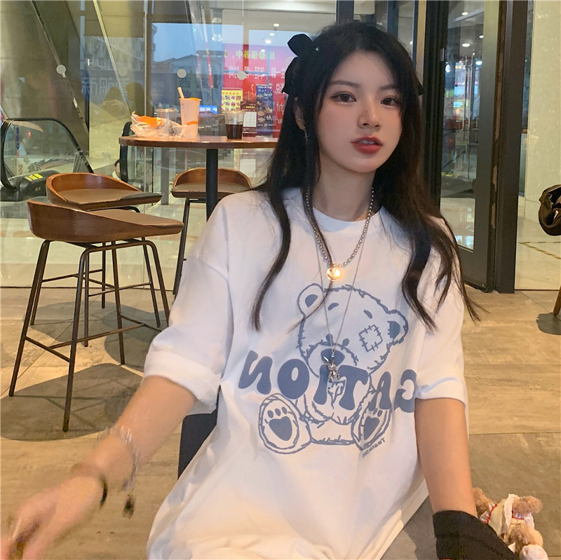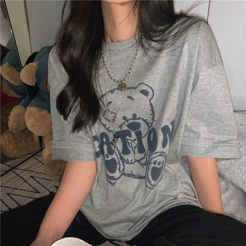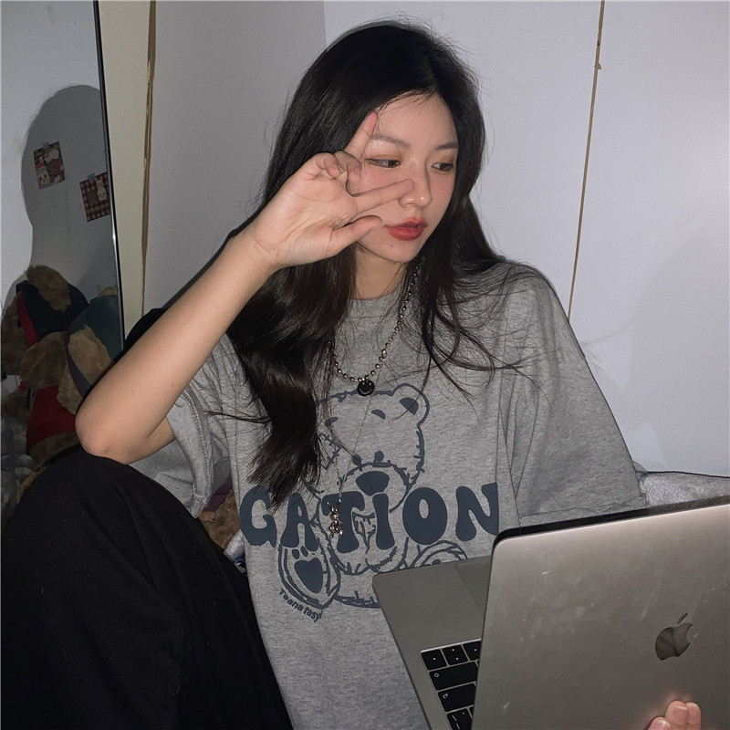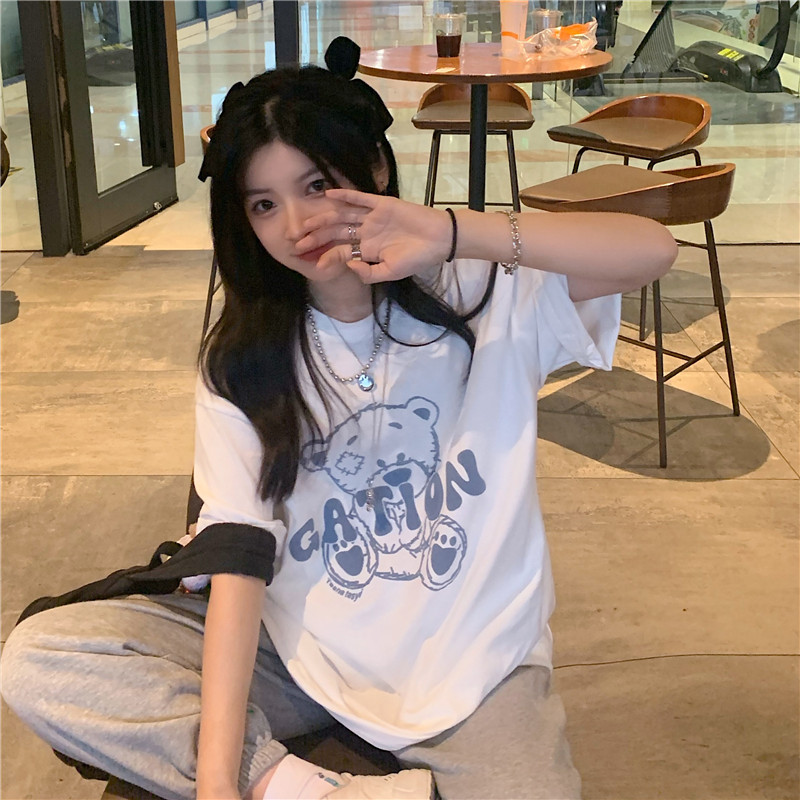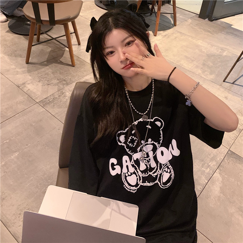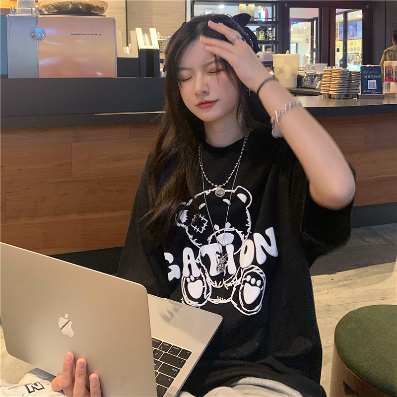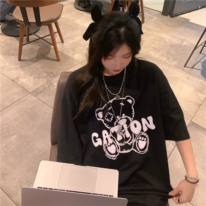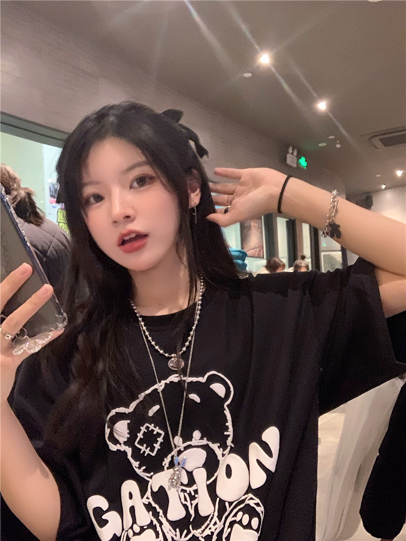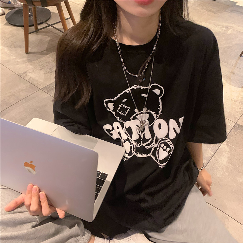 发泡小熊短袖T恤女韩版宽松上衣百搭减龄宽松短袖T恤上衣女