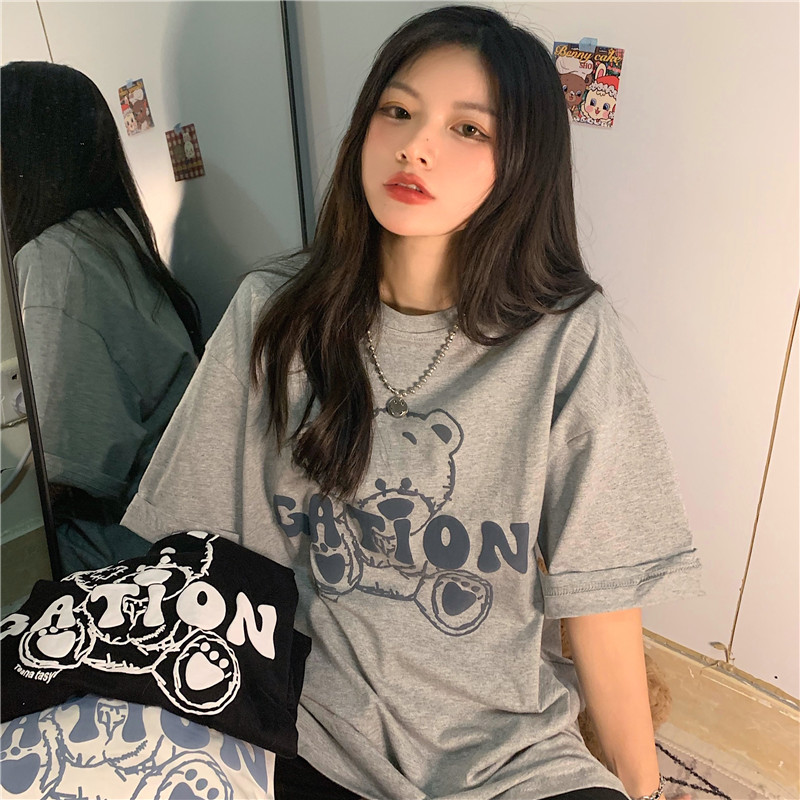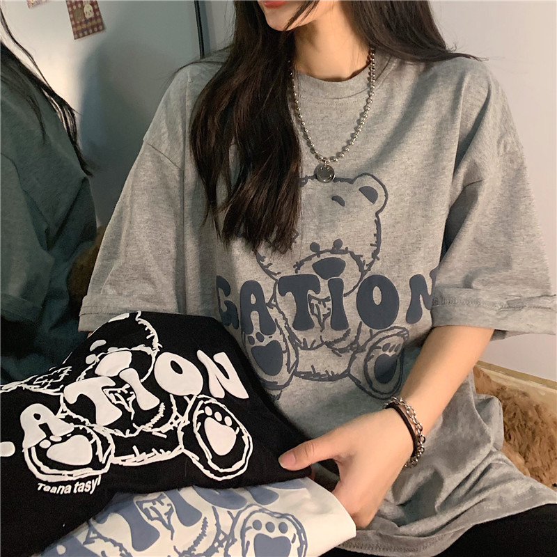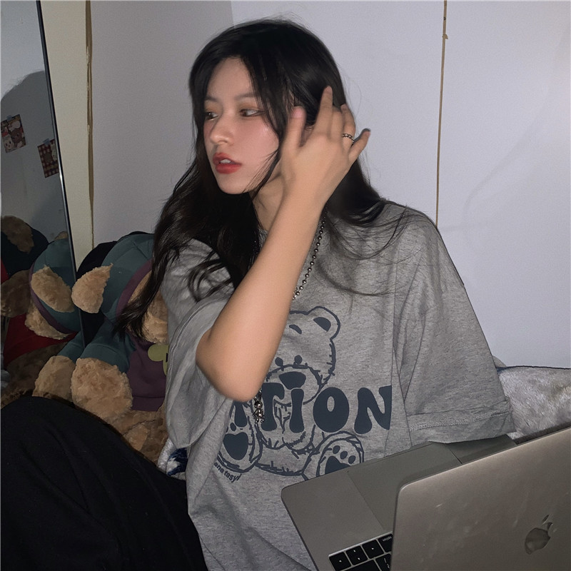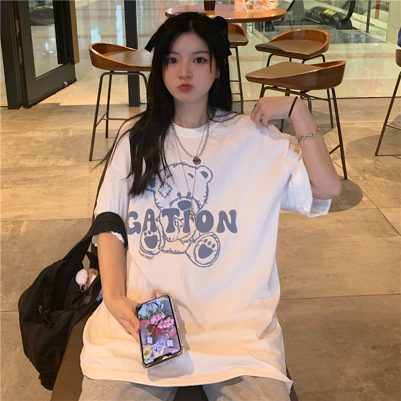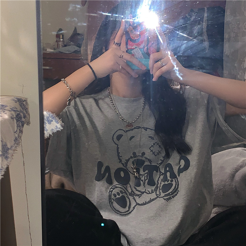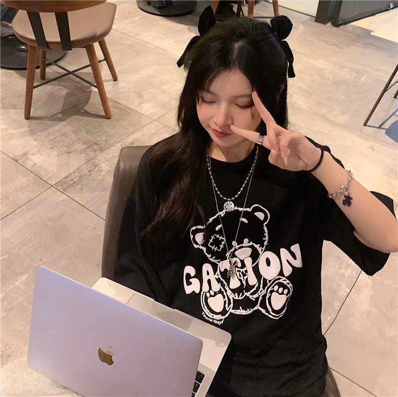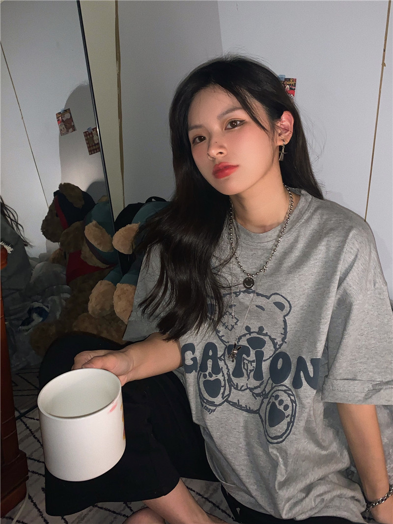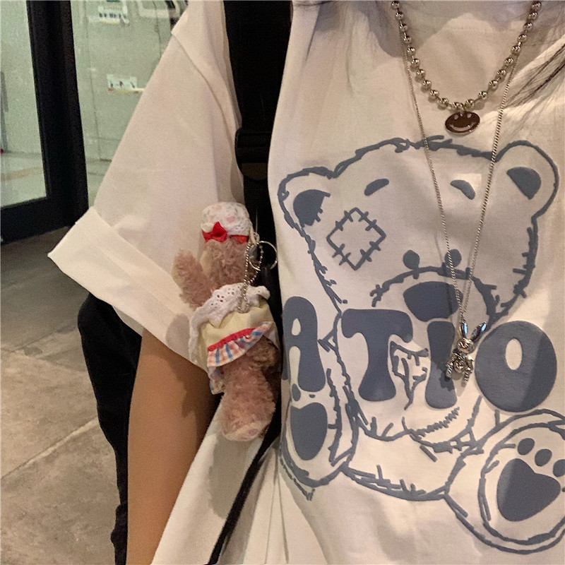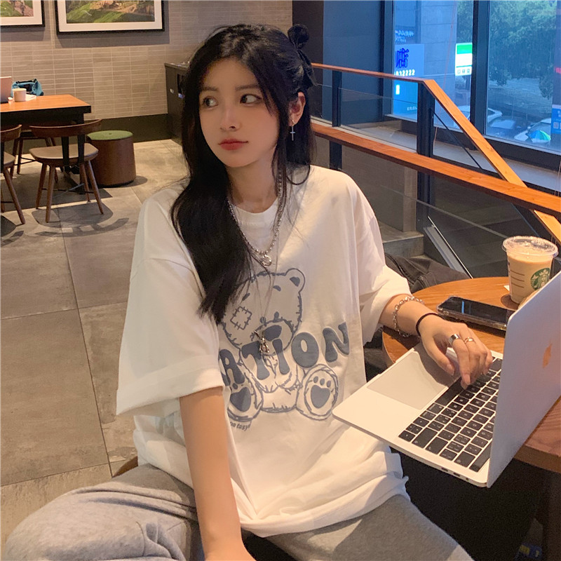 发泡小熊短袖T恤女韩版宽松上衣百搭减龄宽松短袖T恤上衣女