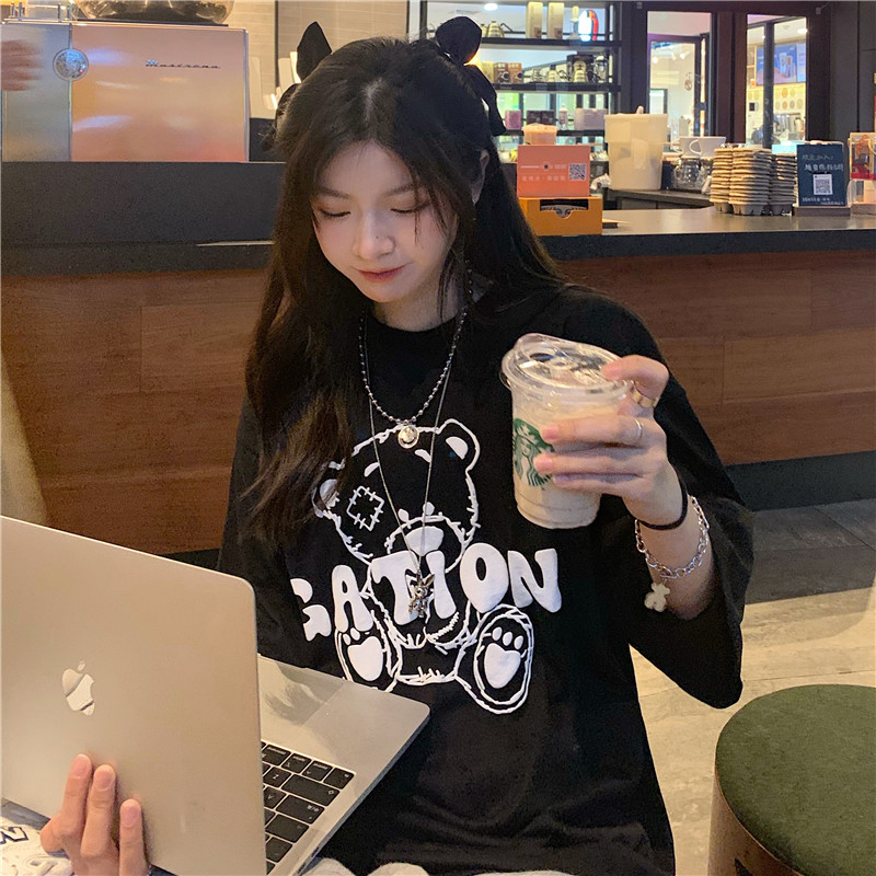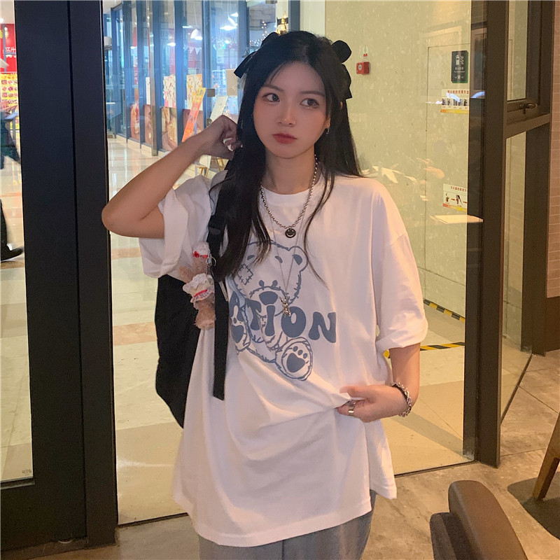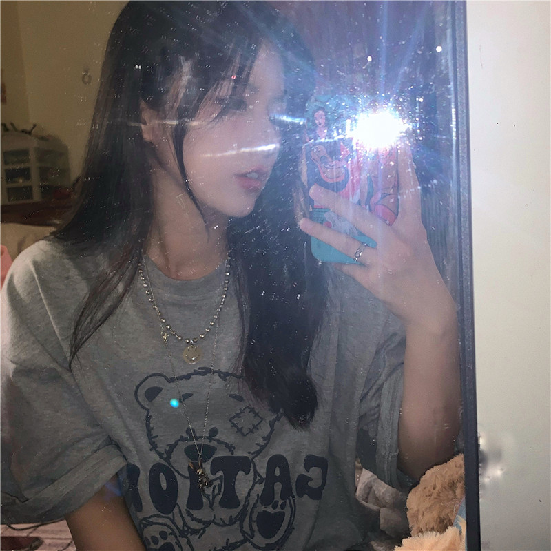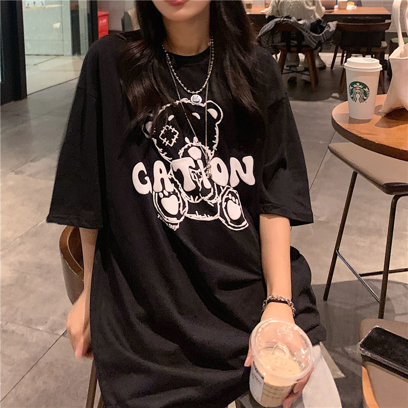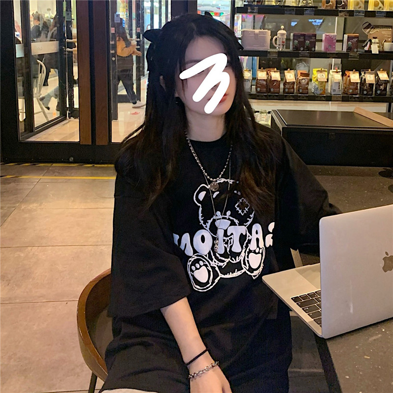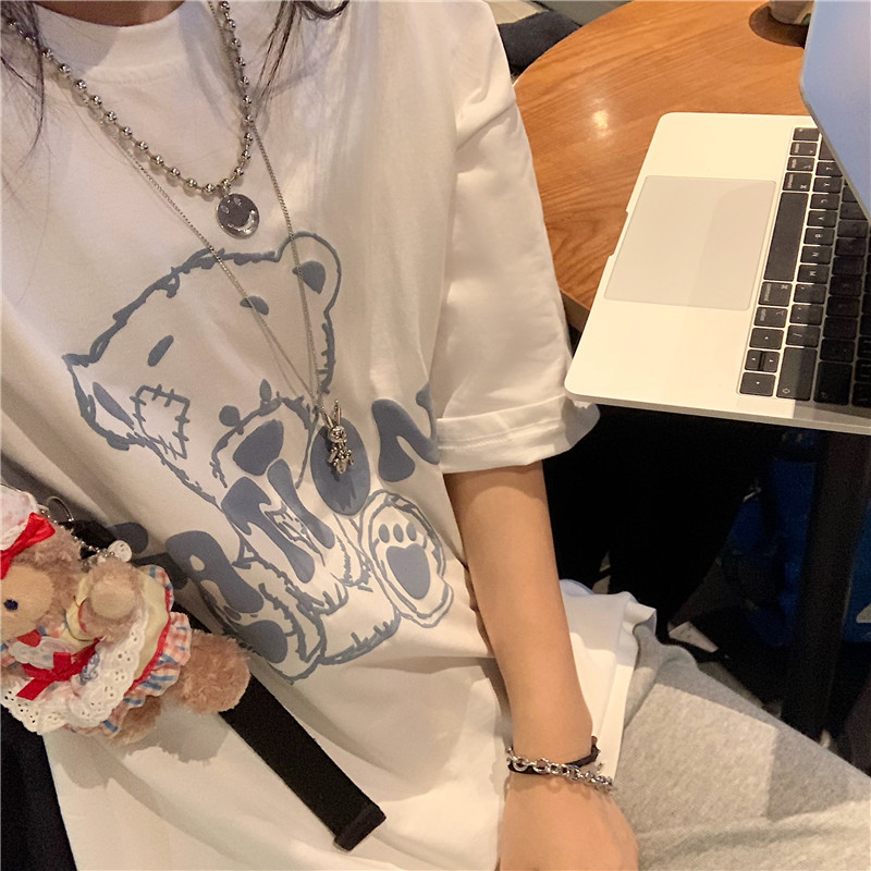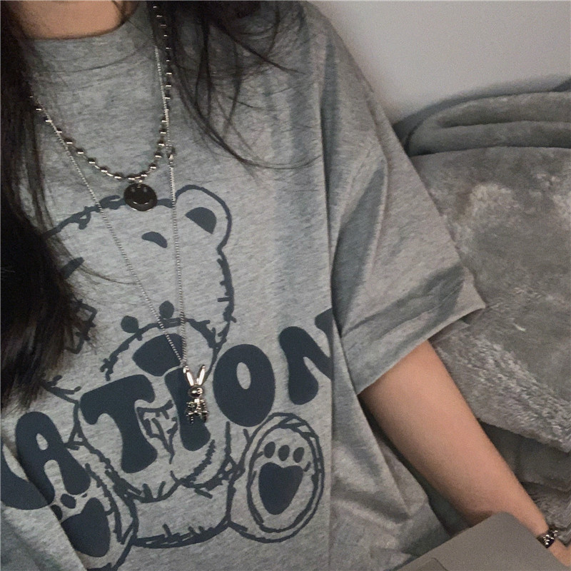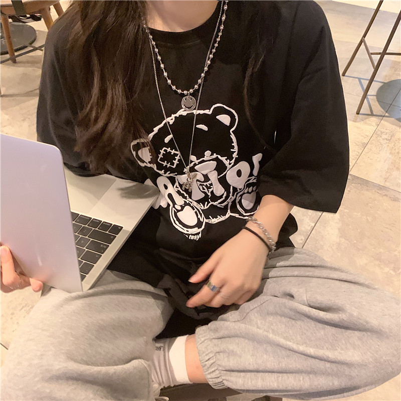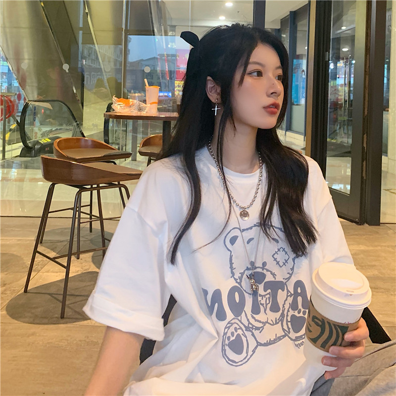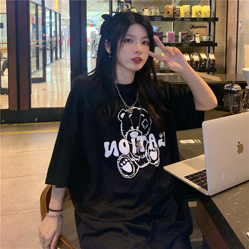 发泡小熊短袖T恤女韩版宽松上衣百搭减龄宽松短袖T恤上衣女