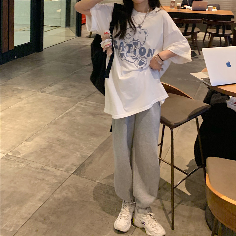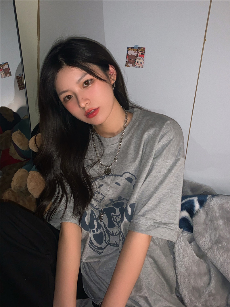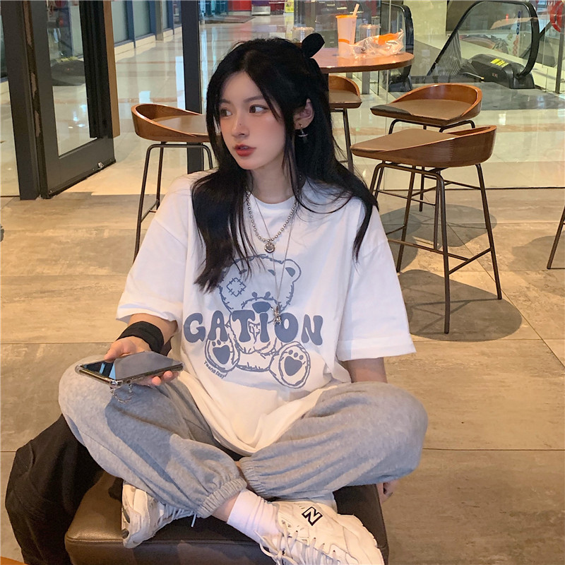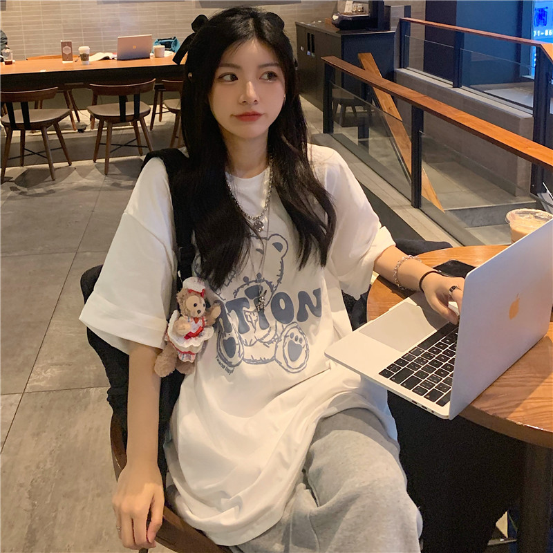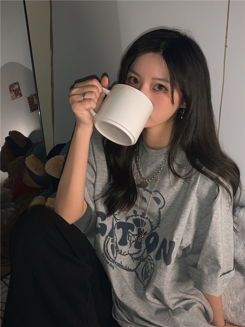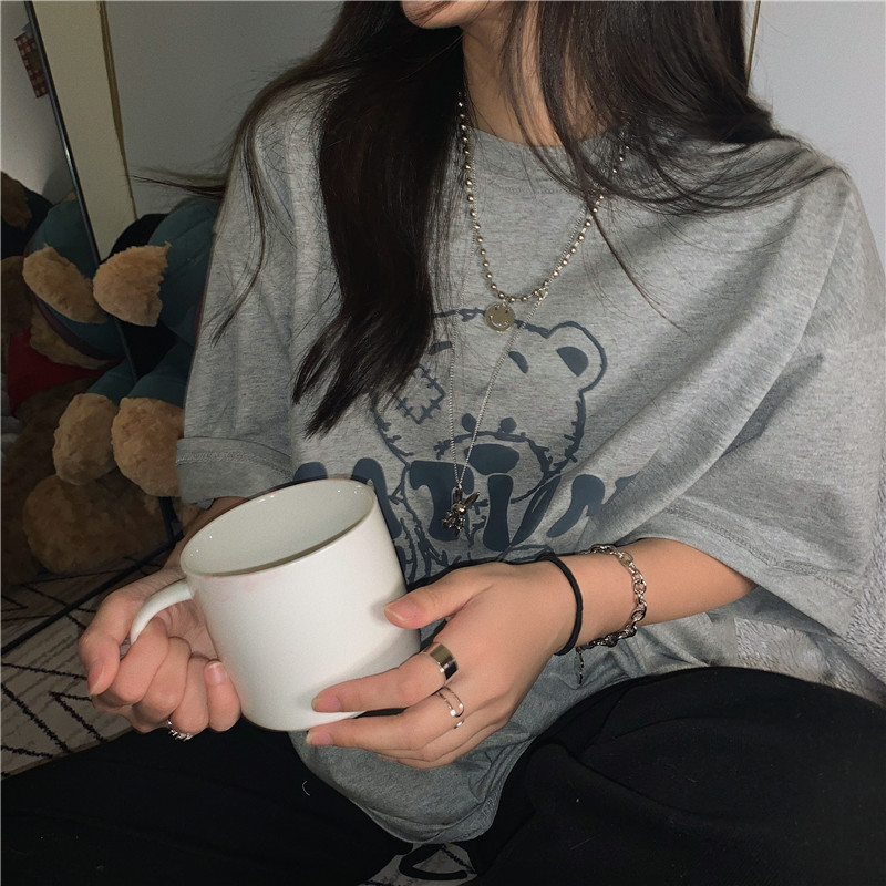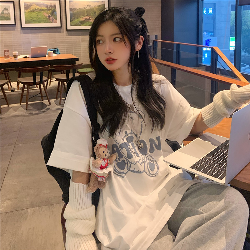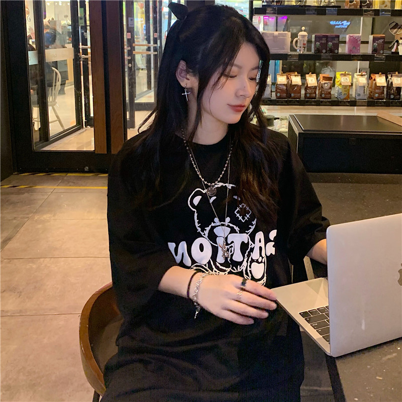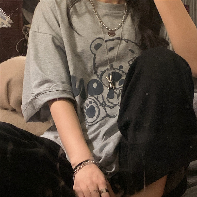 发泡小熊短袖T恤女韩版宽松上衣百搭减龄宽松短袖T恤上衣女