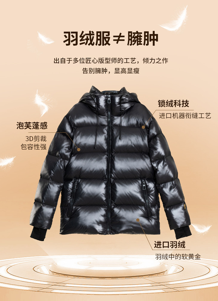 🔺绒届天花板——白鹅绒 它的绒子含量达90% 填充的是非常轻盈、柔软 且保暖性强、无异味的鹅绒 穿在身上,就是行走的鹅绒被,那叫一个暖和啊 鹅绒养殖时间长,产量少 加上体型更肥满、鹅绒更大朵 蓬松性和回弹性都比其他面料好特别多。 这款高端黑金黑钻羽绒服,选用干净无污染的大朵鹅绒 可以看见白鹅绒的绒朵硕大、饱满、白净 闻起来无异味,捧在手上比普通鸭绒更松软 比棉花更保暖,实属上品 2件T恤钱,就能买到一件高端的鹅绒服,你说值不值?!