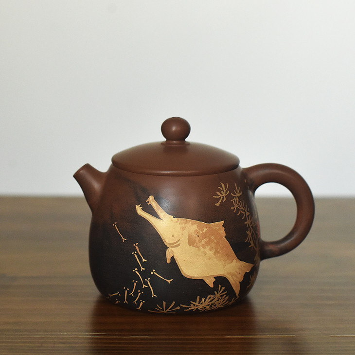 三金,本名李鑫,启正陶社社员,2010年在朝阳楼跟随半根先生学习制壶。三金制陶随性而发,平淡天真,器型古朴,装饰淡雅,常作闲人、傻鱼、呆僧图饰······生趣盎然。制陶应是玩,不作高态,能让喜欢的人观之用之心生愉悦,便是乐事。虽有不足,但制陶路漫漫,坚持下去,必有所收获。