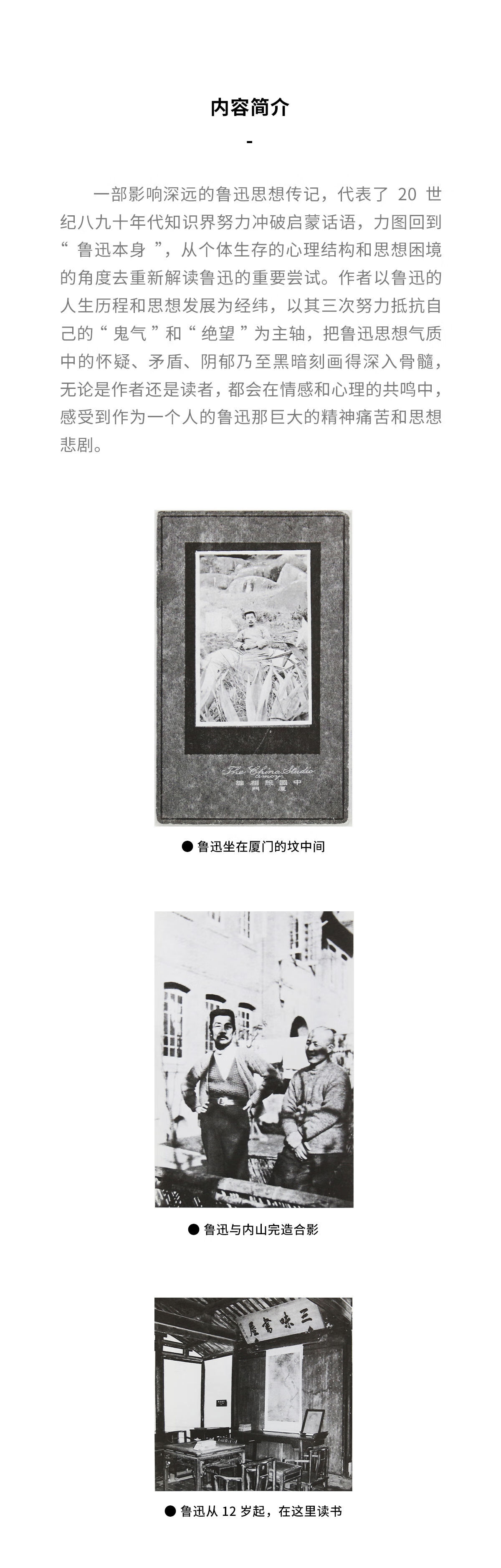 作者以鲁迅的人生历程和思想发展为经纬,以其三次努力抵抗自己的“鬼气”和“绝望”为主轴,把鲁迅思想气质中的怀疑、矛盾、阴郁乃至黑暗刻画得深入骨髓,无论是作者还是读者,都会在情感和心理的共鸣中,感受到作为一个人的鲁迅那巨大的精神痛苦和思想悲剧。
