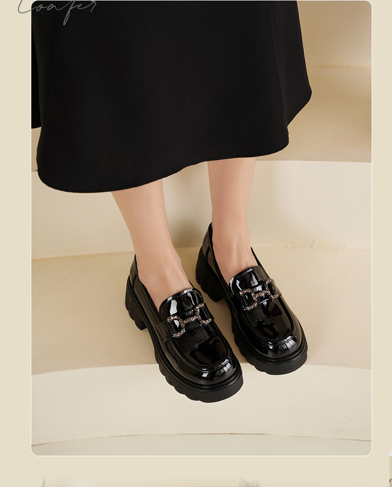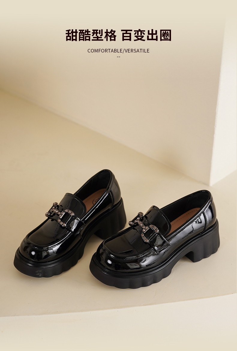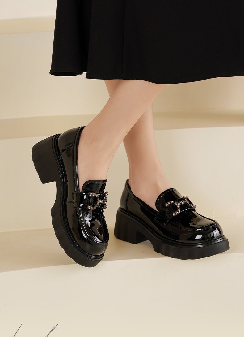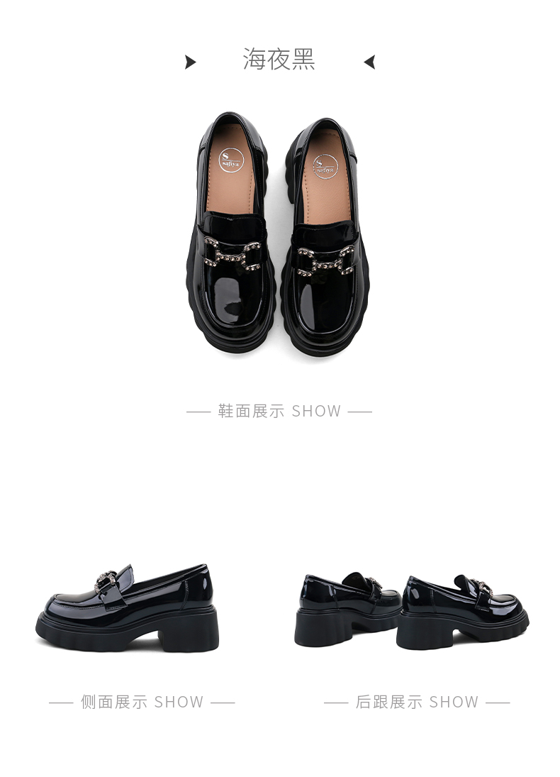 Safiya/索菲娅2025春英伦风粗跟漆皮钻扣轻便百搭小个子增高乐福鞋 SFD1112140