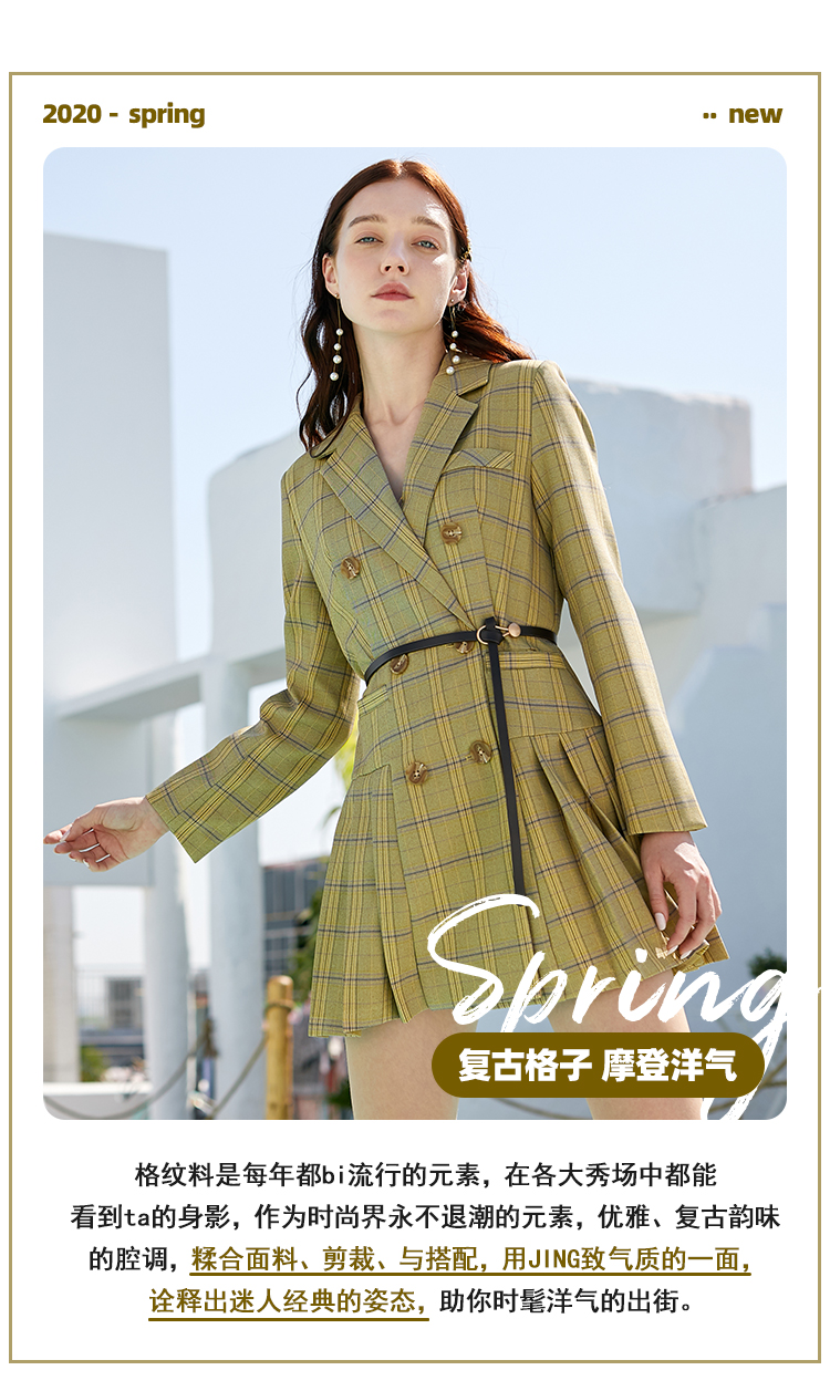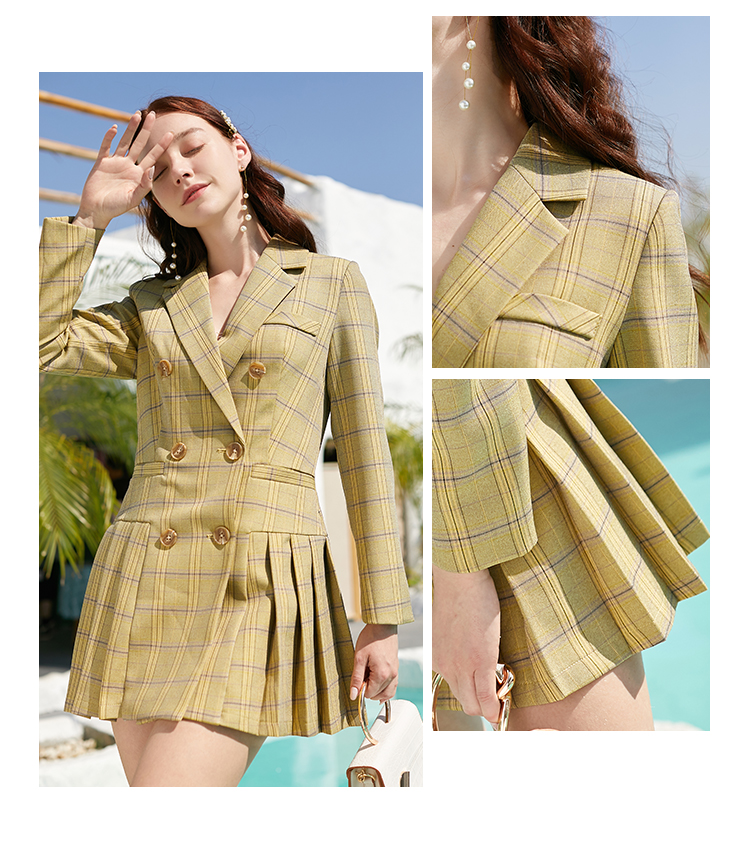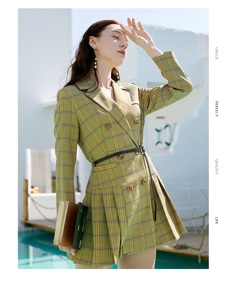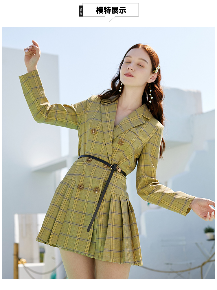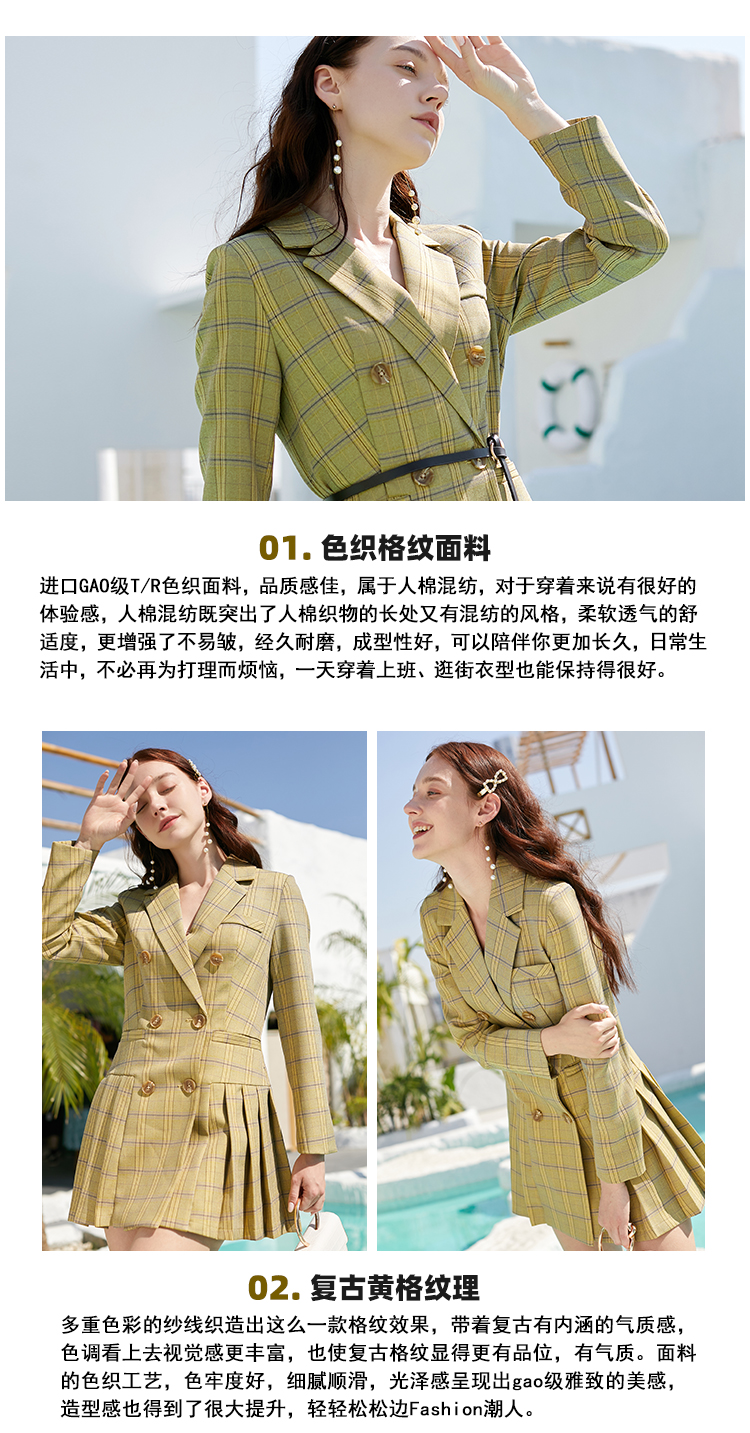 欧芮儿春新款长袖双排扣V领格子西连衣裙女中长款百褶裙