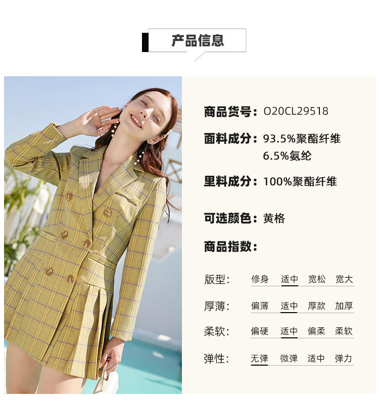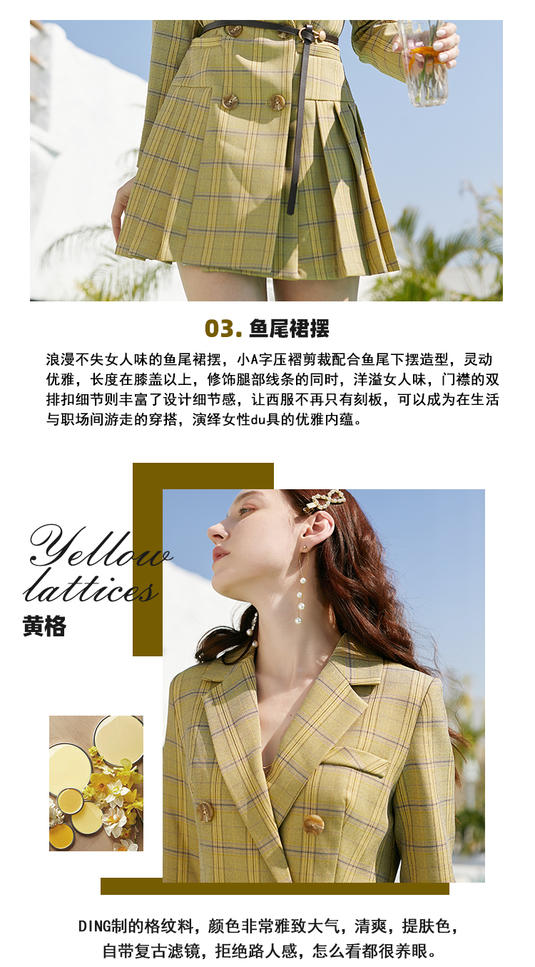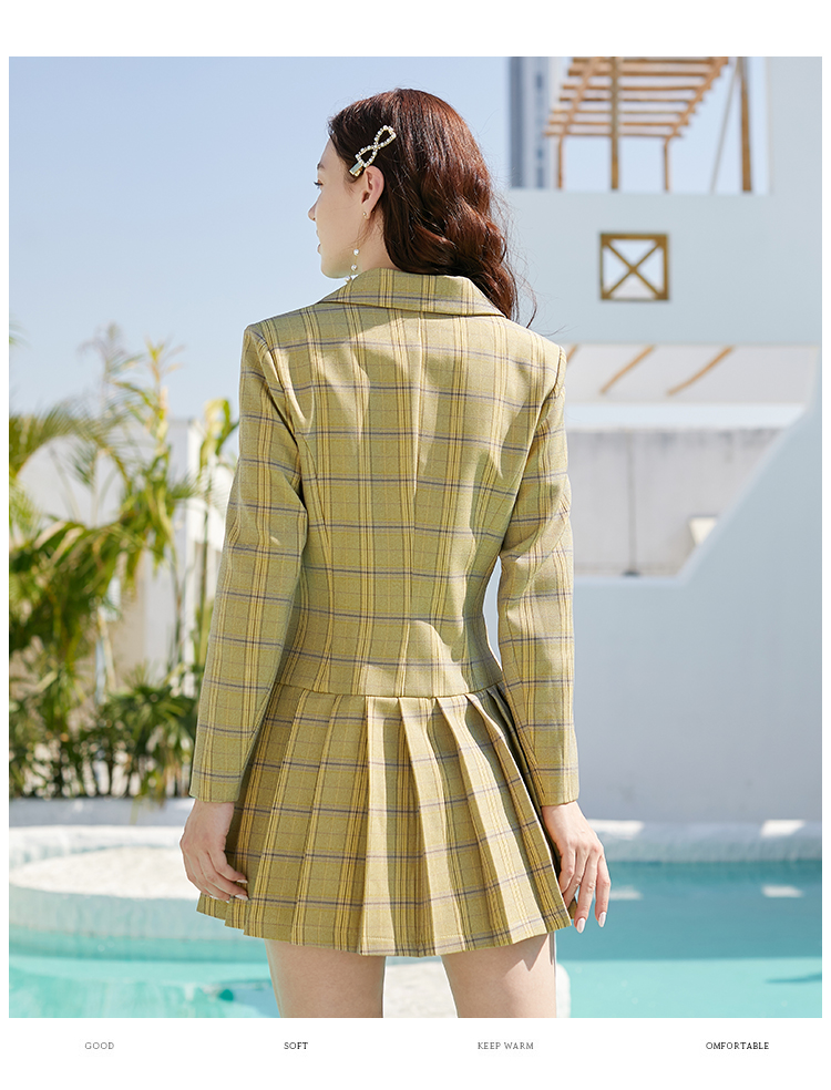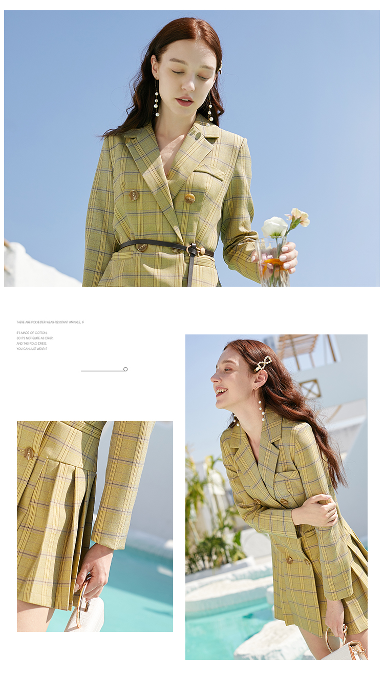 欧芮儿春新款长袖双排扣V领格子西连衣裙女中长款百褶裙
