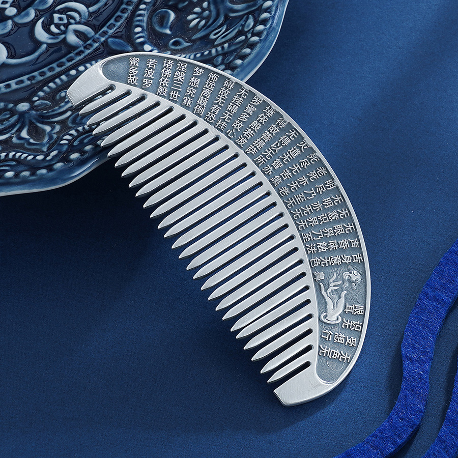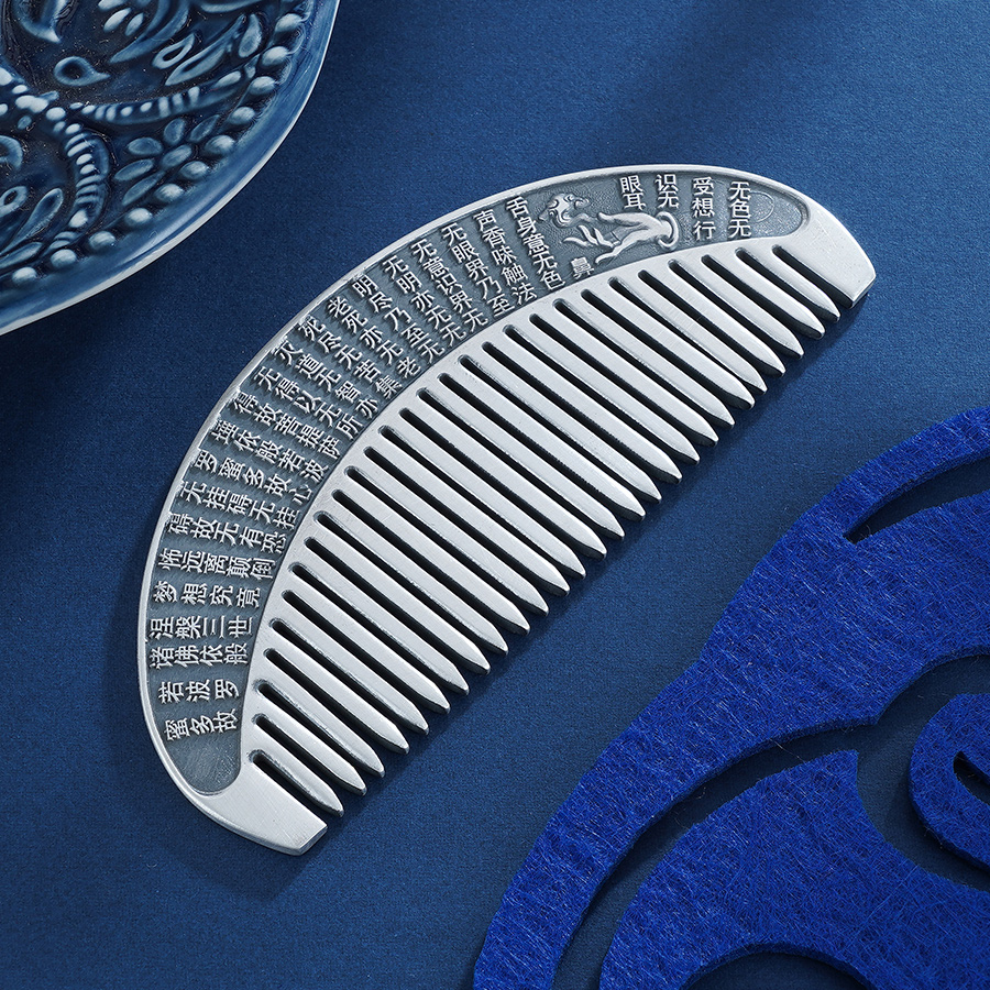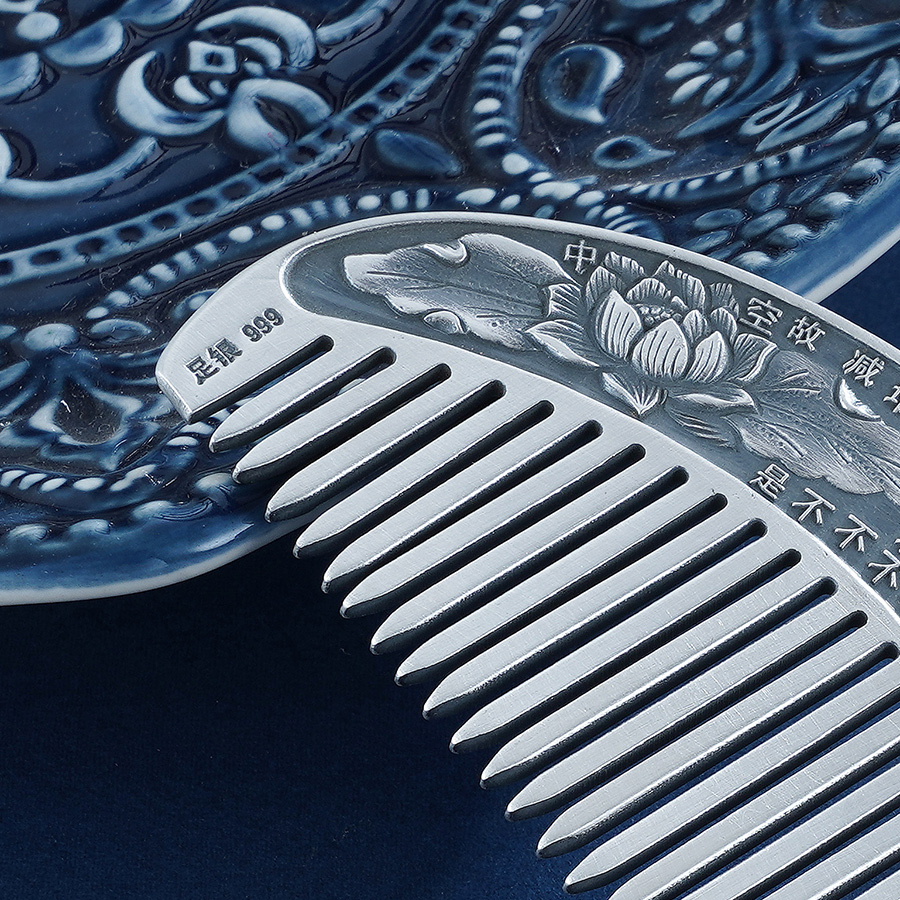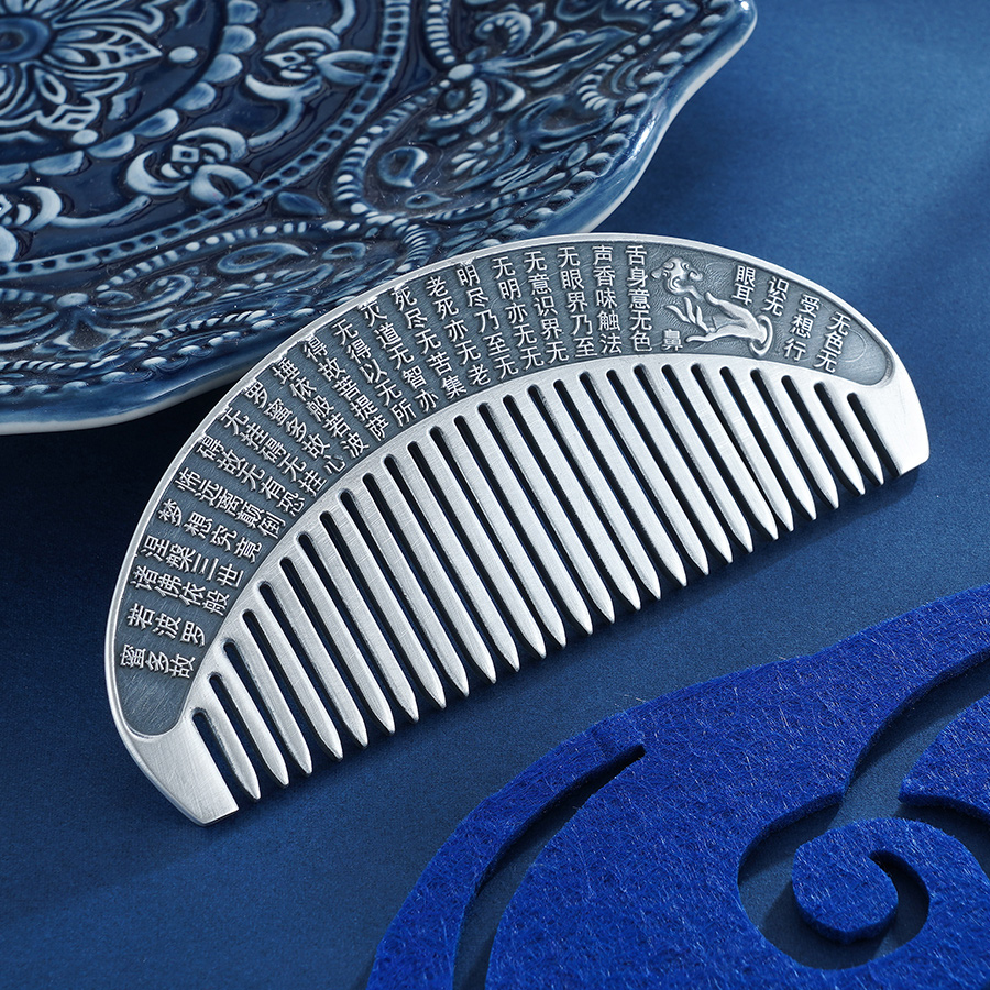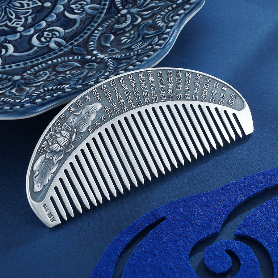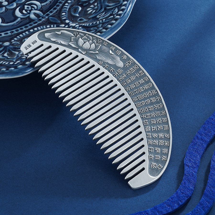 【寓意】:浮雕心经银梳,日常使用,守得一处清明。在妙法莲花中,见佛、见禅、见自己。