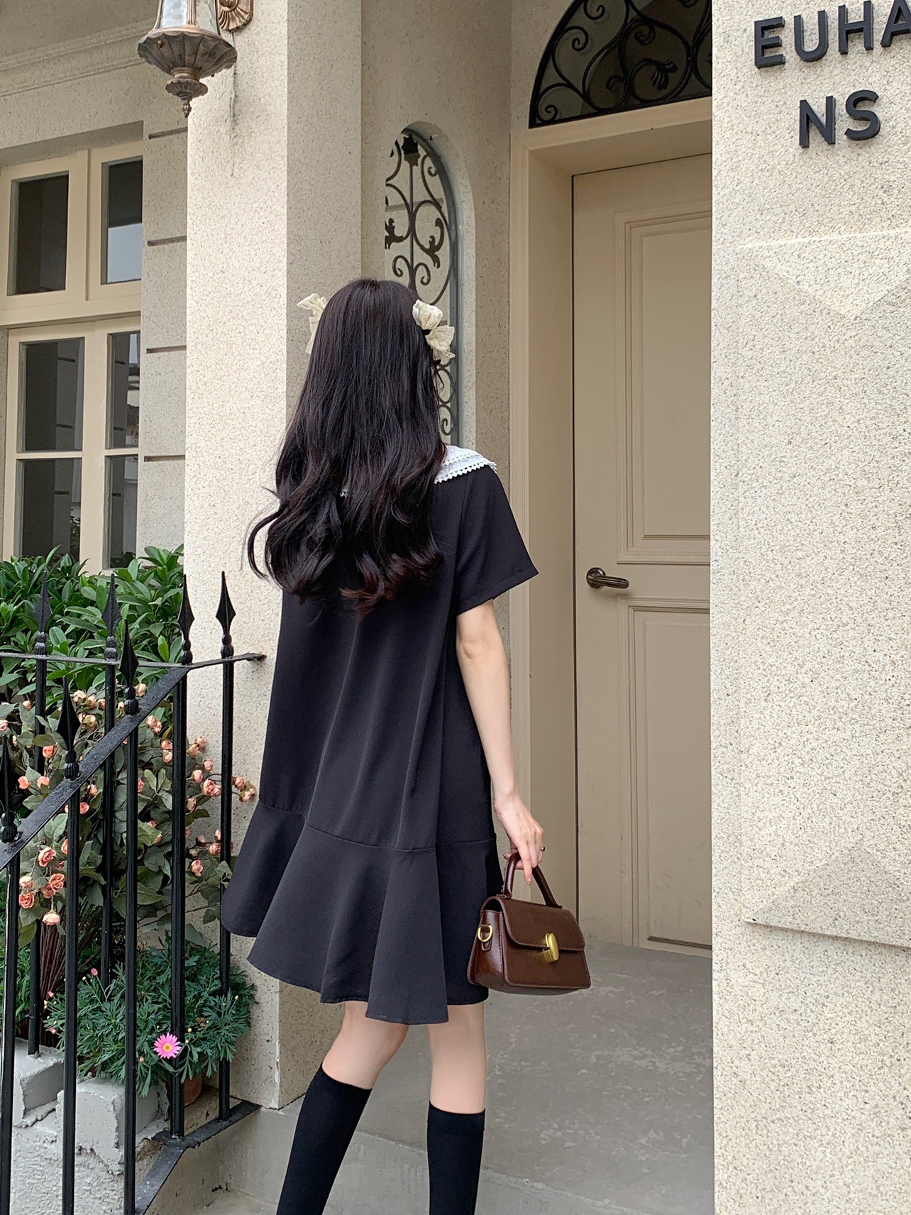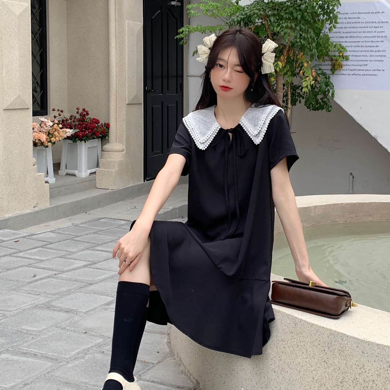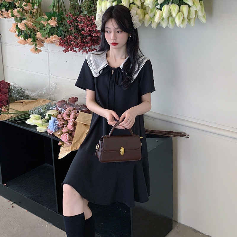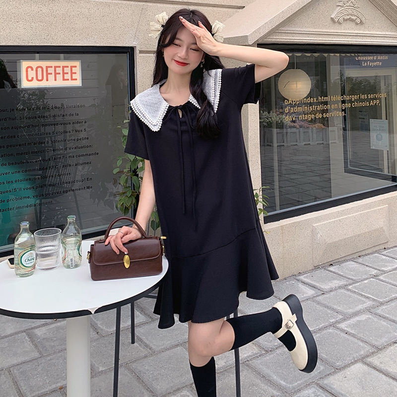 【法式初恋甜美连衣裙女】学院风娃娃领宽松中长款气质小黑裙,大码女装胖mm宽松遮肉显瘦,娃娃领连衣裙夏季新款短袖遮肚减龄裙子