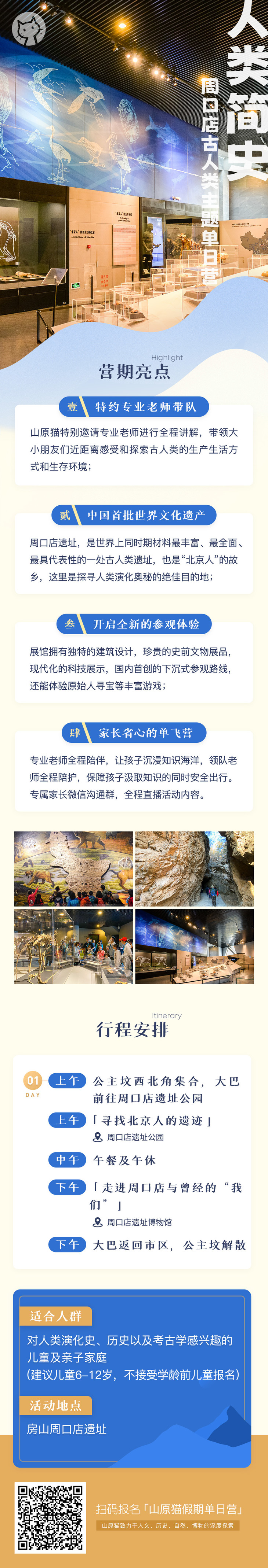 老师将为大家介绍周口店遗址的历史和博物馆的建设。了解古人类的演化史,人类的祖先在地球上是如何出现的?曾经的古人们每一天的生活是什么样的?没有网络没有书籍,他们的知识如何传递?没有弹药没有衣物,他们要如何抵抗野兽和寒疾?