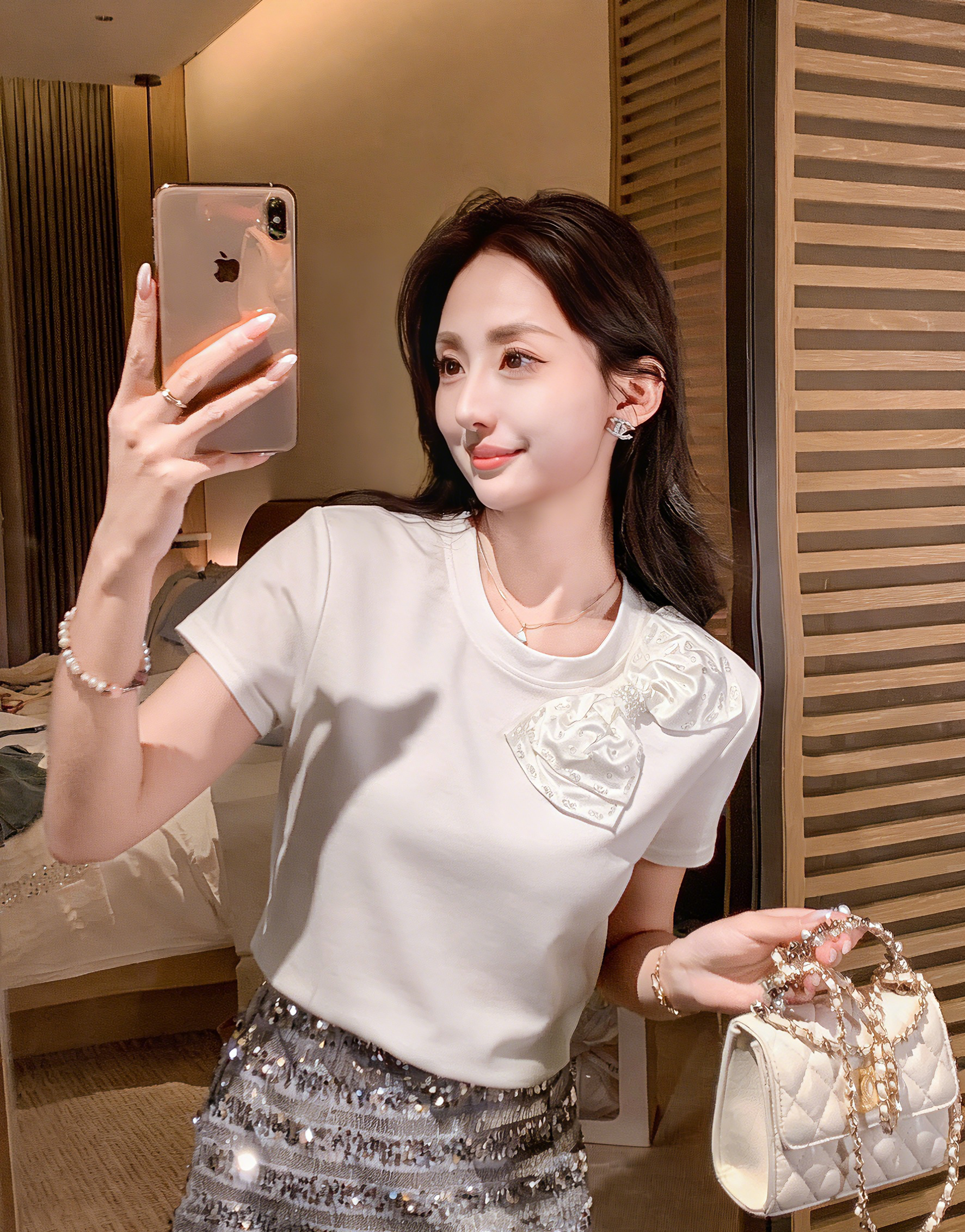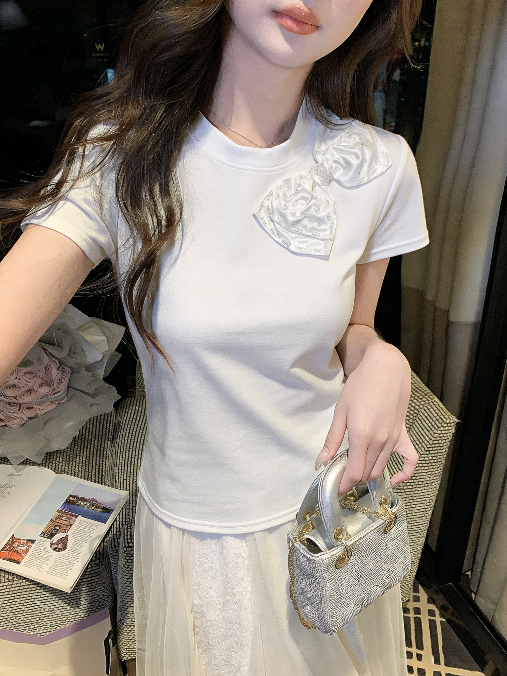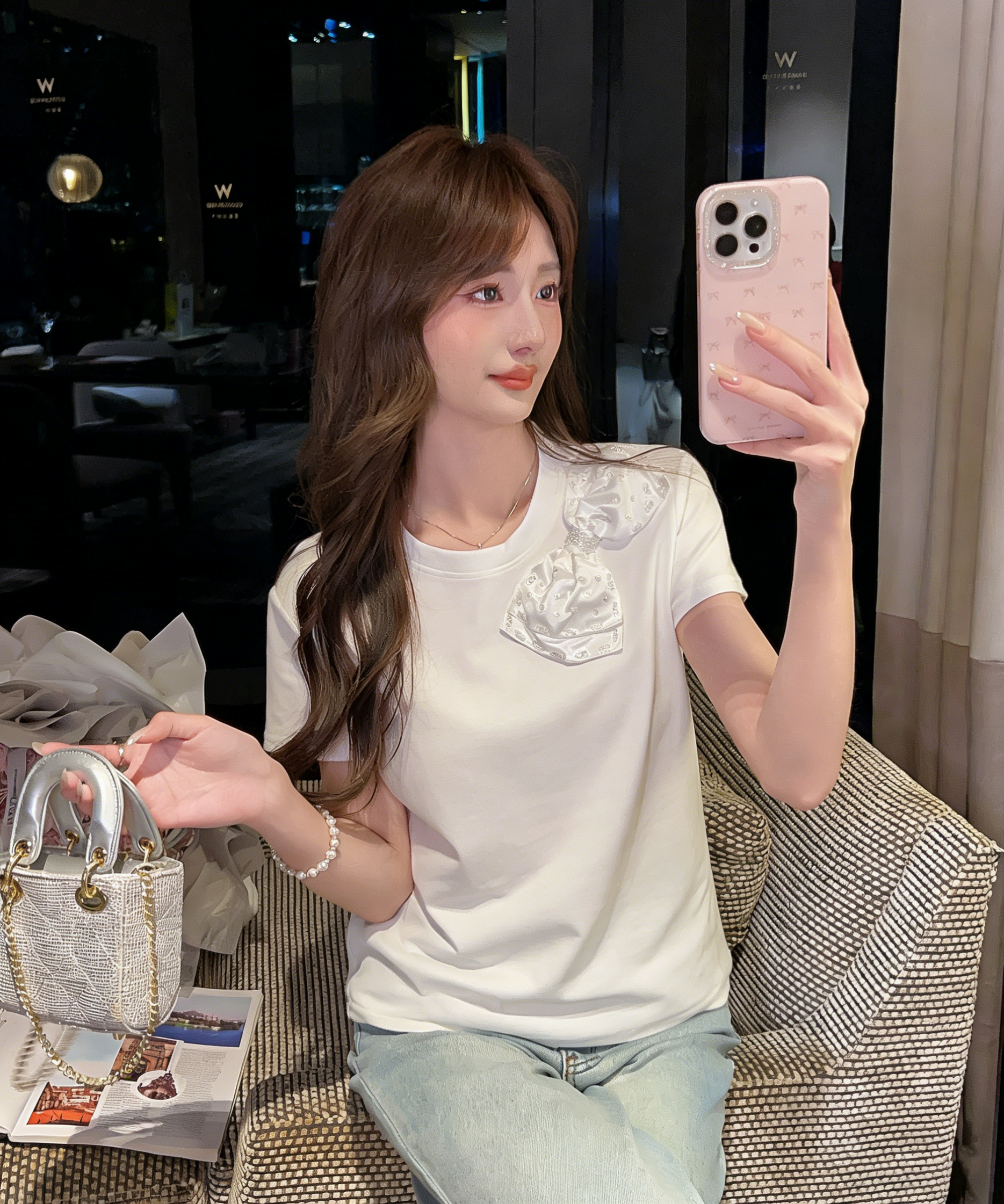 张心子【蝴蝶结日记】圆领立体蝴蝶结减龄百搭气质T恤上衣 U2603002