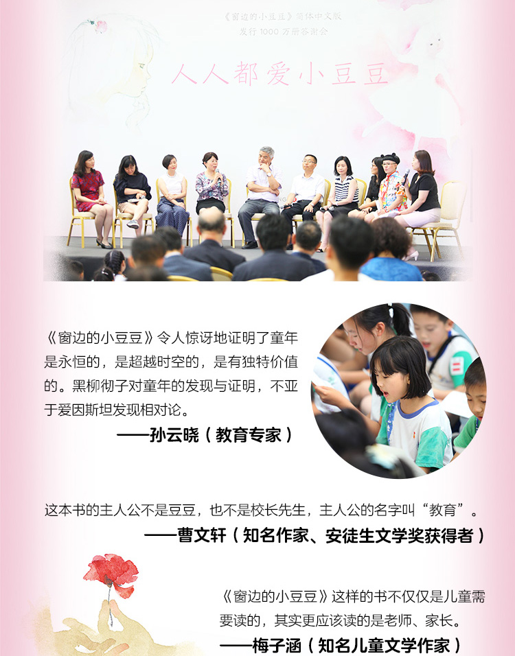 | 日本女作家黑柳彻子之所以取得非凡的成功,就在于她永远有一颗童心,并以博大的人文情怀审视和再现了童年的经历。她于1981年出版的《窗边的小豆豆》一书,成为人类历史上描写童年生活的经典作品。此书令人惊讶地证明了童年是永恒的,是超越时空的,是有独特价值的。实际上,黑柳彻子对童年的发现与证明,不亚于爱因斯坦发现相对论。 —— 中国青少年研究中心副主任、研究员 著名教育专家 孙云晓 小豆豆这样的书以及许多优秀的儿童文学作品不仅仅是儿童需要读的,其实更应该读的是老师,家长。世界上有几个小林先生? 如果诺贝尔有个教育奖的话可以授给他。因为他在人类做了个试验,做了个教育的乌托邦的试验。小林先生在他的教学园地实现了童年秘密的尊重,非常了不起。 ——著名儿童文学作家、评论家 梅子涵 |
