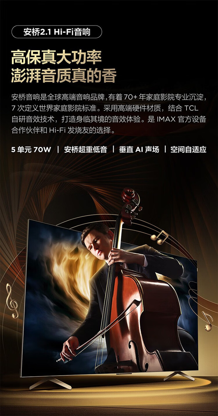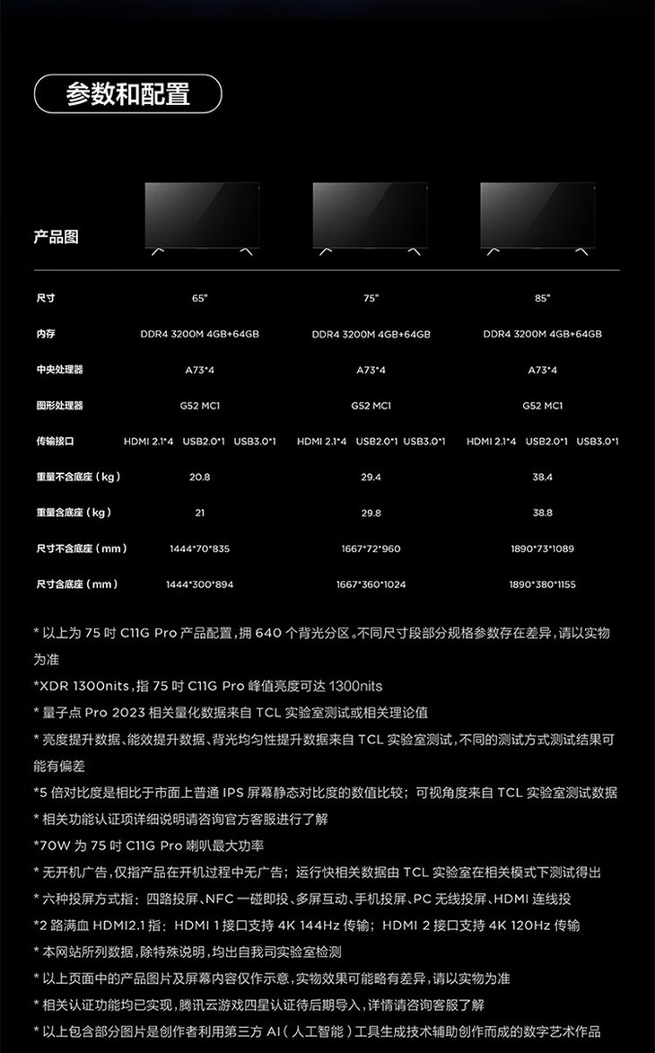 TCL电视(912600) 75C11G Pro QD-MiniLED 640分区 XDR1300nits 领曜芯片M2 全通道144Hz 安桥2.1Hi-Fi音响