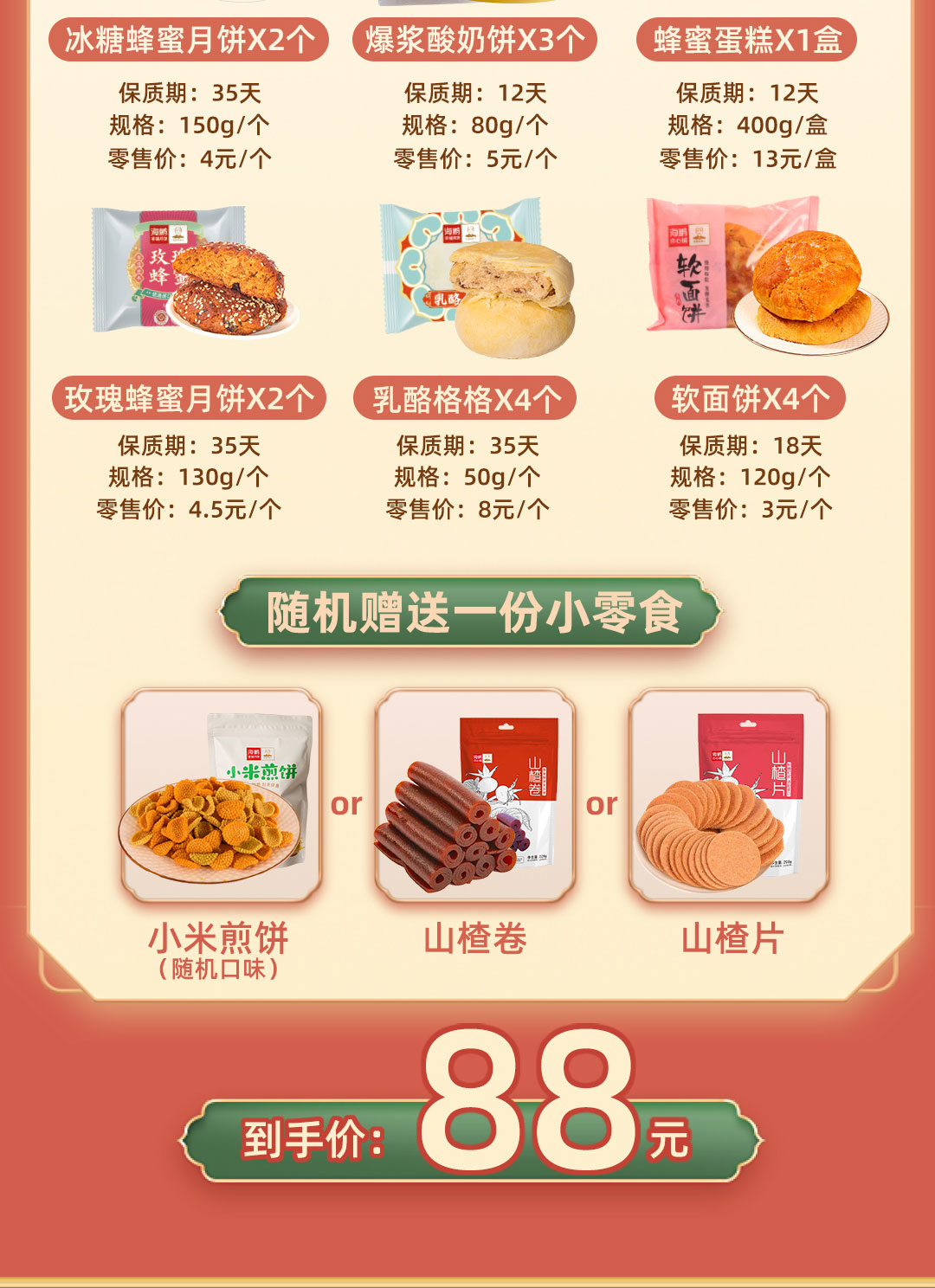 软面饼*4爆浆酸奶饼*3冰糖蜂蜜月饼*2蜂蜜蛋糕(10枚)*1玫瑰蜂蜜月饼*2乳酪格格*4随机零食*1