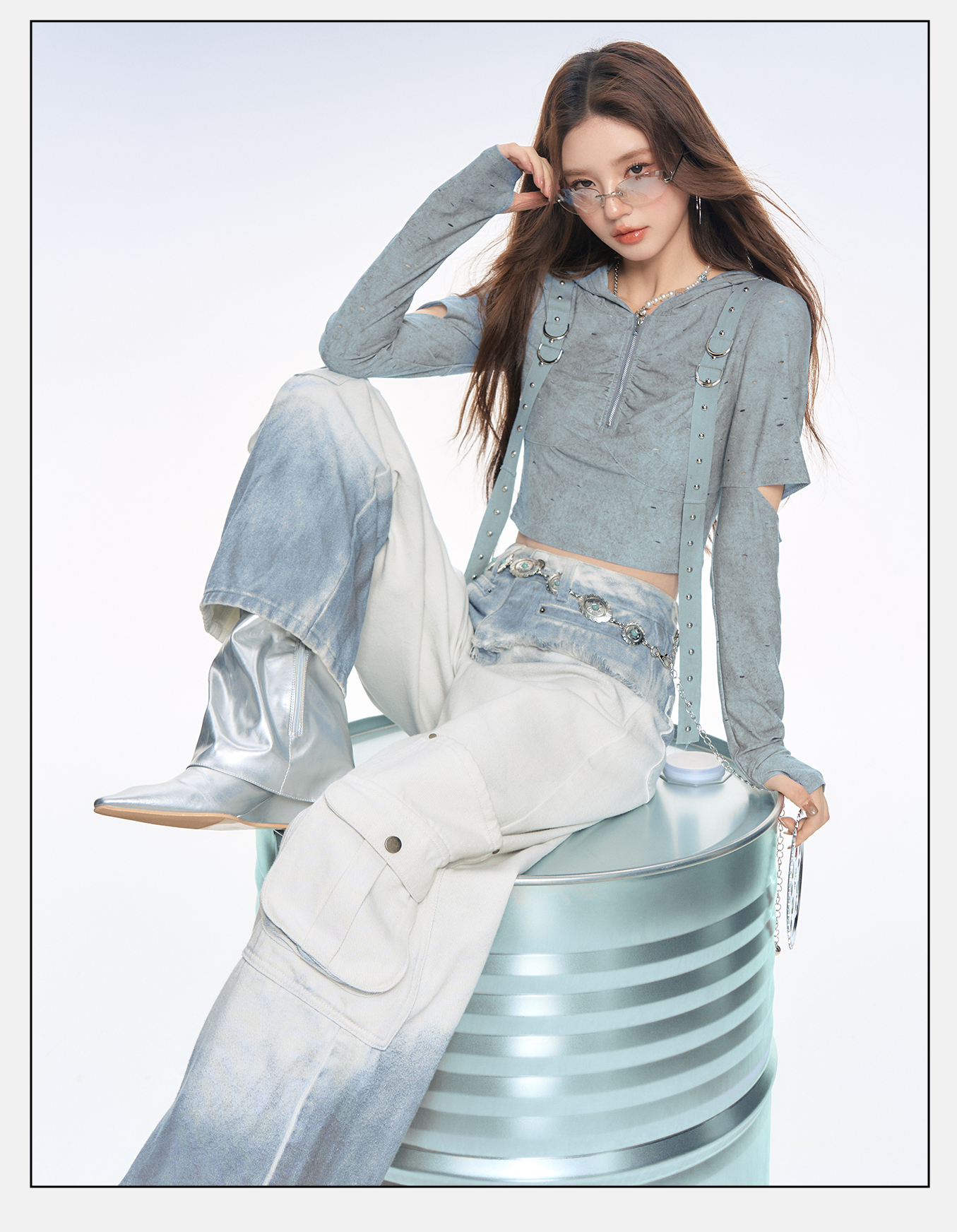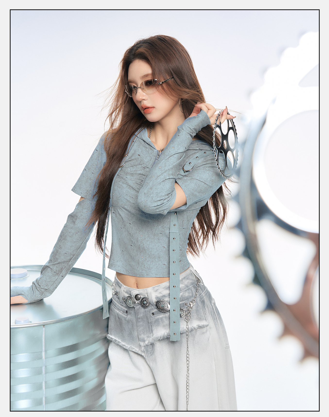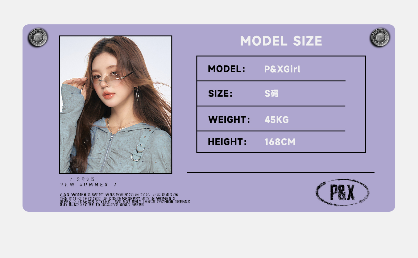P&X设计师女装2025秋季打底复古波点街头连帽T恤825302212 蓝色