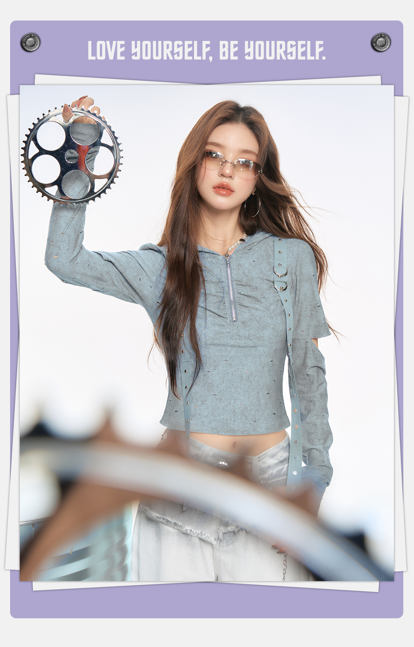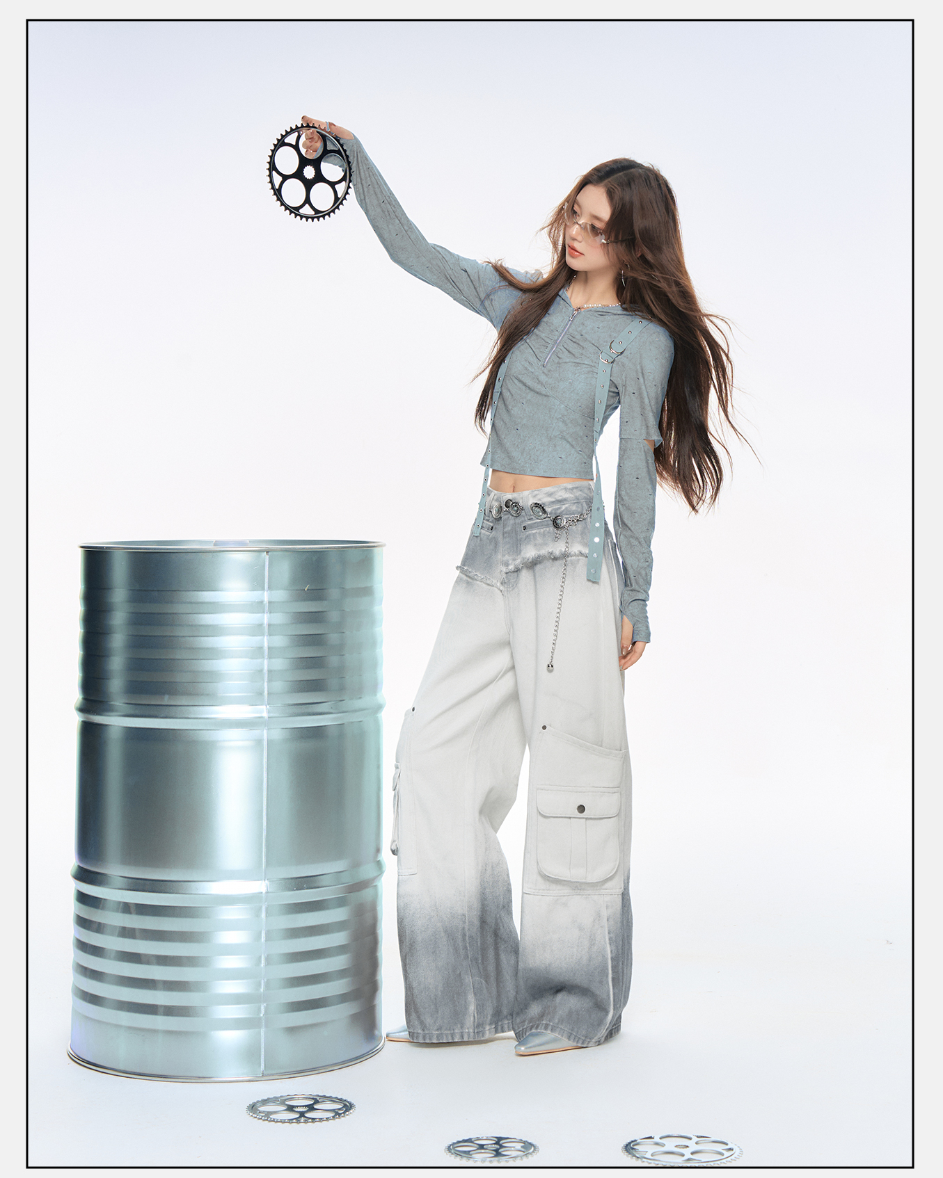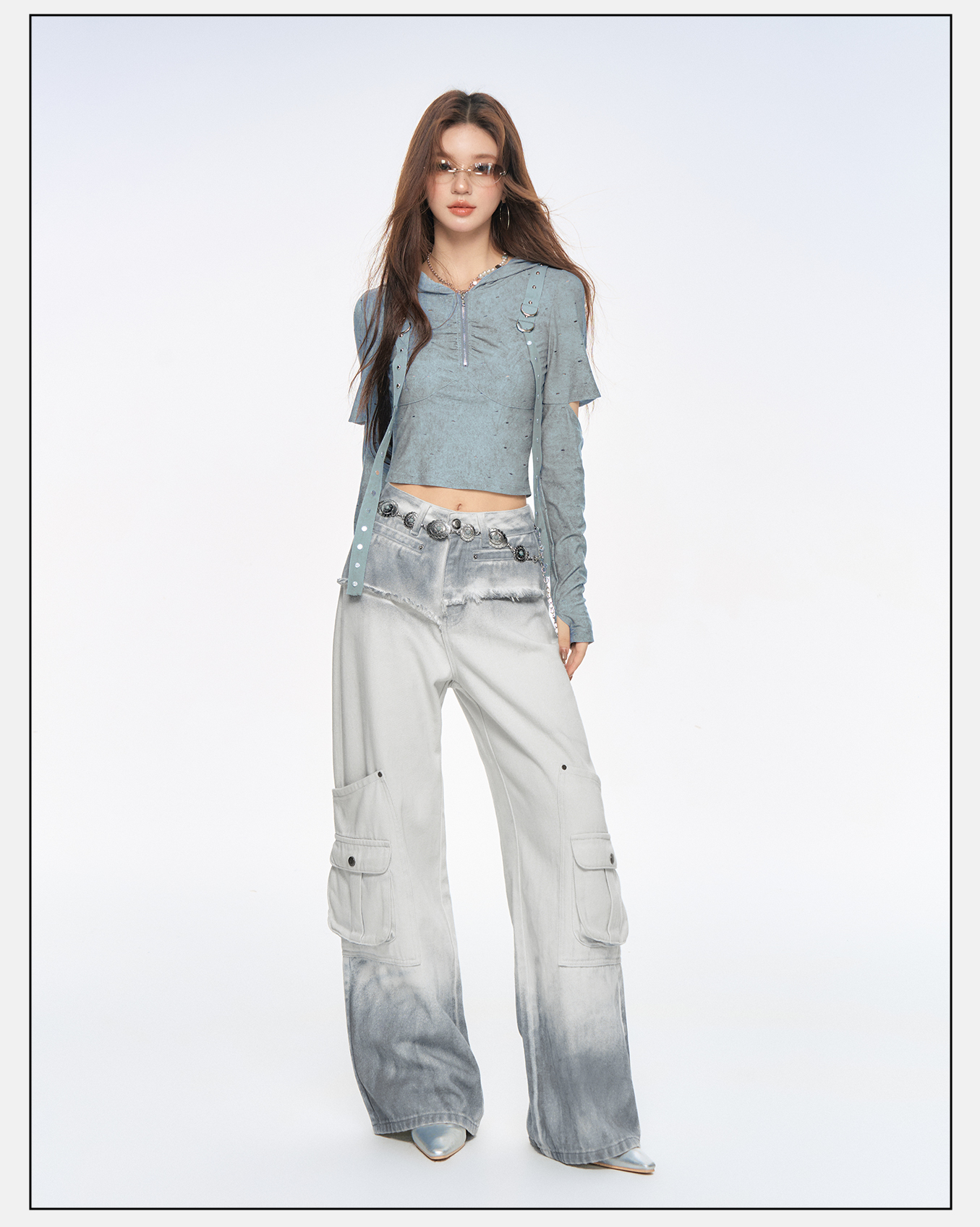 P&X设计师女装2025秋季打底复古波点街头连帽T恤825302212 蓝色