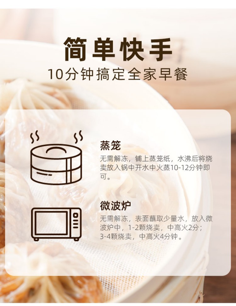 甄选原料,大肉丁、香菇丁、笋丁等,手工包制,馅含量≥80%;