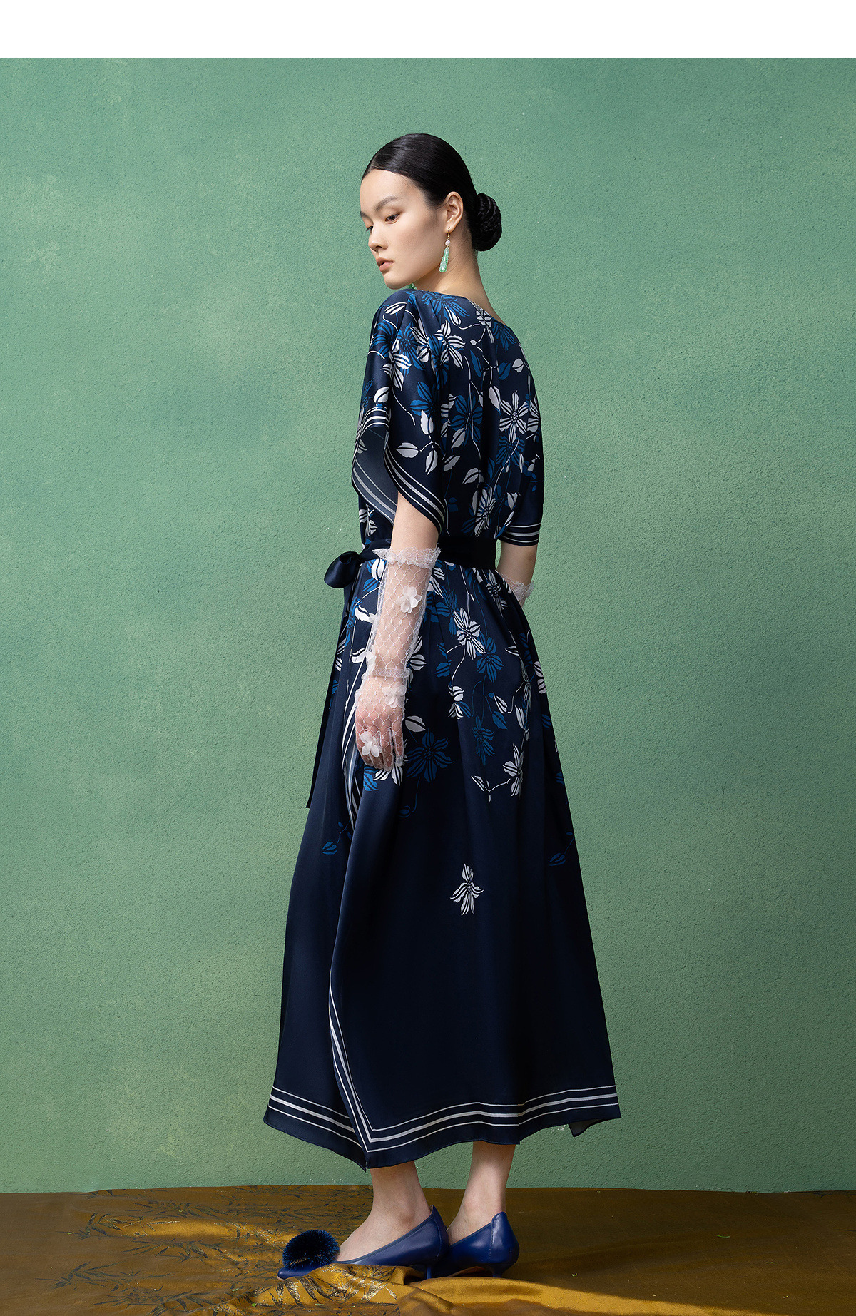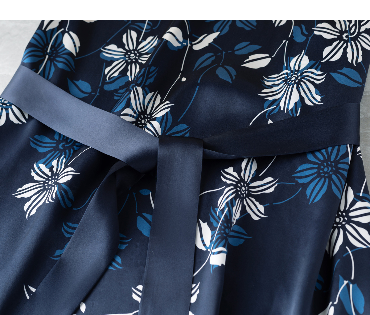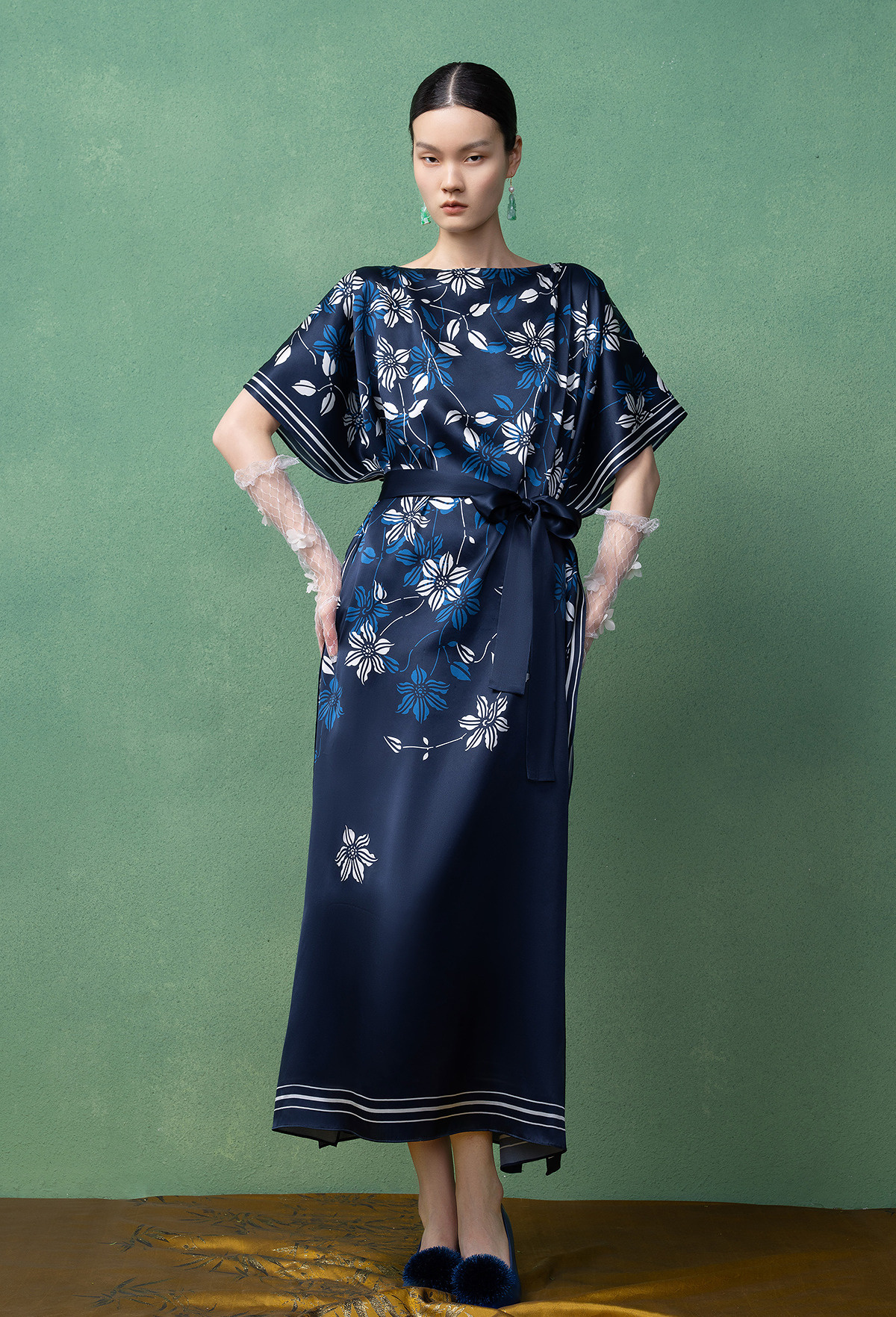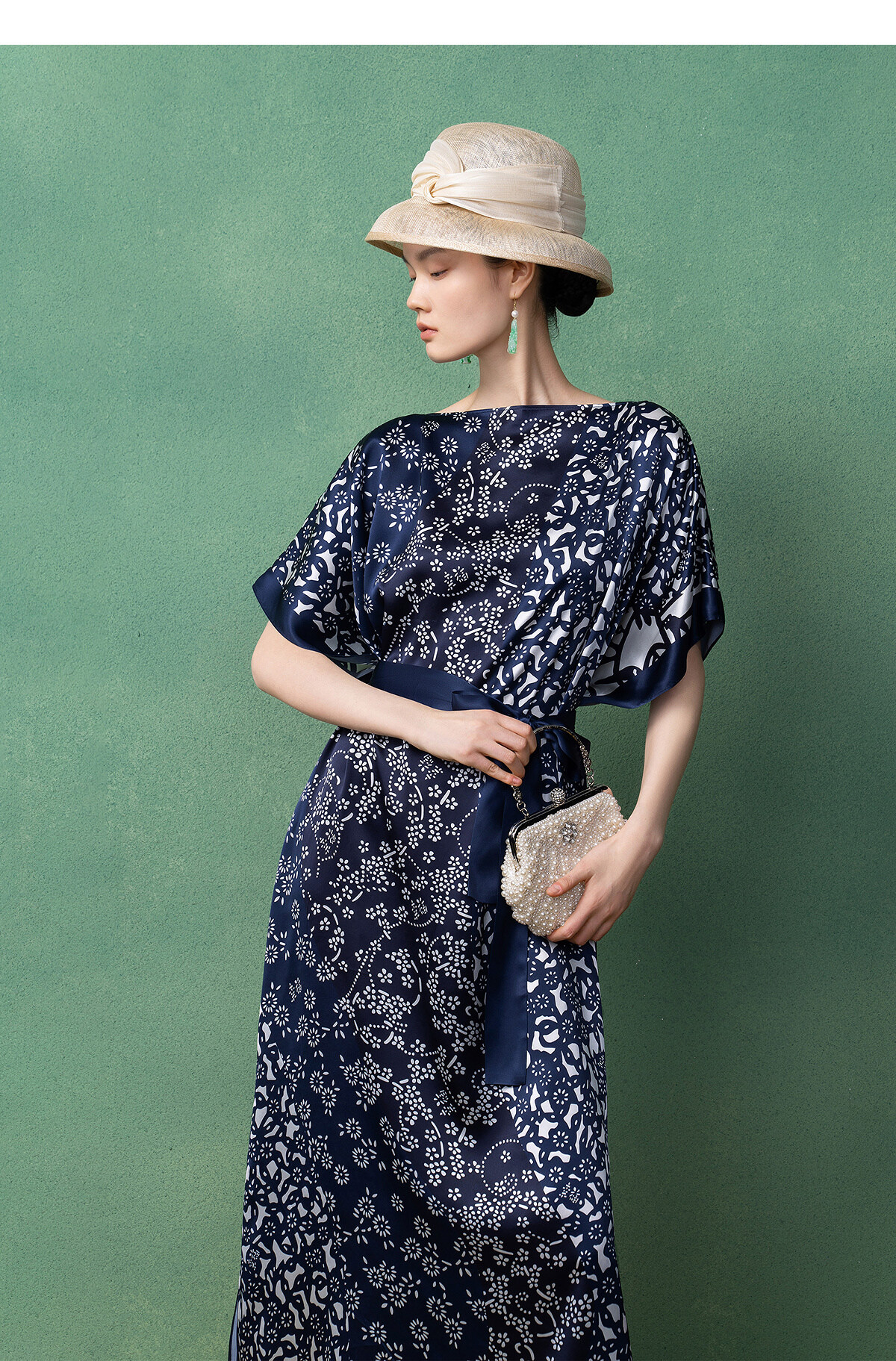 【林栖设计小店】(现货)真丝素绉缎连衣裙多色复古传统蓝印花铁线莲花纹2025春夏新品长裙女T1952348