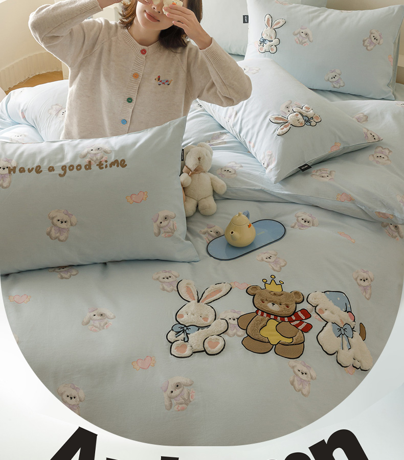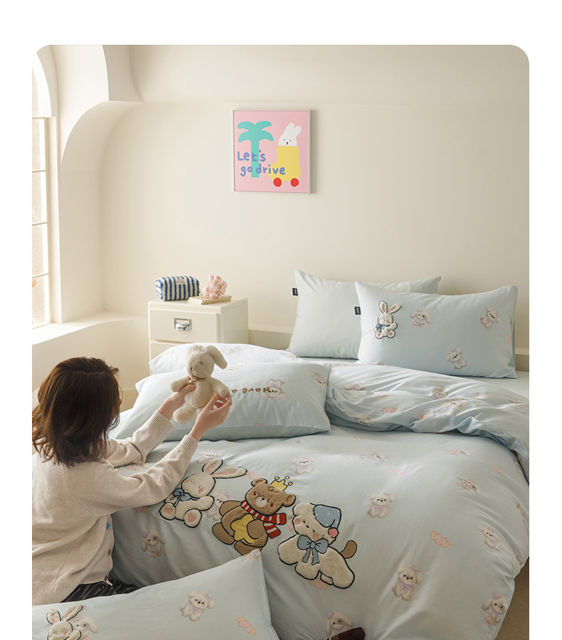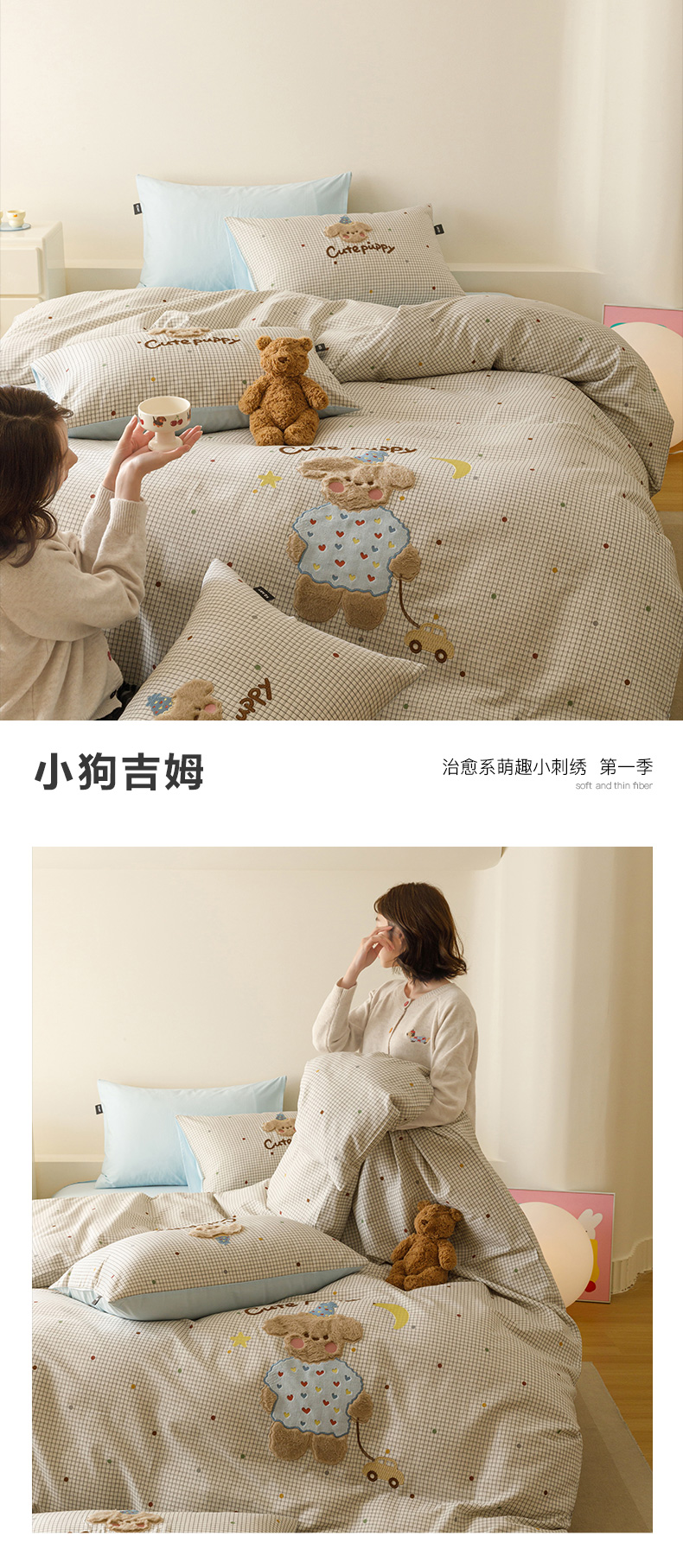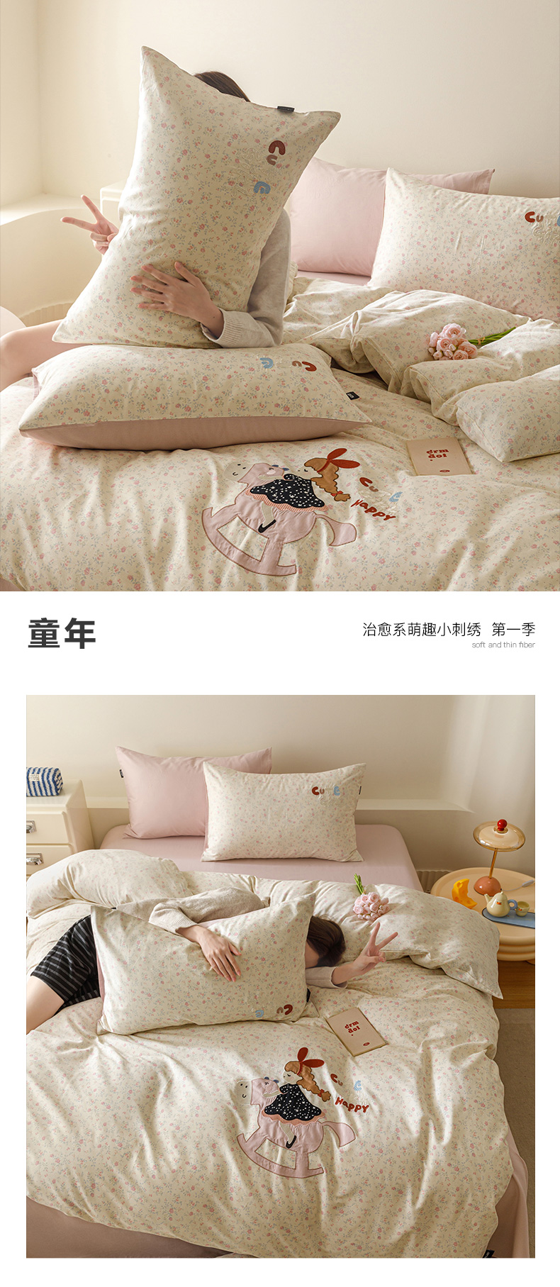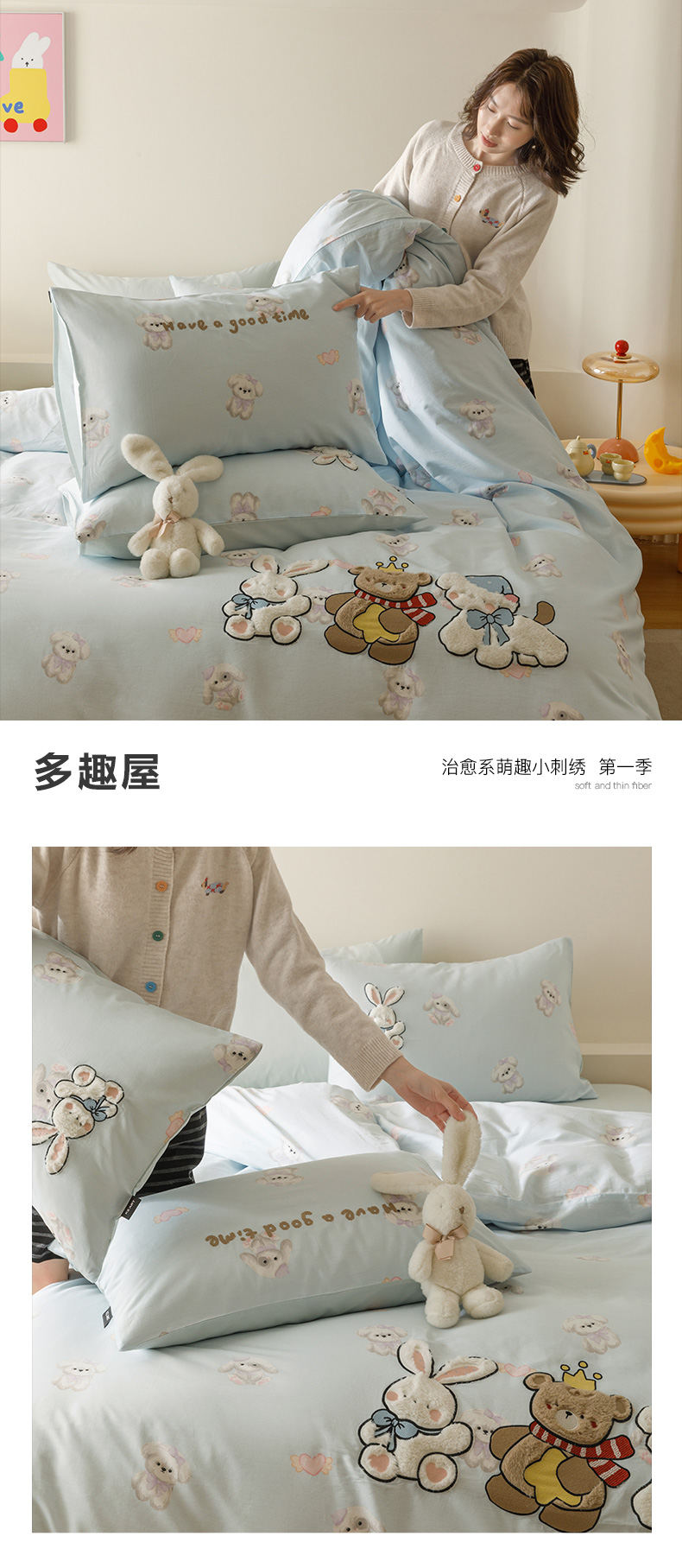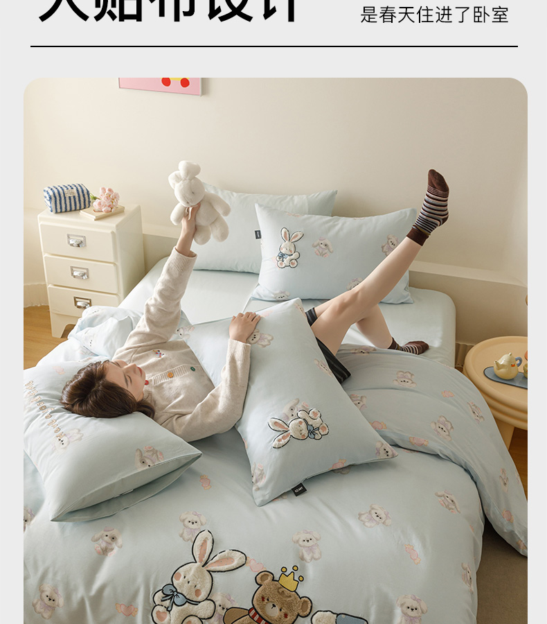 春夏呆萌小刺绣全棉四件套 柔韧透气耐磨纯棉套件
