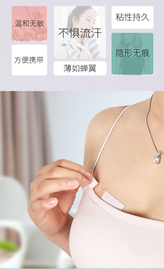 可以直接接触皮肤 呵护敏感肌肤 撕拉不伤衣物 薄薄的一层 粘贴在领口~裙摆~易走光的位置 自由活动 安心整天