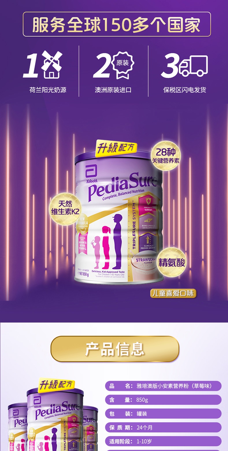 【保税】澳洲雅培PediaSure小安素奶粉 草莓口味 850g