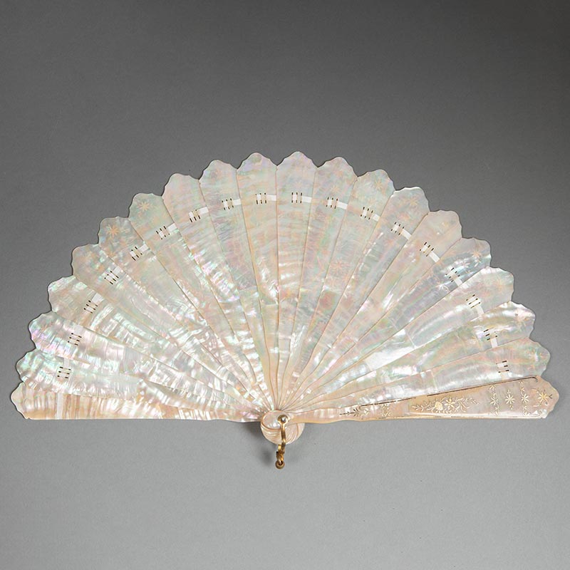 1860年代法国出品古典花卉主题手绘描金母贝精雕纯扇骨折扇