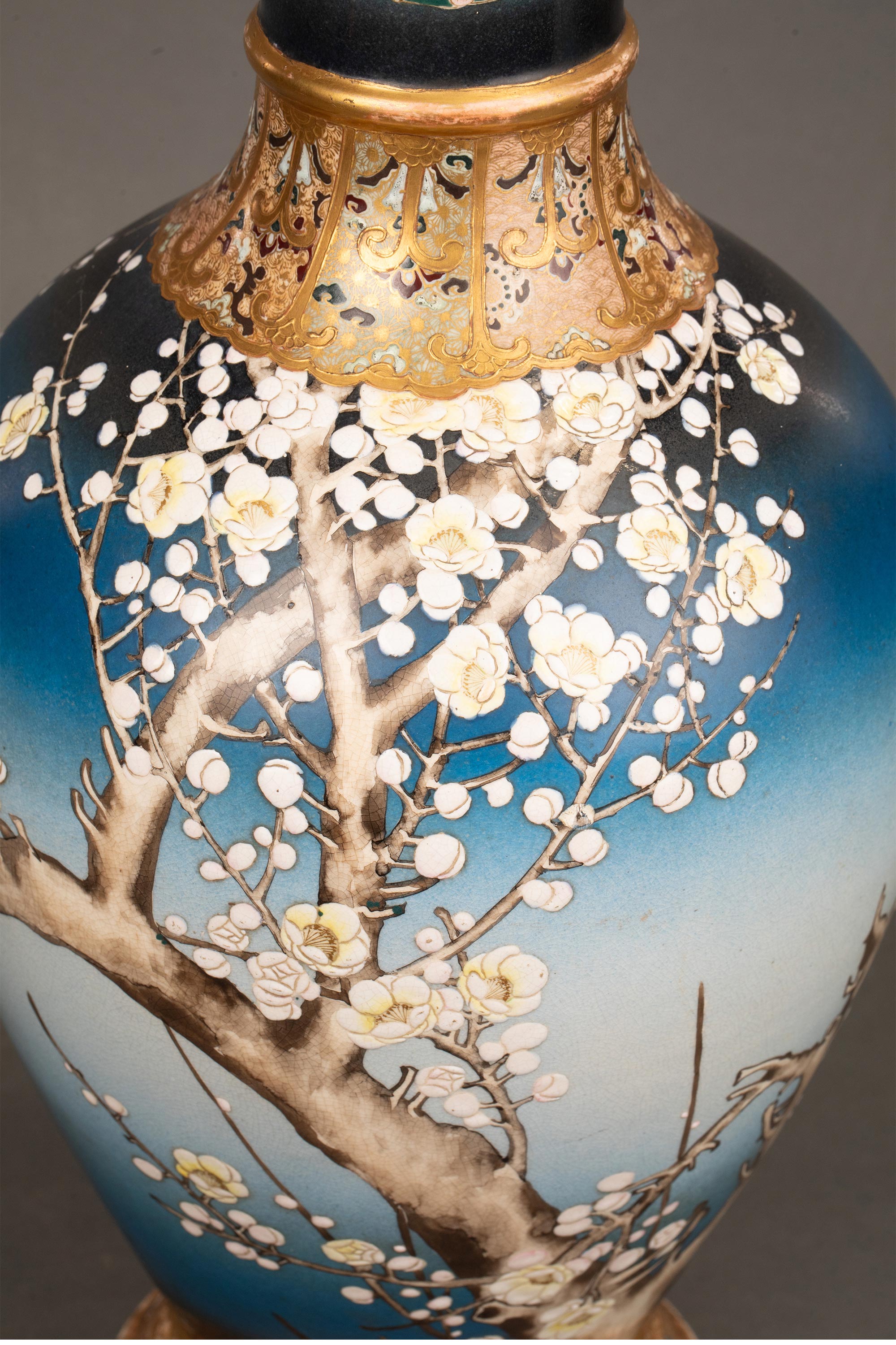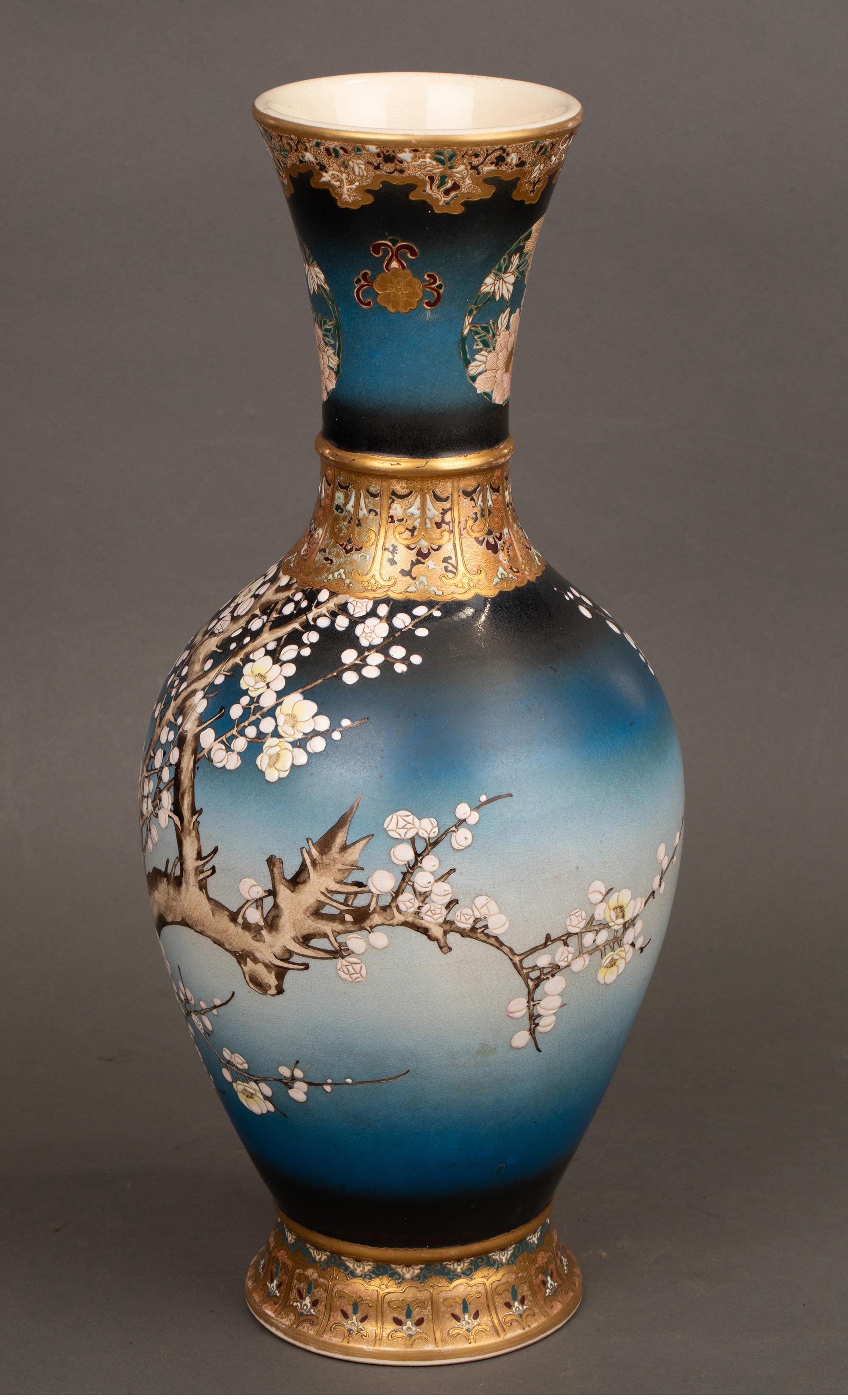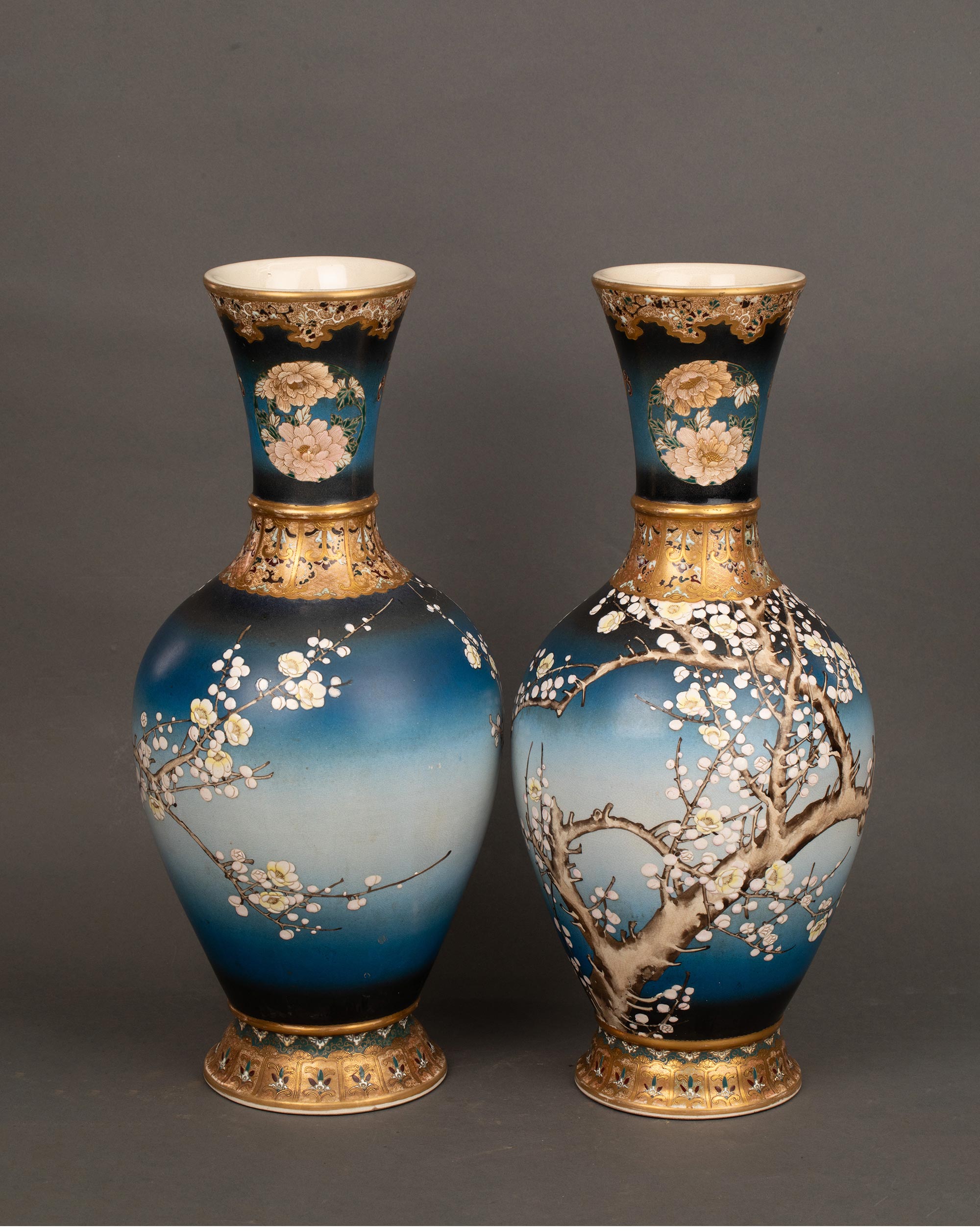 1900年代日本明治时期出品京都錦光山制款梅花牡丹纹主题蓝地描金彩绘萨摩烧花瓶一对