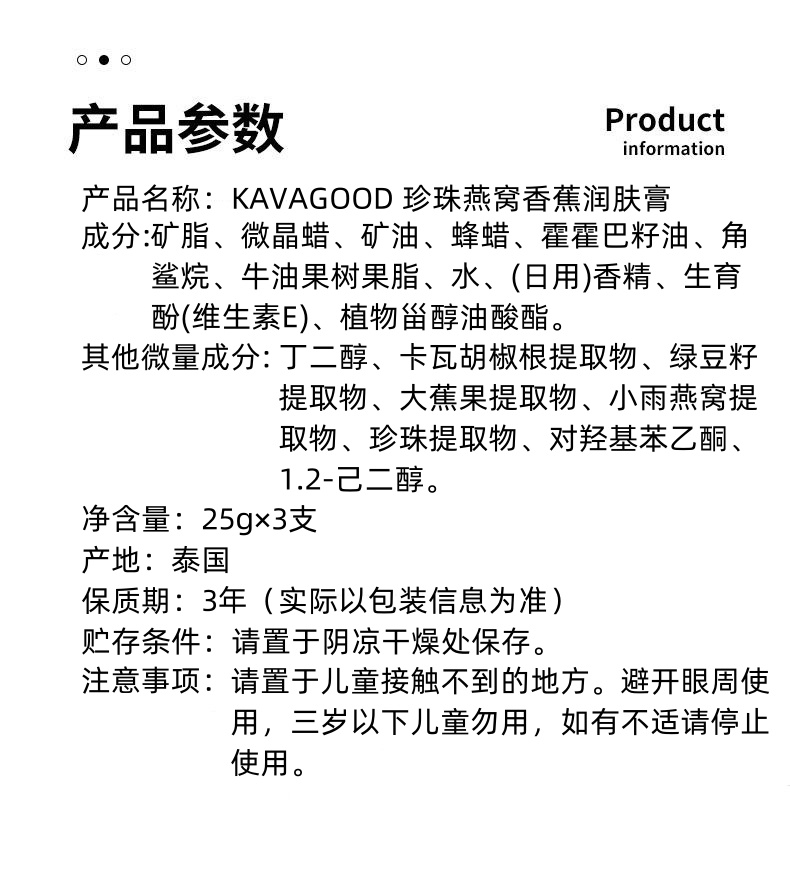 泰国进口KAVAGOOD珍珠燕窝香蕉润肤膏25g×3支